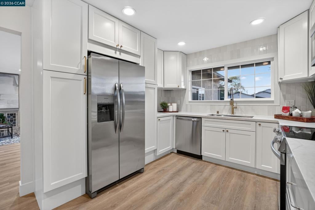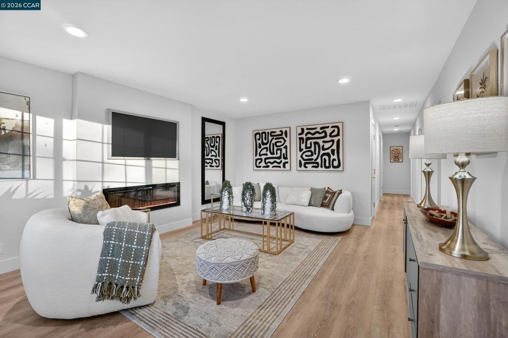 Stunning single-family home on a quaint dead-end street with a charming and inviting location!Thoughtfully designed drought-tolerant landscaping welcomes you into this updated home, where natural light fills every space. Luxury vinyl plank flooring, recessed LED lighting, designer fixtures, and expansive windows create a modern, airy feel. The updated layout includes a gourmet kitchen with quartz countertops, custom backsplash, gas range, fridge, microwave, dishwasher, eat-in nook, and ample pantry space. Separate living and family rooms offer versatile spaces, with the living room showcasing a show-stopping fireplace wall. Spacious, updated bathrooms and abundant storage throughout. Enjoy a park-like backyard perfect for relaxing or entertaining. Zoned for great schools (buyer to verify) and right around the corner from Silverwood Elementary, parks, shopping, and restaurants.