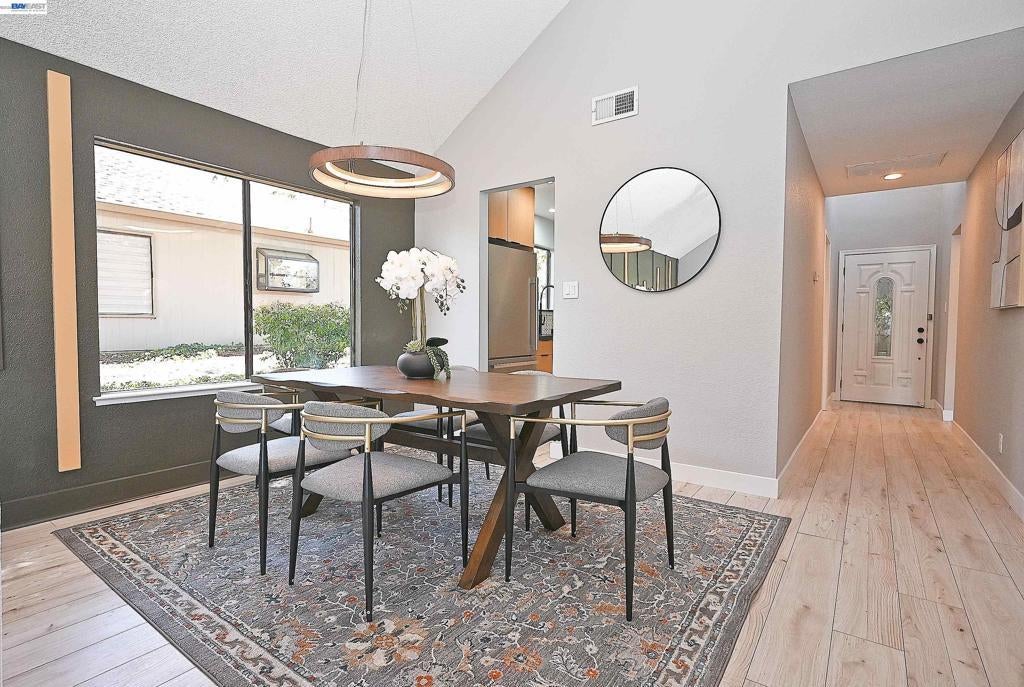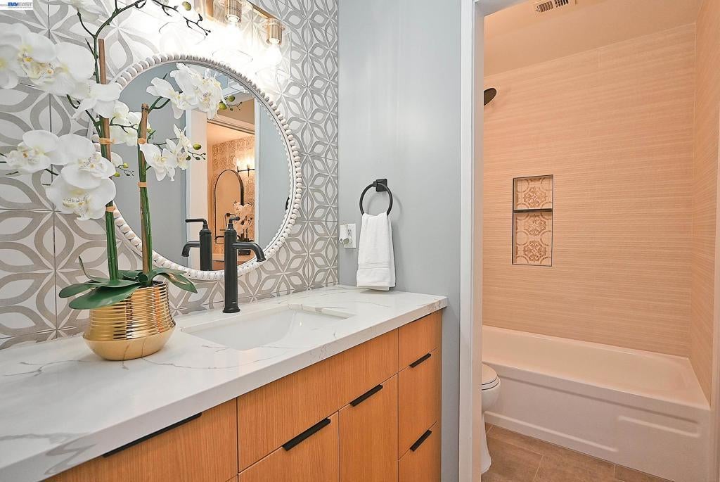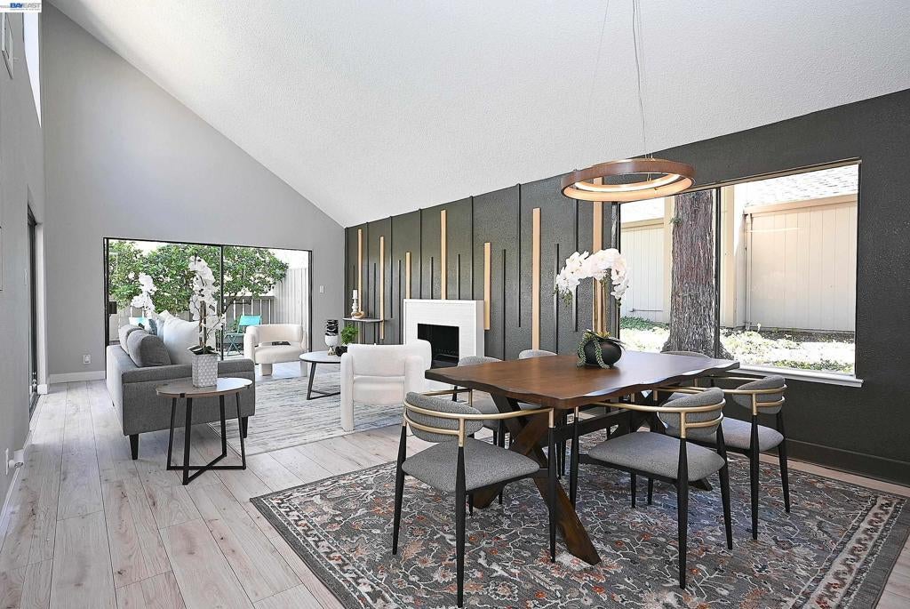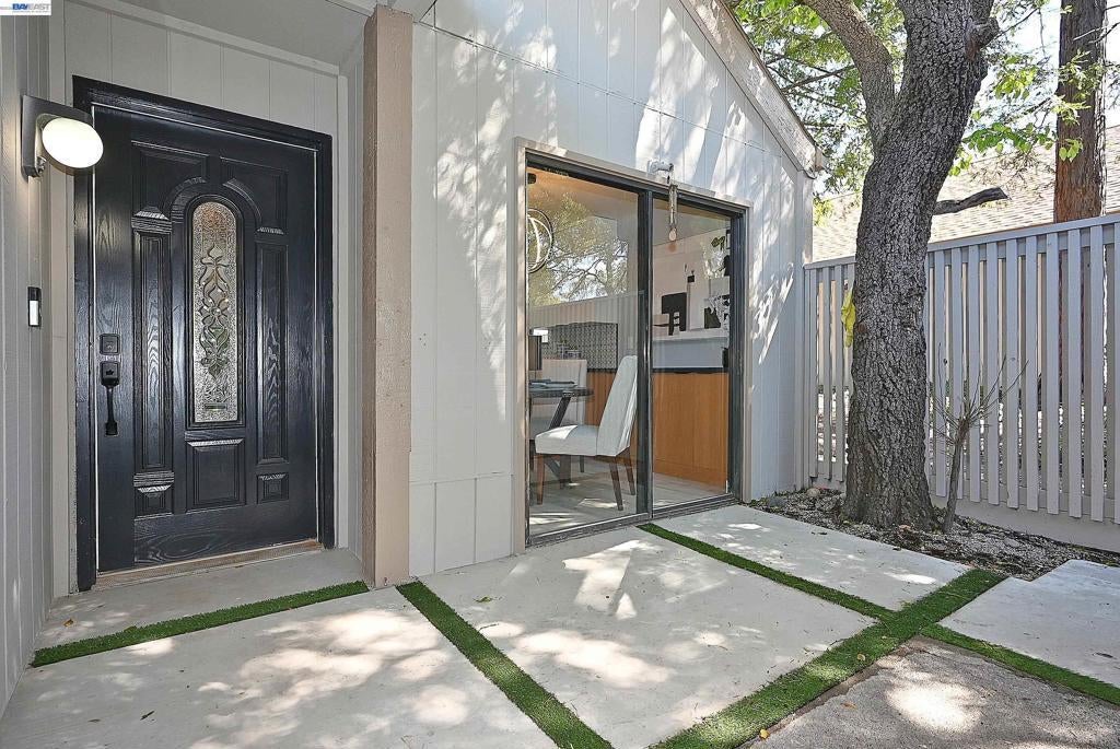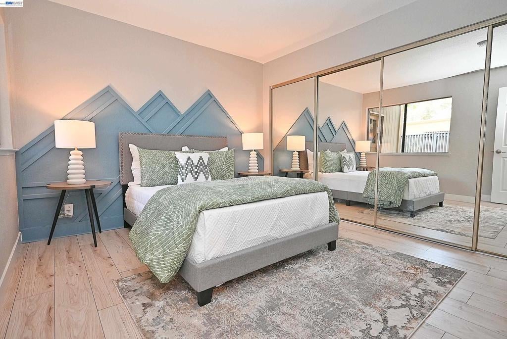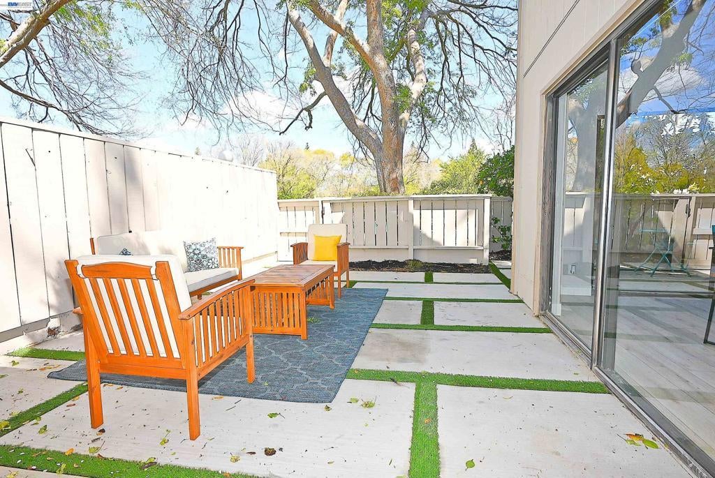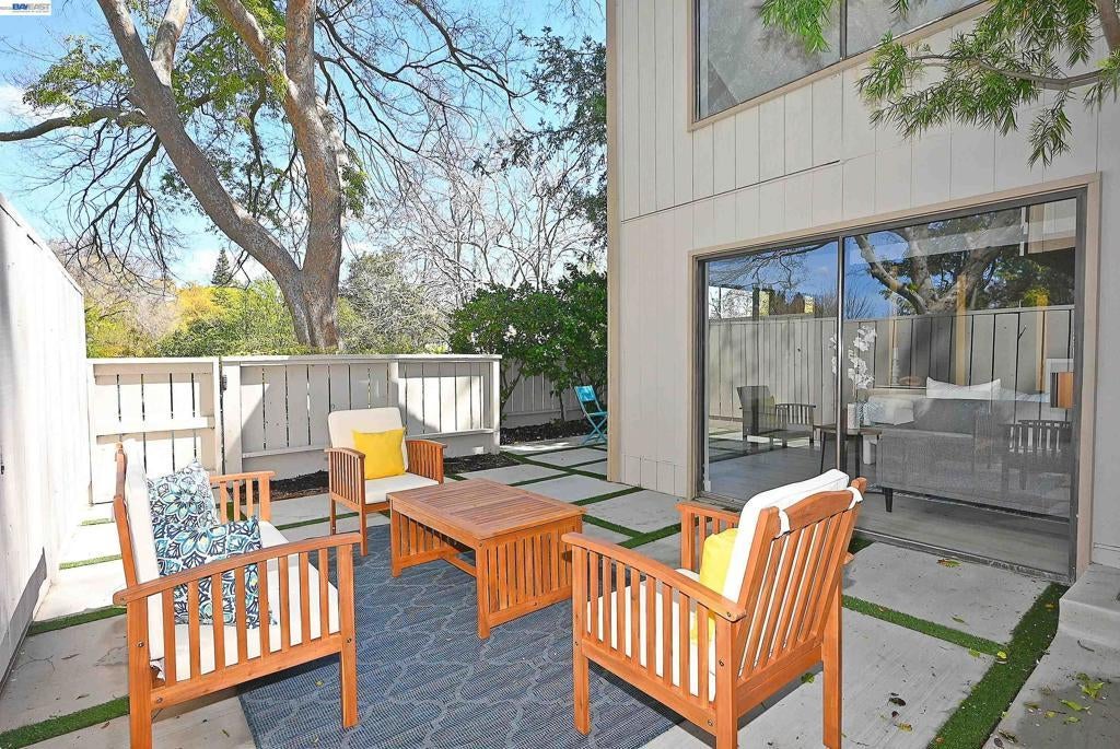 Located in the heart of Pleasanton, this beautifully updated 2-bedroom, 1-bath townhouse offers style and convenience just minutes from Stoneridge Shopping Center, BART, and major freeways. Open-concept layout with a striking accent wall, tile fireplace, and oversized patio doors leading to a private patio with new concrete and turf ideal for indoor-outdoor living. Upgraded kitchen features stainless steel appliances, dual-tone Scandinavian cabinetry extending into the nook, and custom tile finishes. Both bedrooms include accent walls. Jack-and-Jill bathroom offers designer tile throughout, Scandinavian oak cabinetry, updated plumbing fixtures, and dual vanity for the primary suite. Additional features include waterproof laminate flooring, fresh interior paint, and updated lighting. HOA amenities include pool, tennis/pickleball courts, and clubhouse.