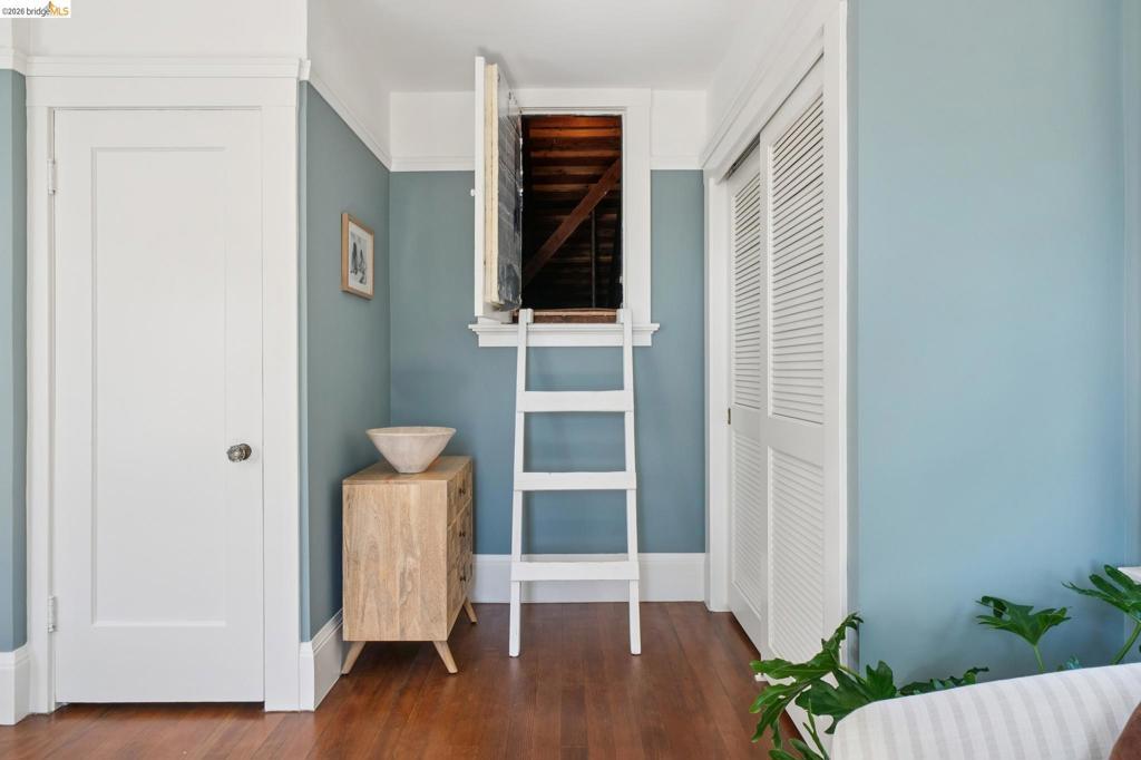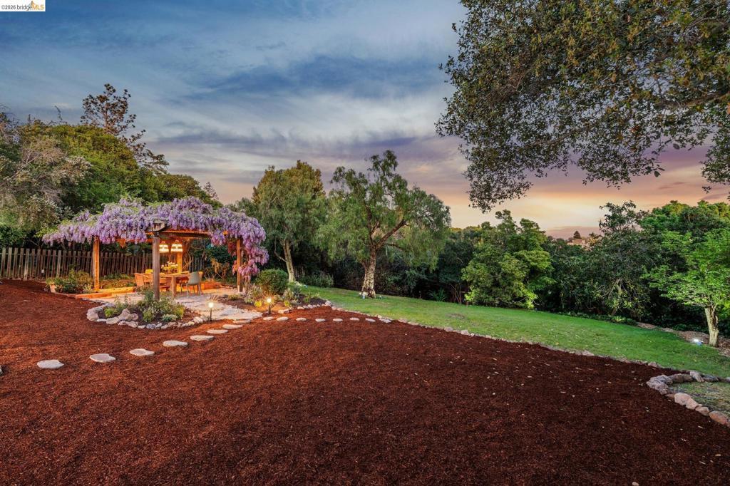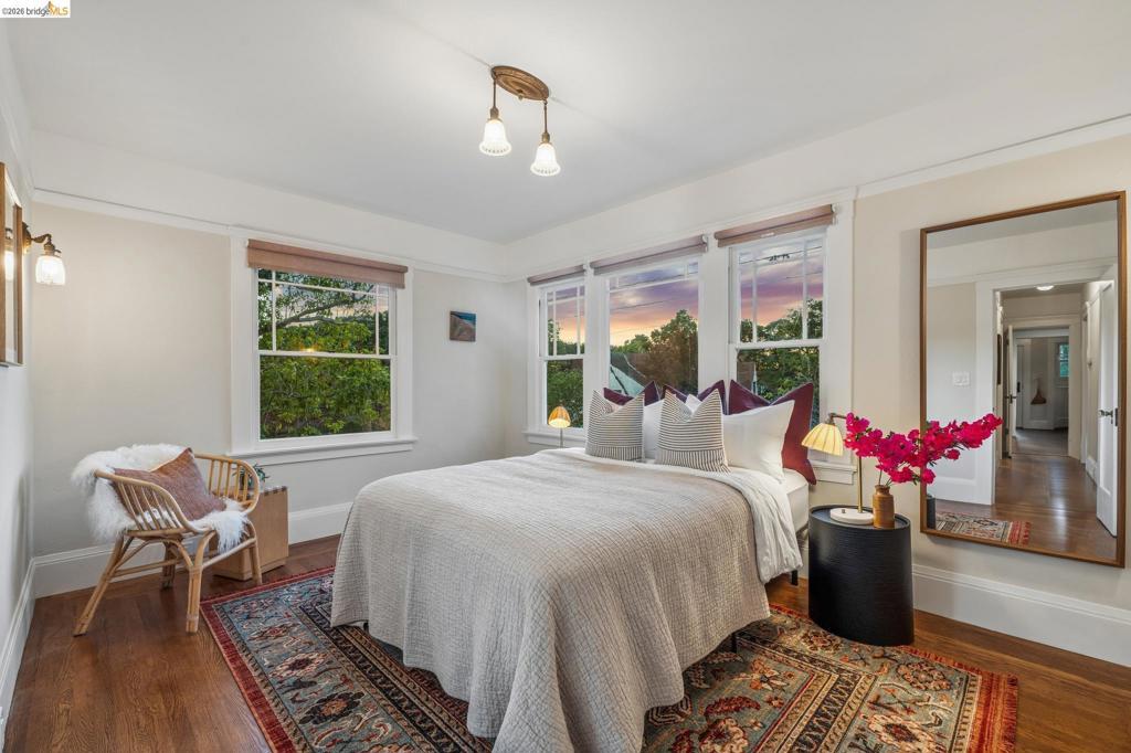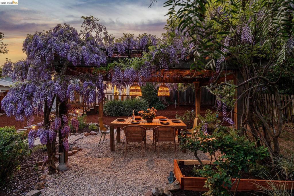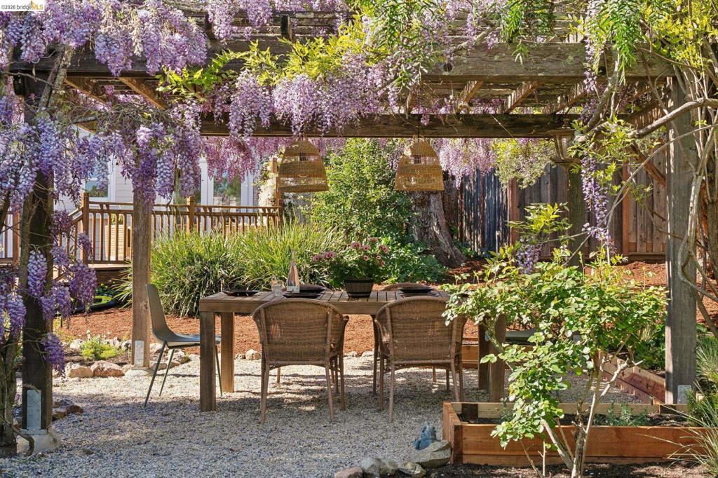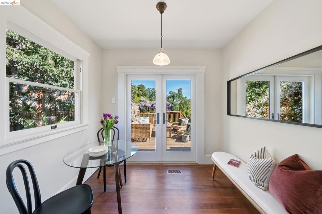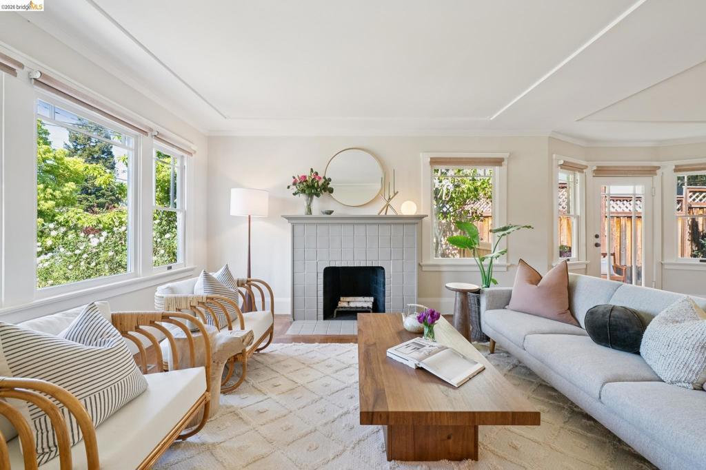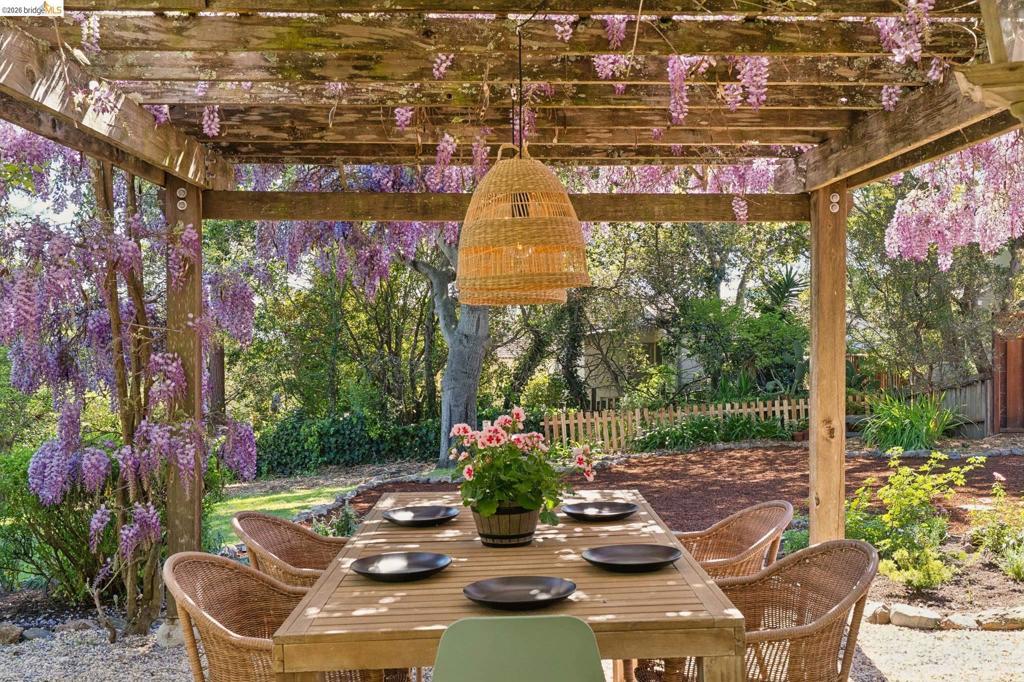 Unicorn Alert! Sweet California Bungalow is ultimate find in hidden gem Upper Dimond neighborhood. 1920s character w/ lovely kitchen & bath thoughtfully refreshed for modern living. Fluid & open, the floor plan spills naturally onto an expansive rear deck & flared double wide tree-lined backyard on generous .26-acre lot. Charming details: trayed ceilings, tile fireplace, refinished hardwood & softwood floor, w/ well preserved original hardware & lighting. Thoughtful kitchen updated w/ new soapstone countertops, appliances, hardware, & tile backsplash, blending designer-painted cabinetry, built-in hutch & wainscotting. Refreshed bath features new tile, vanity, plumbing, & wainscoting, plus storage. Living & dining rooms lead through kitchen to light-filled breakfast nook w/ French doors opening to large rear deck. Sprawling tree-lined yard is dreamy retreat w/ wisteria arbor & professional landscaping touches. 2 bed & updated bath on main level. Private 3rd bed is above garage w/ dual closets & peekaboo Bay/Hills views. Perfect for future primary suite. Home is well-equipped: updated wiring throughout, laundry room off kitchen w/ side-by-side W/D, attached garage, attic storage, insulated ceiling, forced air heat. Steps to Farmer Joes, Peets, Dimond Park. EZ access to 13/580.