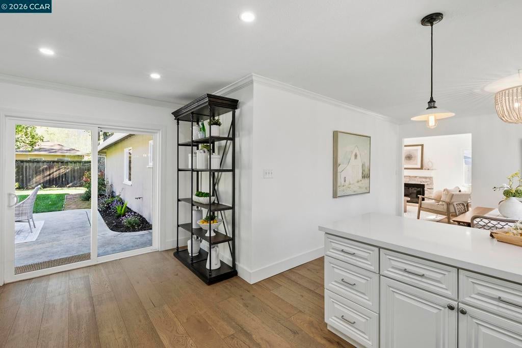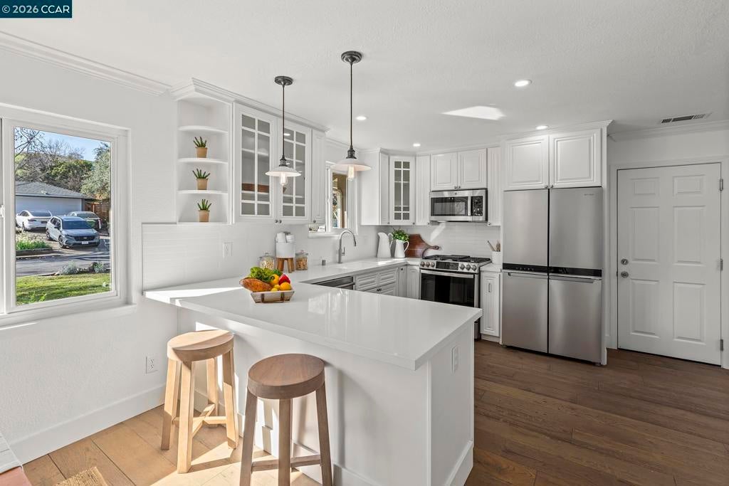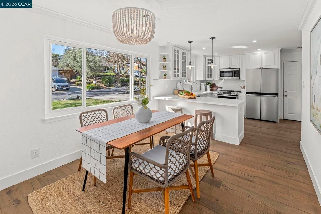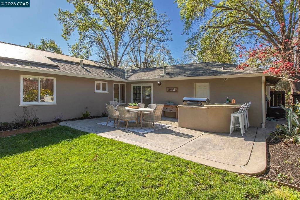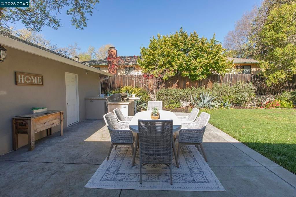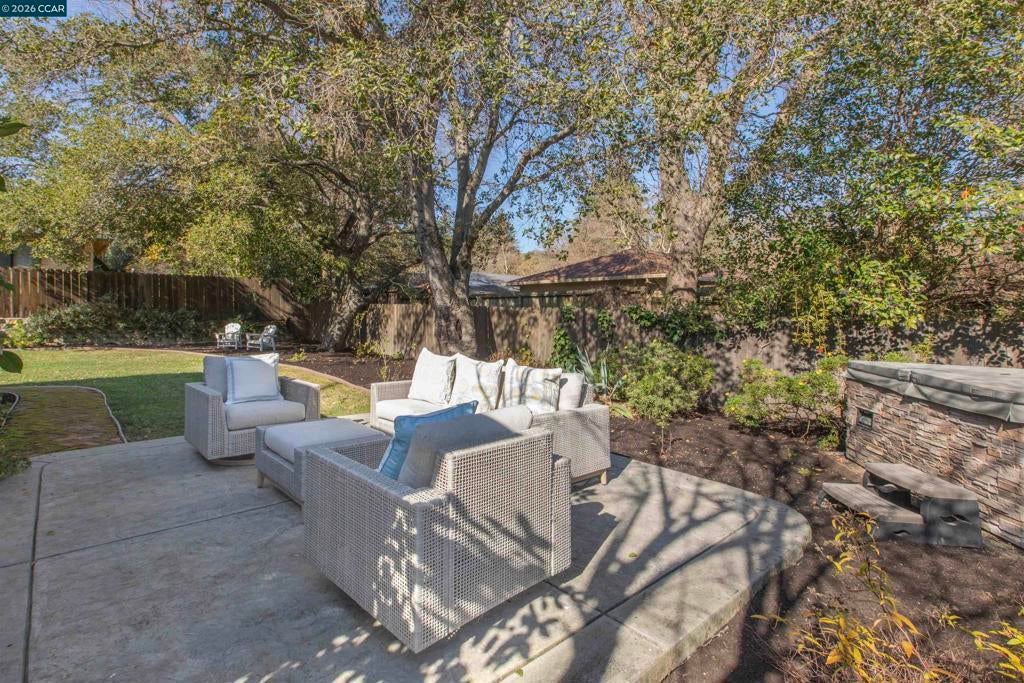 Just steps from the popular Lafayette/Moraga Trail, this updated single-story home with a flexible floor plan is an ideal blend of charm and modern convenience. The interior features three bedrooms, plus a flexible bonus room that is an ideal media room, home office, or fourth bedroom, two bathrooms, and stylish, wide-plank oak hardwood floors throughout. The kitchen serves as the heart of this residence, showcasing sleek quartz countertops and stainless steel appliances while flowing effortlessly into the dining area and outdoor space. Natural light pours into the living room through expansive windows, where a cozy fireplace acts as a central focal point. In the primary suite, comfort meets luxury. This true retreat includes double closets, a spa-inspired ensuite bathroom with a twin vanity and oversized shower, and a door leading directly to the backyard patio and hot tub. The exterior is a year-round haven featuring a level lawn, vibrant gardens, a built-in BBQ, and two separate patios perfect for gatherings. Situated in popular Lafayette Estates, the home is surrounded by peaceful, tree-lined streets and is just minutes from the Lafayette Community Center, Community Park, and top rated Burton Valley Elementary.