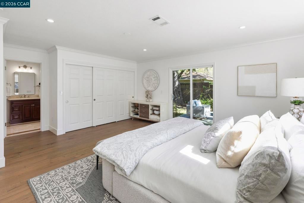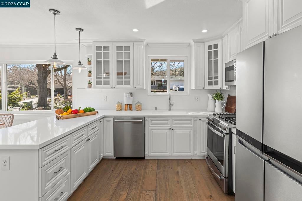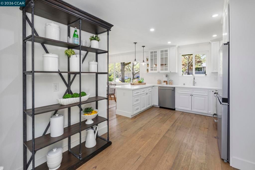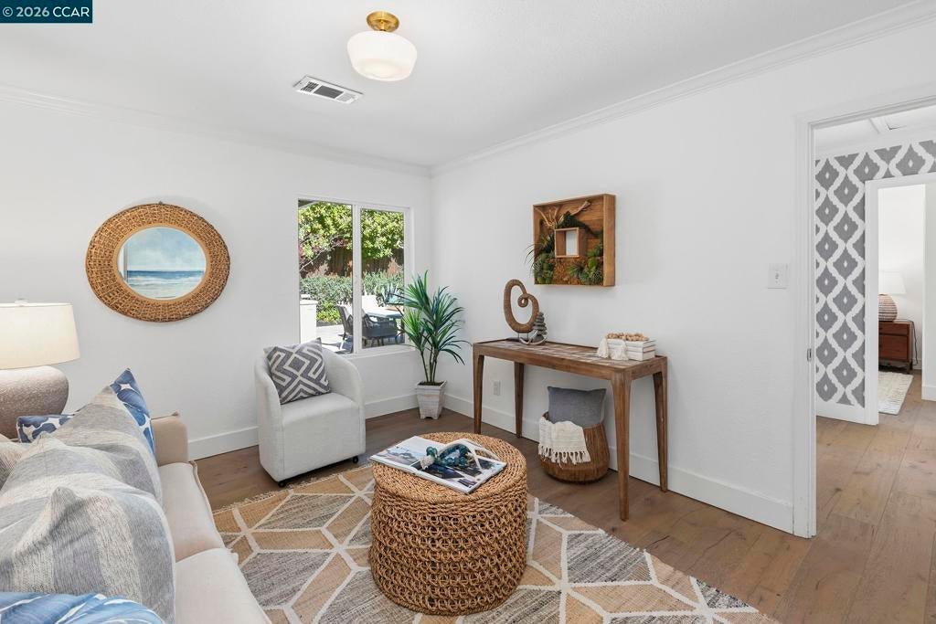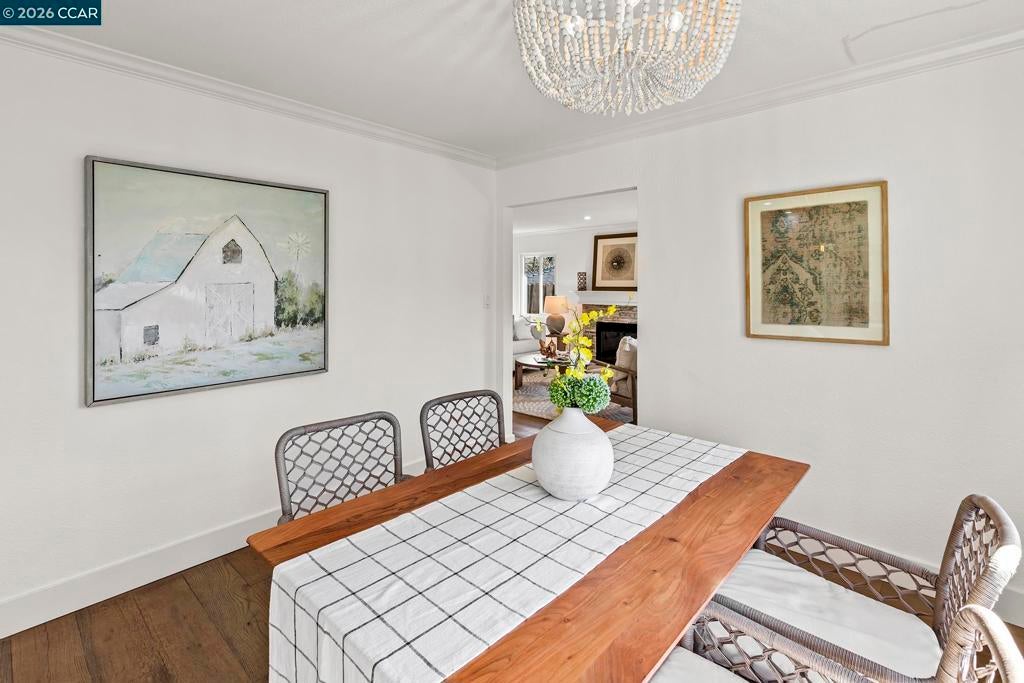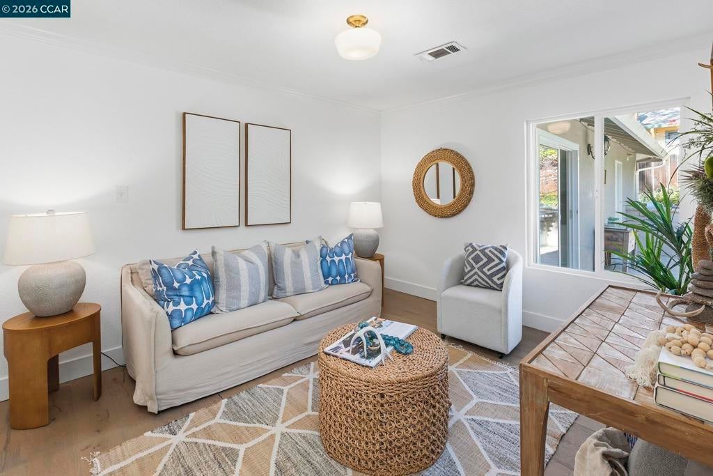Just steps from the popular Lafayette/Moraga Trail, this updated single-story home with a flexible floor plan is an ideal blend of charm and modern convenience. The interior features three bedrooms, plus a flexible bonus room that is an ideal media room, home office, or fourth bedroom, two bathrooms, and stylish, wide-plank oak hardwood floors throughout. The kitchen serves as the heart of this residence, showcasing sleek quartz countertops and stainless steel appliances while flowing effortlessly into the dining area and outdoor space. Natural light pours into the living room through expansive windows, where a cozy fireplace acts as a central focal point. In the primary suite, comfort meets luxury. This true retreat includes double closets, a spa-inspired ensuite bathroom with a twin vanity and oversized shower, and a door leading directly to the backyard patio and hot tub. The exterior is a year-round haven featuring a level lawn, vibrant gardens, a built-in BBQ, and two separate patios perfect for gatherings. Situated in popular Lafayette Estates, the home is surrounded by peaceful, tree-lined streets and is just minutes from the Lafayette Community Center, Community Park, and top rated Burton Valley Elementary.