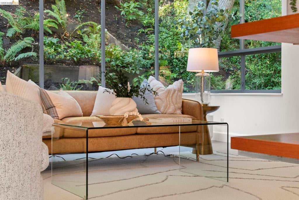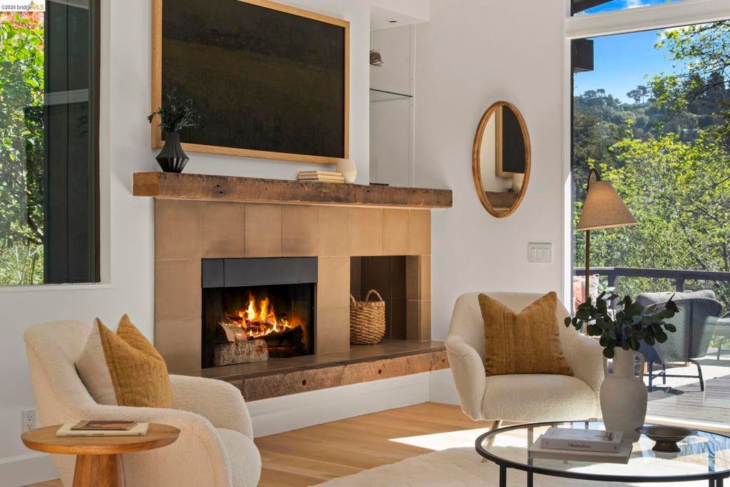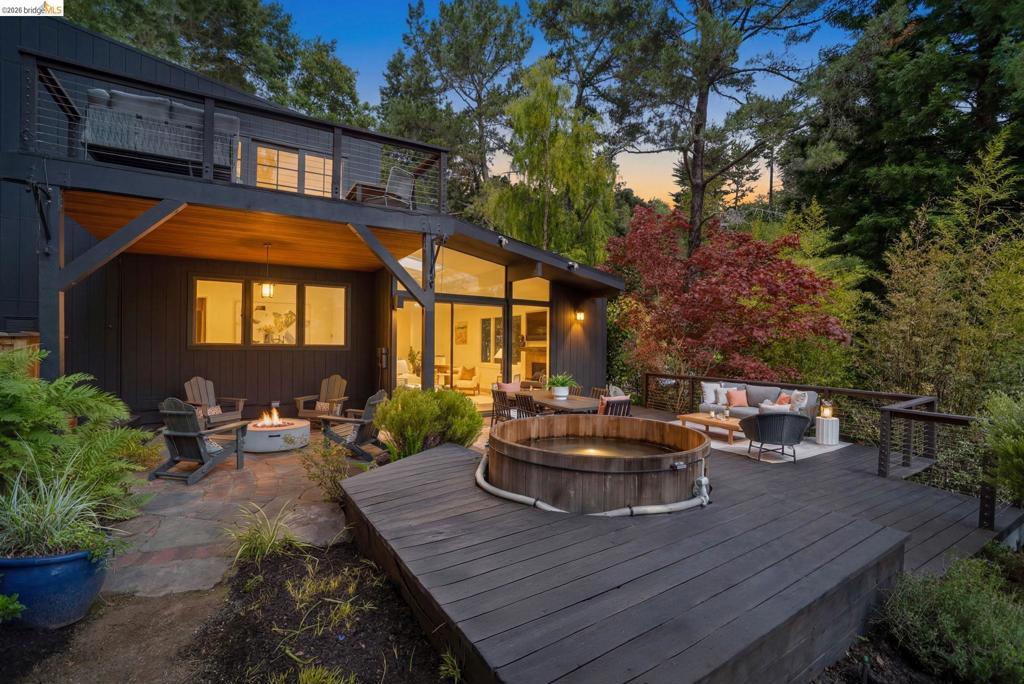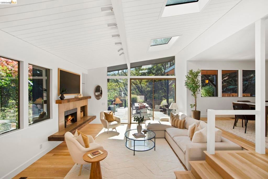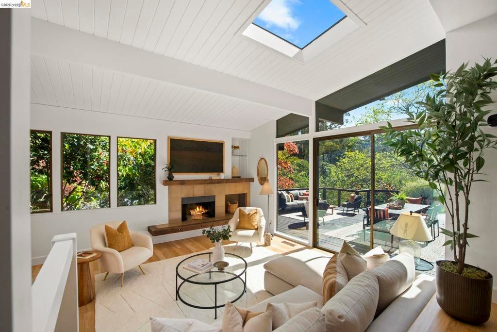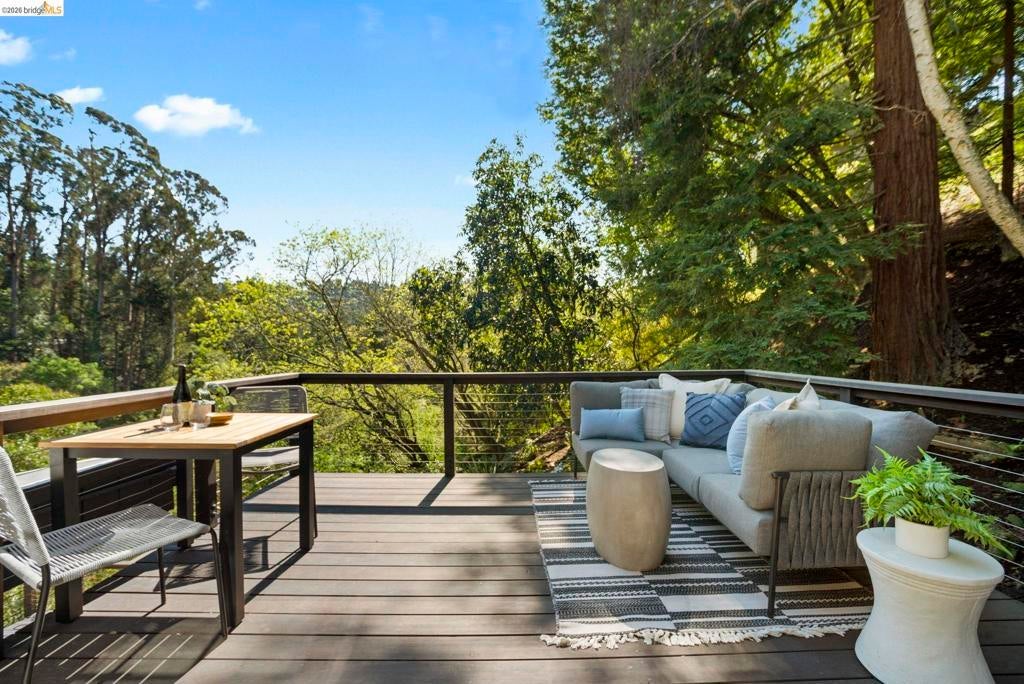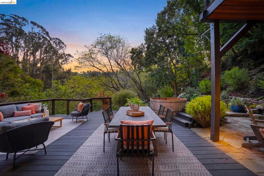 Wooded Montclair Hills Retreat on Private Road. Set on over 1/3 acre along a private road, this distinctive Oakland Hills residence offers exceptional privacy w/flowering trees, lush native plantings, mature wooded grounds & a relaxed Big Sur atmosphere rarely found this close to the city. The main level is anchored by a den w/dramatic corner wall of glass offering uninterrupted views into the surrounding tree canopy. The adjacent chef's kitchen features maple floors, a large center island w/custom hardwood top, stone countertops, stainless steel appliances & pendant lighting, w/a natural flow toward the den ideal for entertaining. A dining room connects to a sunken living room w/its own fireplace & slider doors opening onto rear gardens & spacious decks w/a Japanese-style wood hot tub & elevated forested views. Upstairs, the primary suite includes a refreshed bath & private deck, w/two additional bedrooms w/forested outlooks & a refreshed hall bath completing the upper level. A pergola-beamed two-car garage w/direct interior access & a classic Airstream ideal as a home office complete the grounds. Backup generator & EV charger included. Minutes from Montclair Village shops & restaurants & nearby railroad trail, access & Highway 13. Open Saturday & Sunday, come fall in love!