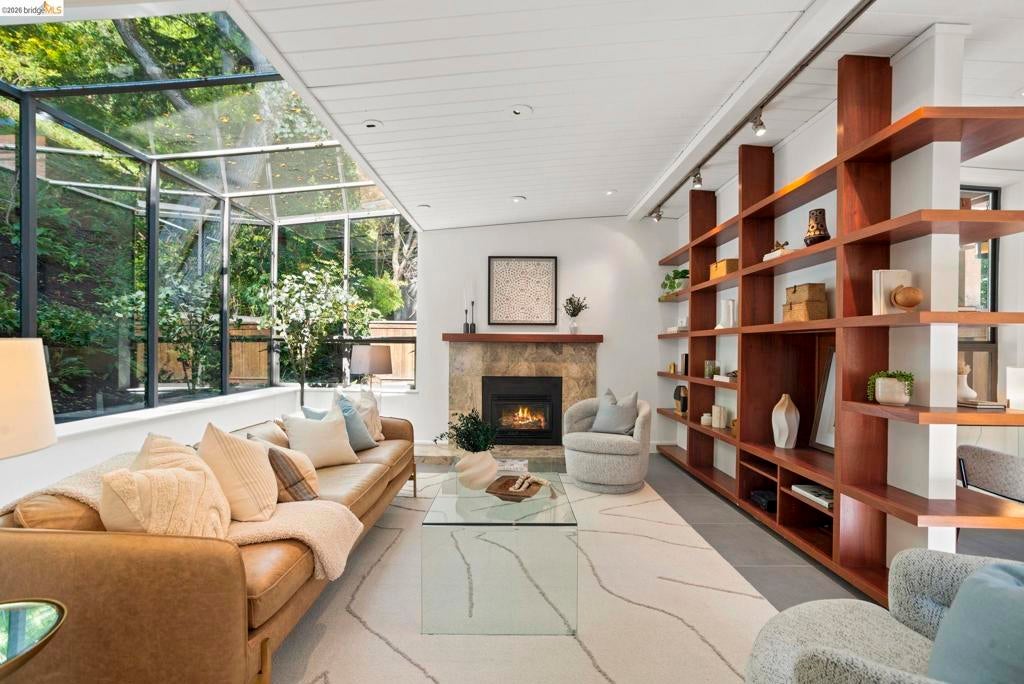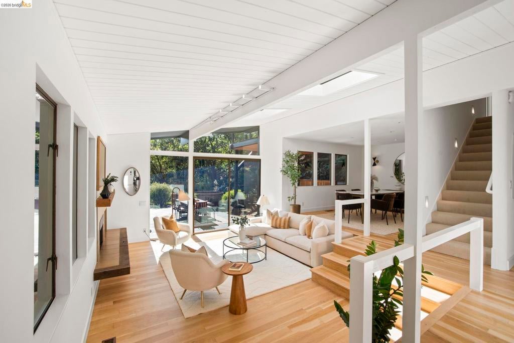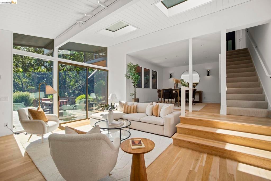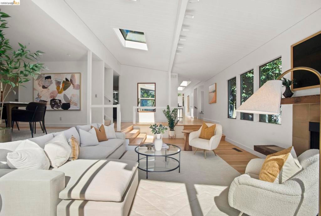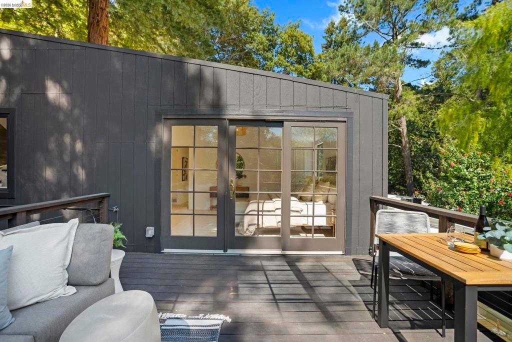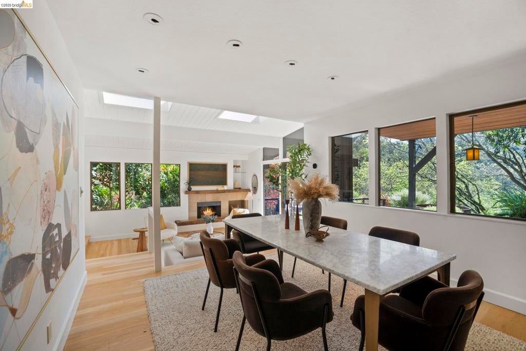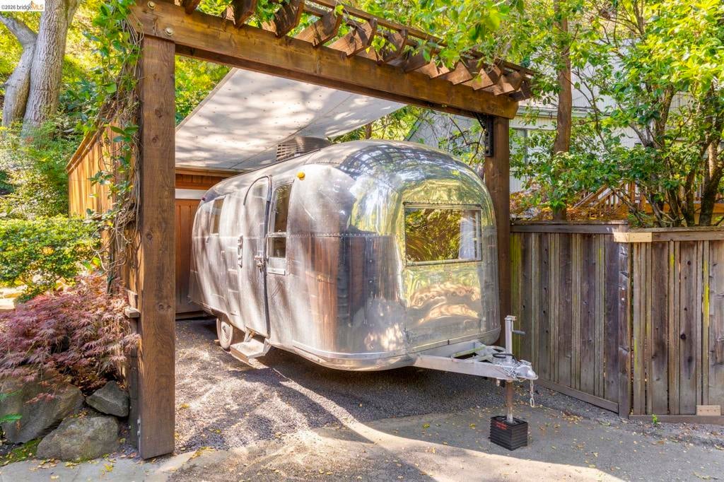 Wooded Montclair Hills Retreat on Private Road. Set on over 1/3 acre along a private road, this distinctive Oakland Hills residence offers exceptional privacy w/flowering trees, lush native plantings, mature wooded grounds & a relaxed Big Sur atmosphere rarely found this close to the city. The main level is anchored by a den w/dramatic corner wall of glass offering uninterrupted views into the surrounding tree canopy. The adjacent chef's kitchen features maple floors, a large center island w/custom hardwood top, stone countertops, stainless steel appliances & pendant lighting, w/a natural flow toward the den ideal for entertaining. A dining room connects to a sunken living room w/its own fireplace & slider doors opening onto rear gardens & spacious decks w/a Japanese-style wood hot tub & elevated forested views. Upstairs, the primary suite includes a refreshed bath & private deck, w/two additional bedrooms w/forested outlooks & a refreshed hall bath completing the upper level. A pergola-beamed two-car garage w/direct interior access & a classic Airstream ideal as a home office complete the grounds. Backup generator & EV charger included. Minutes from Montclair Village shops & restaurants & nearby railroad trail, access & Highway 13. Open Saturday & Sunday, come fall in love!