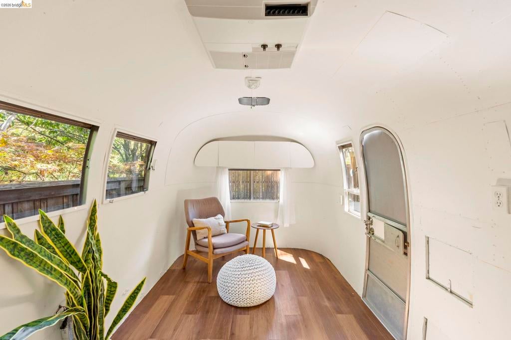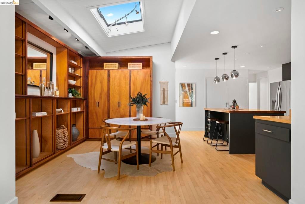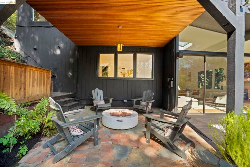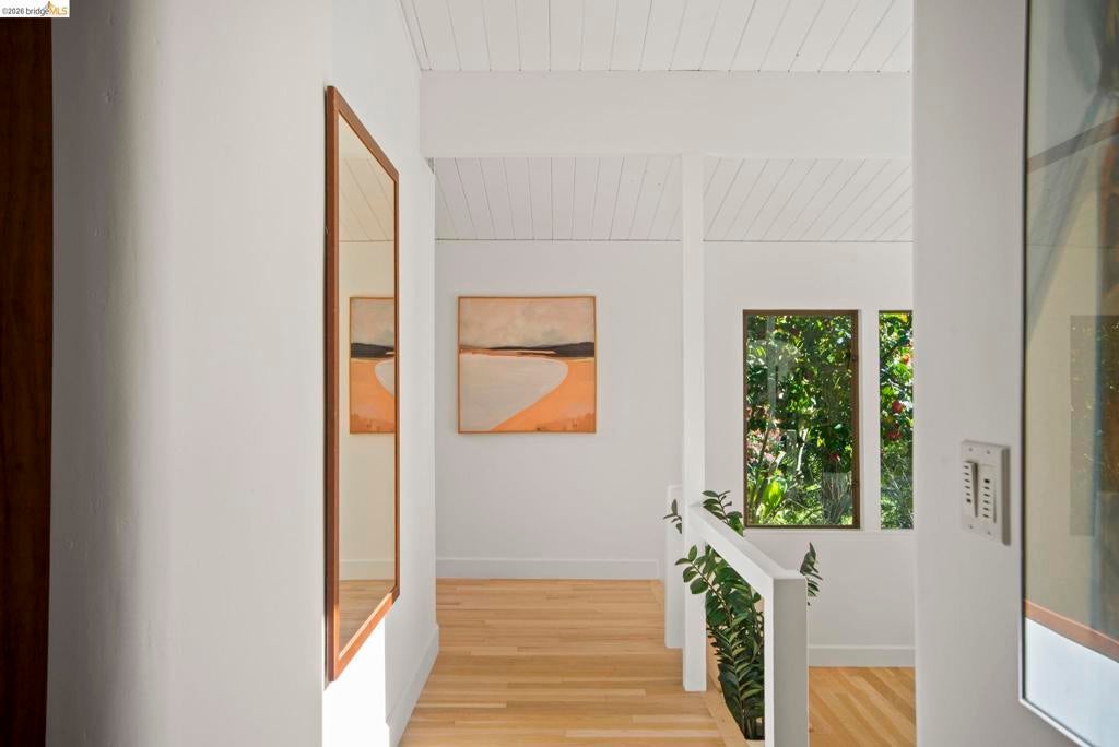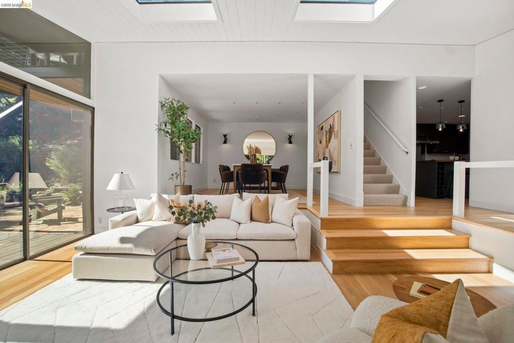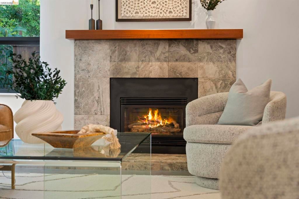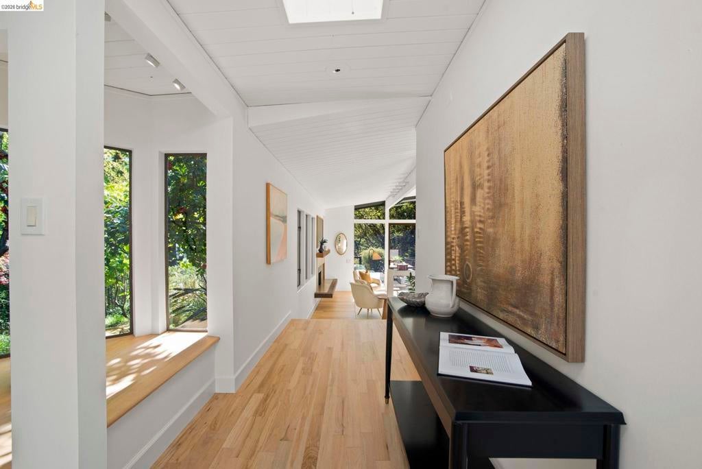 Wooded Montclair Hills Retreat on Private Road. Set on over 1/3 acre along a private road, this distinctive Oakland Hills residence offers exceptional privacy w/flowering trees, lush native plantings, mature wooded grounds & a relaxed Big Sur atmosphere rarely found this close to the city. The main level is anchored by a den w/dramatic corner wall of glass offering uninterrupted views into the surrounding tree canopy. The adjacent chef's kitchen features maple floors, a large center island w/custom hardwood top, stone countertops, stainless steel appliances & pendant lighting, w/a natural flow toward the den ideal for entertaining. A dining room connects to a sunken living room w/its own fireplace & slider doors opening onto rear gardens & spacious decks w/a Japanese-style wood hot tub & elevated forested views. Upstairs, the primary suite includes a refreshed bath & private deck, w/two additional bedrooms w/forested outlooks & a refreshed hall bath completing the upper level. A pergola-beamed two-car garage w/direct interior access & a classic Airstream ideal as a home office complete the grounds. Backup generator & EV charger included. Minutes from Montclair Village shops & restaurants & nearby railroad trail, access & Highway 13. Open Saturday & Sunday, come fall in love!
