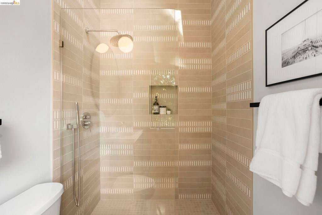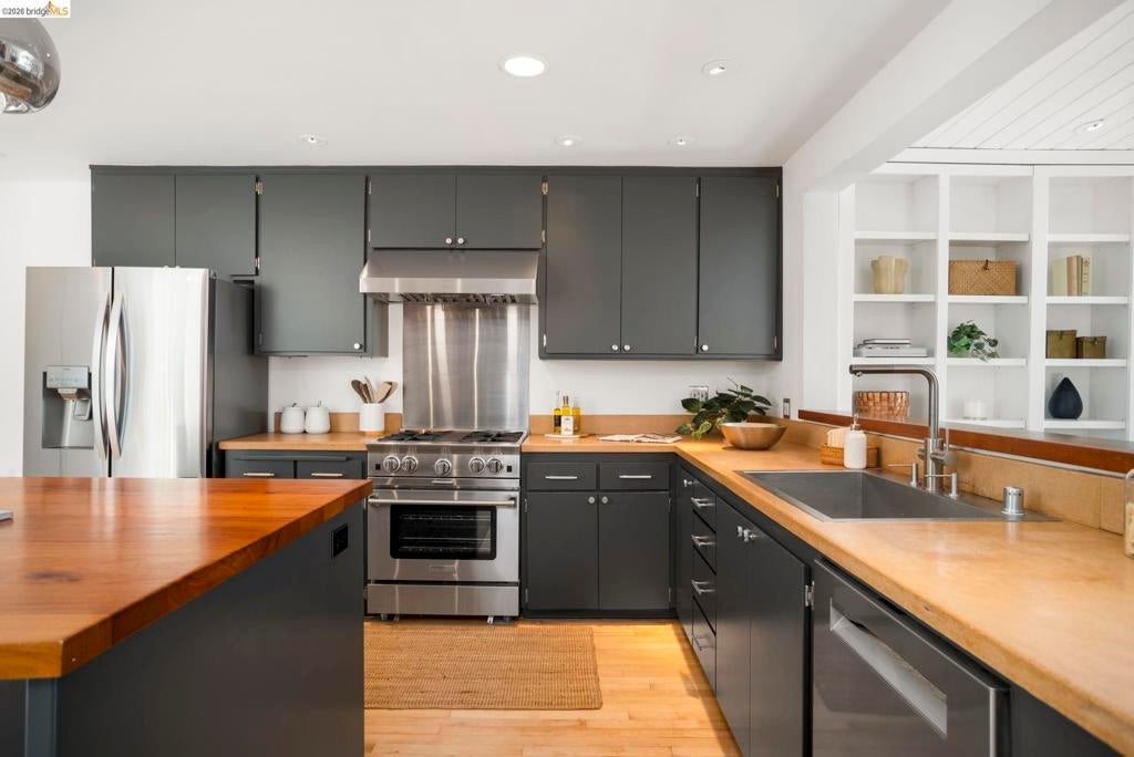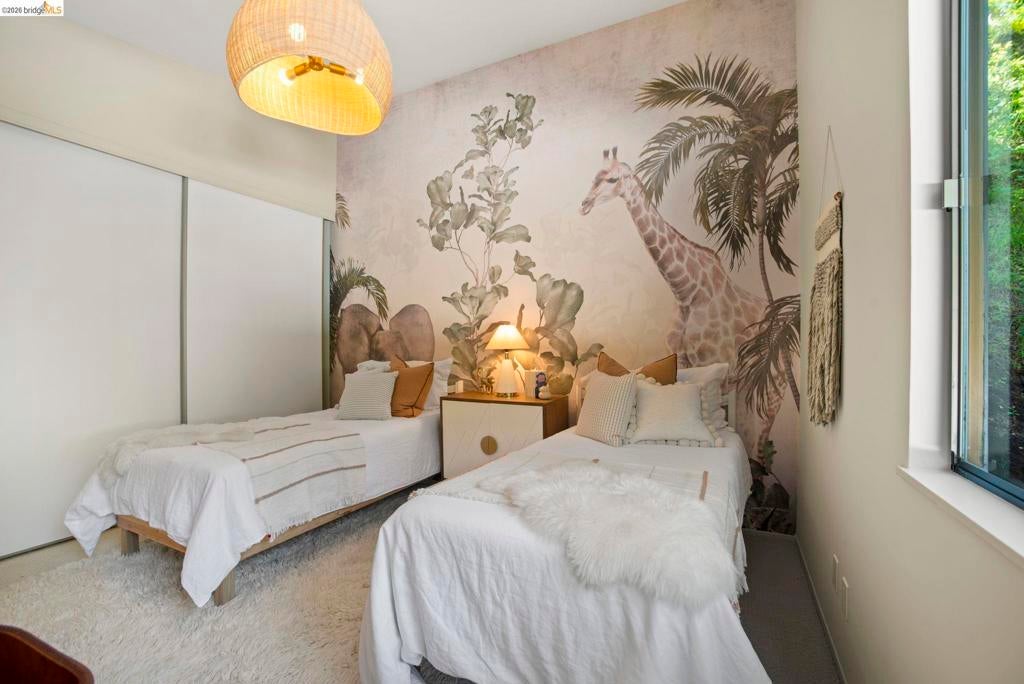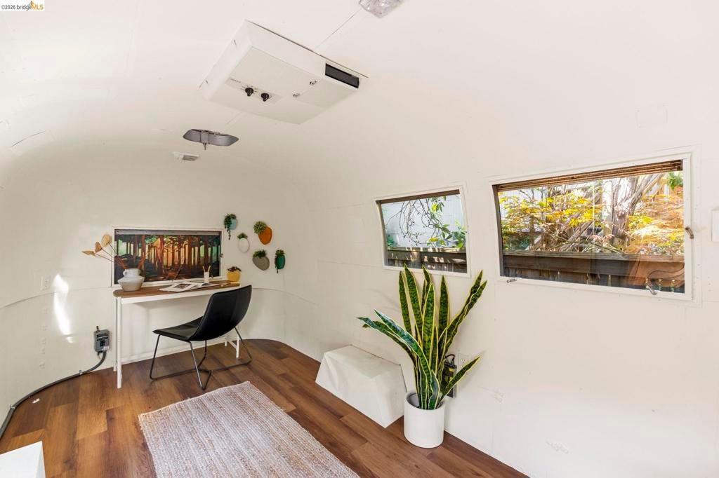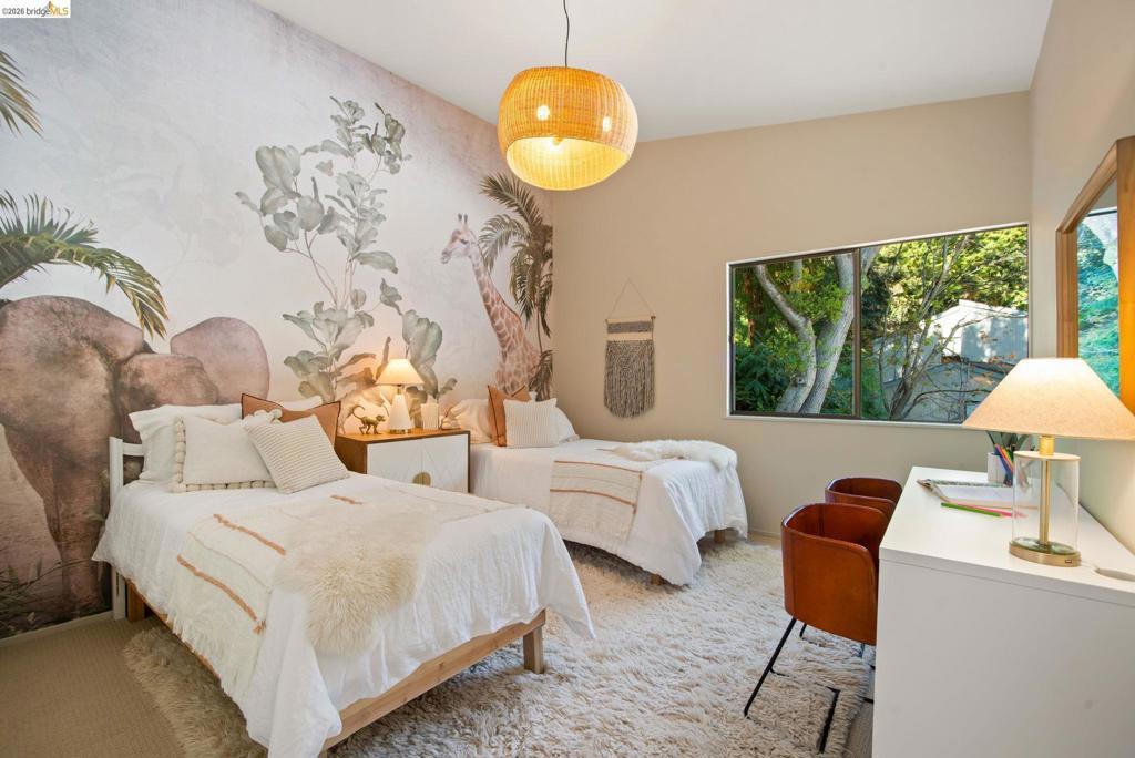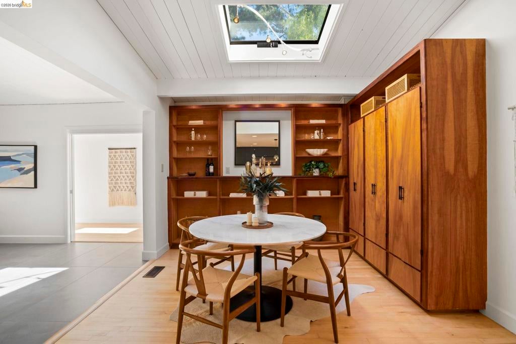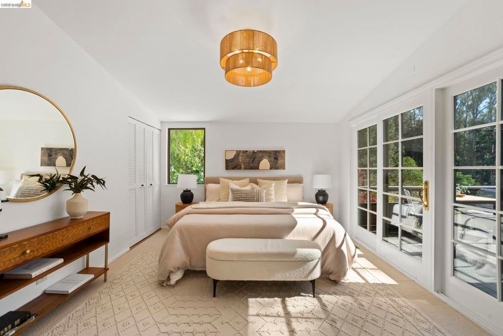 Wooded Montclair Hills Retreat on Private Road. Set on over 1/3 acre along a private road, this distinctive Oakland Hills residence offers exceptional privacy w/flowering trees, lush native plantings, mature wooded grounds & a relaxed Big Sur atmosphere rarely found this close to the city. The main level is anchored by a den w/dramatic corner wall of glass offering uninterrupted views into the surrounding tree canopy. The adjacent chef's kitchen features maple floors, a large center island w/custom hardwood top, stone countertops, stainless steel appliances & pendant lighting, w/a natural flow toward the den ideal for entertaining. A dining room connects to a sunken living room w/its own fireplace & slider doors opening onto rear gardens & spacious decks w/a Japanese-style wood hot tub & elevated forested views. Upstairs, the primary suite includes a refreshed bath & private deck, w/two additional bedrooms w/forested outlooks & a refreshed hall bath completing the upper level. A pergola-beamed two-car garage w/direct interior access & a classic Airstream ideal as a home office complete the grounds. Backup generator & EV charger included. Minutes from Montclair Village shops & restaurants & nearby railroad trail, access & Highway 13. Open Saturday & Sunday, come fall in love!