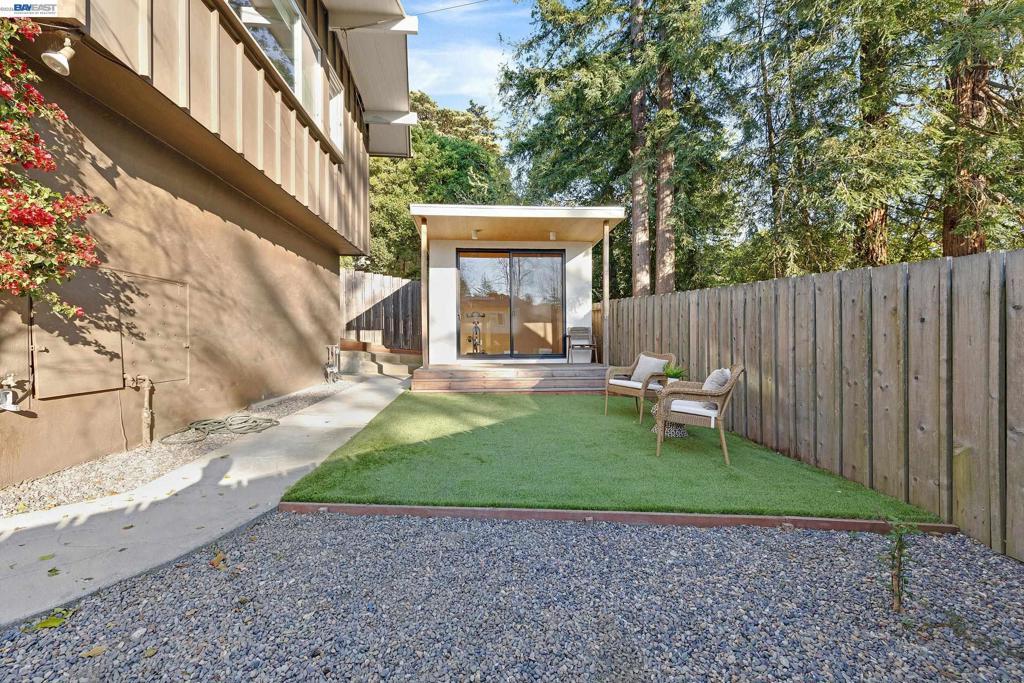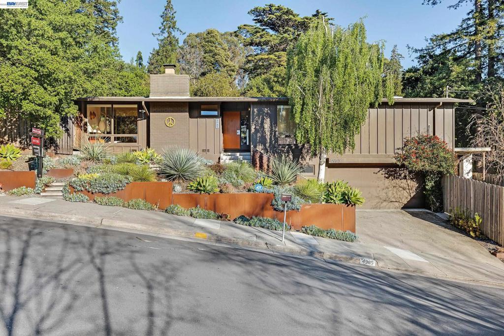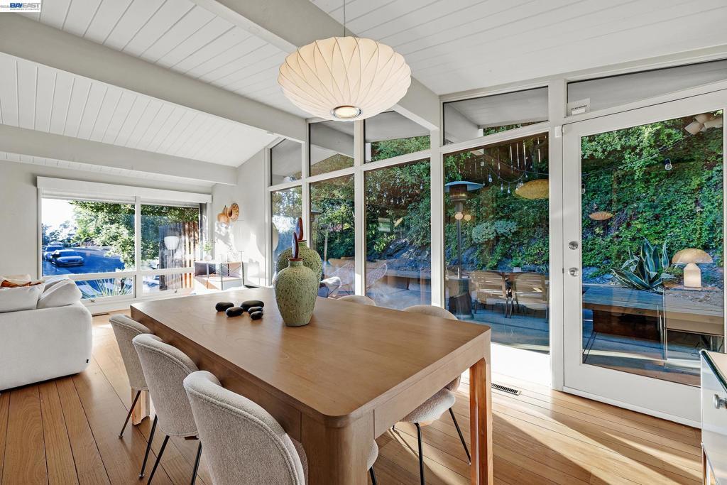 Rare Oakland Hills Mid-Century Modern just one block from Joaquin Miller Park-where the trails, trees and open sky feel like an extension of your own backyard. Set on a spacious corner lot, this 1955 gem blends iconic design with everyday livability—minutes to Redwood Regional Park, Chabot Space & Science Center, Montclair Village, and easy access to Hwy 13/I-580. Inside, the architecture does the talking. Soaring cathedral and vaulted ceilings with exposed beams, a dramatic floor-to-ceiling window wall, original oak floors and a raised brick fireplace give the home a soul that newer construction simply can’t replicate. Skylights bring in natural light and nearly every room looks out onto lush garden greenery. The living and dining areas flow together with effortless openness, while the updated eat-in kitchen remains functional without sacrificing character. Designer Flos sconces add a curated, refined touch throughout. The home features three bedrooms, two updated bathrooms, a dedicated laundry room, A/C and an attached two-car garage with EV-charger. A beautifully crafted 12x10 ADU, finished with white oak wall panels, a white oak ceiling, Stuga Studio hardwood flooring, and its own private Ipe wood deck, offers exceptional flexibility: guest suite or home office.
