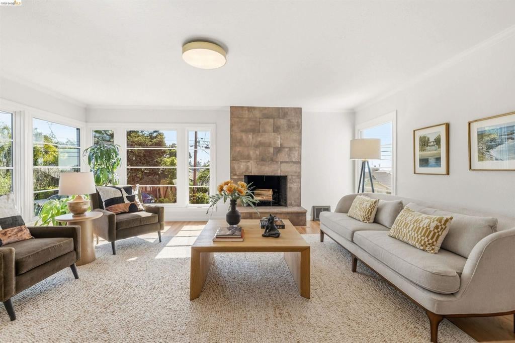 Deco/midcentury architectural details meet stylish functionality and ease. Step into this 1947 GEM where timeless midcentury lines meet fresh, modern energy. At the heart of the home, the kitchen is designed to gather—an open layout with sleek tile floors, stainless steel appliances, and warm walnut cabinetry. The oversized island anchors the space, perfect for cooking, casual dining, and conversation, with seamless flow to the deck, patios and lawn. The living room showcases classic ’40s lines, full-length corner windows, and a stone fireplace that adds warmth without disrupting the clean aesthetic. Refinished hardwood floors bring a smooth, cohesive feel throughout. An elegant archway leads to a bright, airy dining room that feels both connected and distinct. Three bedrooms and two baths offer comfort and flexibility, plus a bonus office with its own full bath—ideal for guests or working from home. A one-car garage, off-street parking, AC, and a spacious basement add everyday ease and potential for family movie night or workout. Outside, fruit and fig trees, sunny patios, and a generous side yard create space to relax, gather, and GROW! Vibrant Upper Laurel District: transportation, shopping, all kinds of dining! Classic Oakland character, thoughtfully updated for modern living