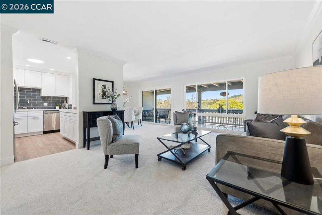 Experience refined living in this beautifully updated Sequoia co-op, where sophisticated style meets serene natural surroundings. Enjoy sweeping tree-lined and hillside views from your private open balcony, the perfect place to unwind. Inside, the home shines with fresh paint and plush new carpeting, complemented by a thoughtfully redesigned custom kitchen featuring crisp white cabinetry, quartz counters, striking blue subway tile backsplash, and sleek stainless-steel appliances. The elegant, white-tiled bathroom offers a modern stall shower, skylight for abundant natural light, and the convenience of an in-unit stacked washer and dryer. Dual pane windows, solid core doors, closet organizers with mirrored doors , crown and base moldings, and smooth ceilings add to the luxurious feel! Ideally situated for both relaxation and recreation, this home is just moments from Rossmoor dining, social venues, and amenities, including the nearby Event Center, Stanley Dollar clubhouse and swimming pool, fitness and sports facilities, scenic hiking trails, and so much more. Welcome to your new Rossmoor lifestyle!