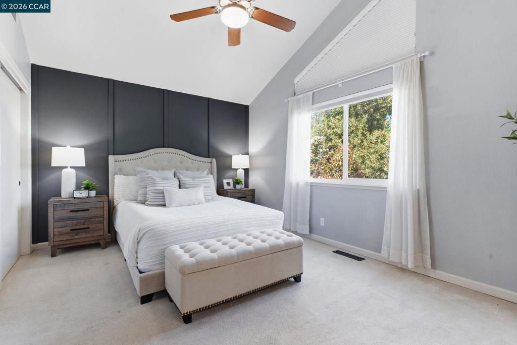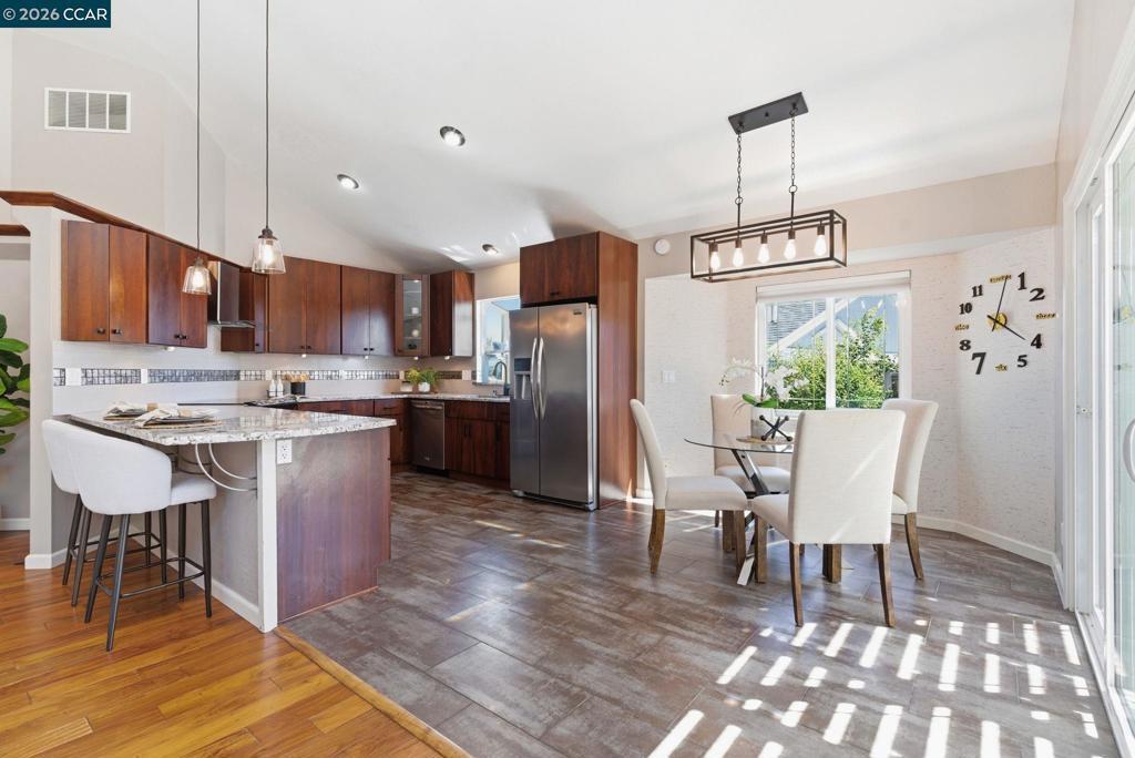 Open house Thurs 5-7pm & Sat 1-4! Beautifully updated, turn-key contemporary home in the desirable unincorporated Mountain View neighborhood of Martinez! This light-filled residence features soaring vaulted ceilings, a dramatic floor-to-ceiling marble fireplace, & an open-concept layout ideal for modern living. The custom kitchen showcases rich cherry cabinetry, upgraded granite countertops, durable porcelain flooring, S.S. Frigidaire appliances, & a breakfast bar that opens effortlessly to the main living spaces. Elegant cherry wood flooring runs throughout, complemented by modern stair railings with brushed nickel accents, while the bedrooms offer plush carpeting for comfort. The spacious primary suite features dual sinks & abundant natural light from skylights & sun tunnels. Recent upgrades include a new furnace, new A/C condenser, newer roof, tankless water heater, & Nest thermostat - offering comfort, efficiency, & peace of mind. Finished 2-car garage with 220V outlet. Step outside to your private, fenced backyard with lawn & covered patio—perfect for relaxing, pets, children or entertaining! Ideally located near Morello Park Elem, Hidden Valley Park, & Briones Regional Park, minutes from HWY4 & 680. Enjoy the perfect blend of peaceful hillside living & everday convenience!