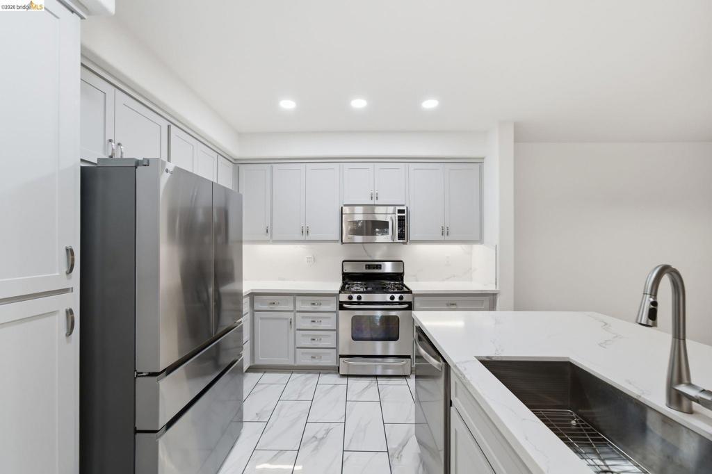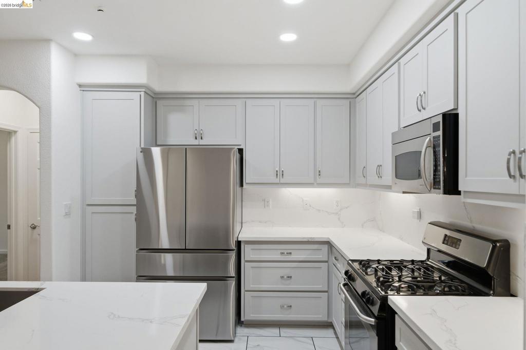 Resort style living at The Villas! This recently updated unit is the nicest in the community and features a great location! Sellers updated kitchen and baths with sleek quartz counters, modern cabinets and tile, and fresh interior paint throughout. Rare single level unit features all living spaces on one floor. Open floor plan features a spacious living room with private patio access. Kitchen offers a large island with lux quartz countertops and lots of cabinet and counter space. Large primary en-suite features a walk-in closet, access to patio, and bath has dual vanities, stall shower, and separate tub. Second bedroom has a separate private balcony and large closet. Full laundry room features washer/dryer and additional cabinets. Ideal location in the community is close to the pool, fitness center, and clubhouse. There is also a green belt right in front of the home. Very low HOA dues ($377/month) as well! This desirable Dublin Ranch location is walking distance to shops, restaurants, schools, parks, medical centers (Kaiser and Palo Alto Medical Foundation), plus easy freeway access. With an attached 2 car side-by-side garage, fantastic floor plan, and unbeatable location, this home has it all! Visit www.4132Clarinbridge.com for 3D tour, pictures, and floor plan.