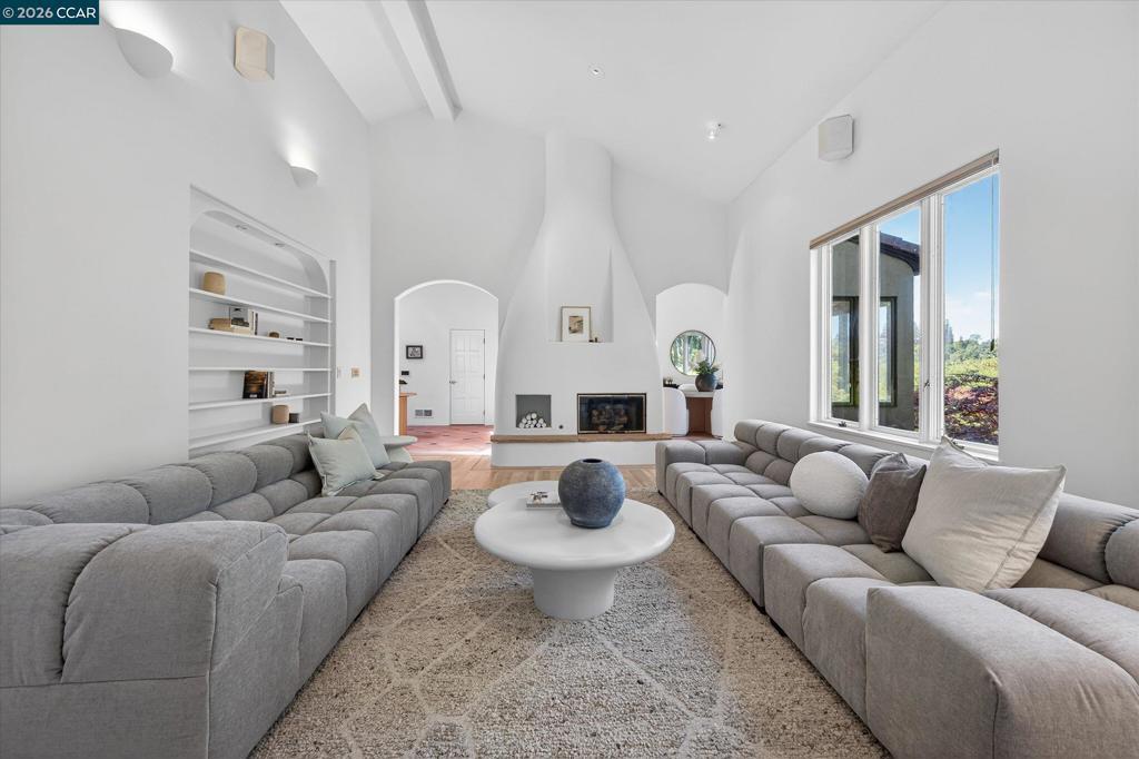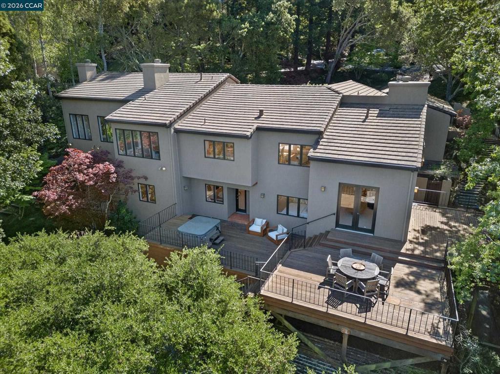 Arrive beneath a canopy of blooming wisteria & step into a private courtyard where a stone fountain and flowering vines set the tone for this architecturally singular Santa Barbara inspired retreat. Set among ancient oaks with sweeping valley views, this 4,112 sq ft masterwork offers 4 beds + office, 3.5 baths, and a 3-car garage. Soaring vaulted ceilings, hardwood floors, sculpted archways, and a dramatic kiva fireplace anchor the living room. The updated chef's kitchen flanked by a formal dining room and sun-drenched breakfast room, both with valley views, offers stainless appliances, new countertops & tile backsplash as well as a center island and Spanish tile floors. Fabulous indoor/outdoor flow from the kitchen to the entry courtyard as well as the access from the generous family room via French doors to sweeping treetop decks with a hot tub. The serene primary suite offers a fireplace & private balcony nestled into the oak canopy. There is a second en-suite bedroom on the main level that is outfitted with built-inn desks & a murphy bed offering flexibility. Set in the Orinda Woods HOA which includes pool, tennis courts, BART shuttle & more. This location is a 10! Minutes to downtown Orinda's farmers market, shops, restaurants, commute top-rated K–12 schools. Welcome Home!