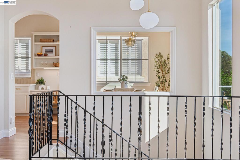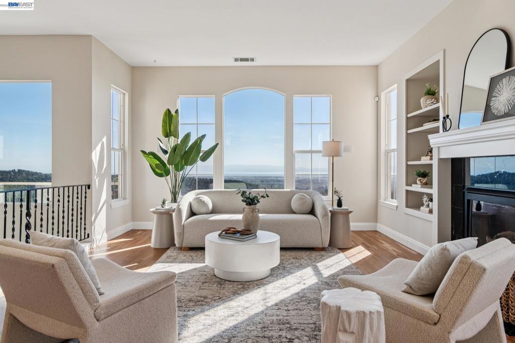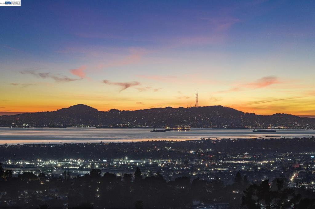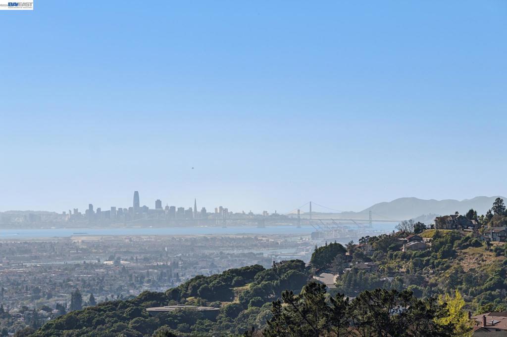 Breathtaking panoramic views of San Francisco Skyline/East Bay with golden hour kisses awaits you at 8255 Skyline Circle-2,054 sqft custom built contemporary abode offers an unparalleled living experience nestled in the prestigious Bay View gated community of the Oakland Hills. This 3 BR, 2.5 BA home boasts an extra versatile room on entry level, front patio, fresh paint and large windows allowing natural light to flood the interior. Refinished hardwood floors, recessed lighting, central heat/air conditioning, a gas fireplace and endless 3 bridges views-to fall in love with.The heart of this home is the expansive main floor featuring a living room flowing into the dining room decorated with an electrical fireplace to cozy up to. An updated chef’s kitchen with an island opens into a breakfast nook leading to a balcony for ever changing views. Finishing the main level-a versatile room, a powder room and attached 2 car garage w/ 220 EV chargers. Downstairs private quarters, a primary spa-like ensuite featuring a jetted roman tub, stand-up shower, dual vanity and a walk-in closet-paired with a private balcony to capture your moods. Two additional bedrooms, full bathroom and laundry complete this floor. Minutes from Anthony Chabot Park, trails, schools, FWY, shops & restaurants.