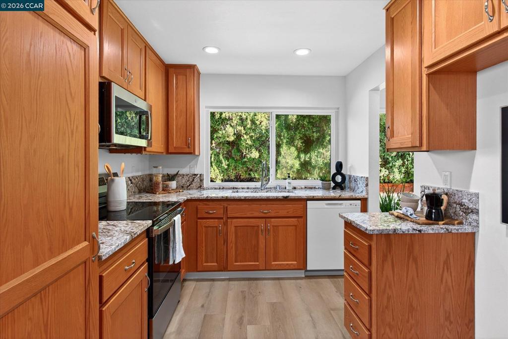 Beautifully updated single-story home blending style and comfort in a highly desirable location. Fresh neutral paint, new luxury vinyl plank flooring in the main living areas, new carpet in the bedrooms, and updated lighting create a warm, modern feel throughout. Offering 3 bedrooms, 2 baths, and 1,365 square feet of living space on a .13-acre lot, this inviting home is ideally situated near the private greenbelt and community pool. The light and bright kitchen features newer granite countertops, a new stainless steel stove, refreshed cabinetry, and recessed lighting. An open concept family room and dining area with fireplace creates the perfect setting for both everyday living and cozy winter evenings. The spacious primary retreat offers ample closet space and a private en suite bath with newer vanity and updated fixtures. Outside, fresh new sod enhances the private backyard retreat, providing an ideal space for play, relaxation, and entertaining. Located within the boundaries of top-rated Highlands Elementary, Foothill Middle, and Northgate High School. HOA dues of $154/month include access to 3 community pools, tennis and pickleball courts, greenbelts, private dog park and more.