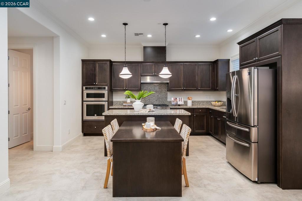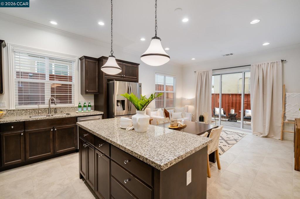 Beautifully appointed 4 bed, 2 full & 2 half baths home in the highly desirable Gale Ranch community of San Ramon! Offering 2,171 square feet of thoughtfully designed living space, this light-filled residence blends comfort, style, & functionality. The open main level features a stunning chef’s kitchen with rich dark cabinetry, granite countertops, stainless steel appliances, gas cooktop, double ovens, & a generous center island with bar seating, perfect for casual dining & entertaining. The kitchen flows seamlessly into the dining & living areas, creating an inviting space for gatherings of all sizes. Large windows, recessed lighting, & neutral finishes enhance the bright & airy feel throughout. Upstairs, a versatile loft provides additional flexible living space or home office. The loft opens directly to a covered patio, creating a seamless indoor-outdoor extension. The spacious primary suite serves as a private retreat, complete with a spa-inspired bathroom featuring dual vanities, a soaking tub, & a separate glass-enclosed shower. Additional bedrooms are generously sized & well-suited for family, guests, or work-from-home needs. Ideally located near top-rated schools, parks, trails, shopping, & dining, this home offers exceptional style, comfort, & convenience.