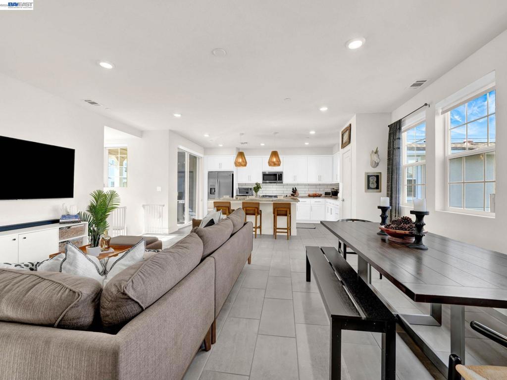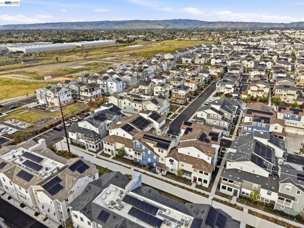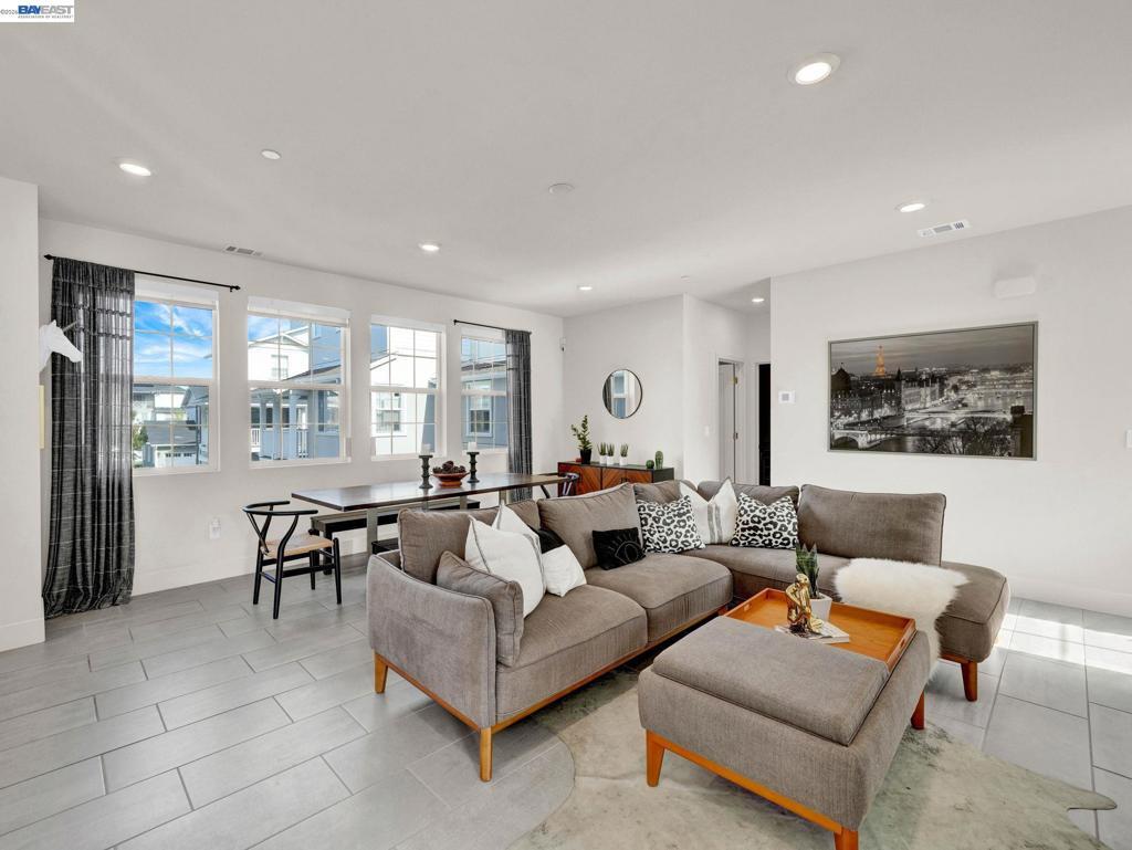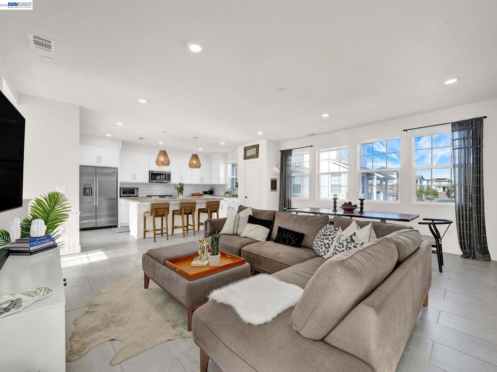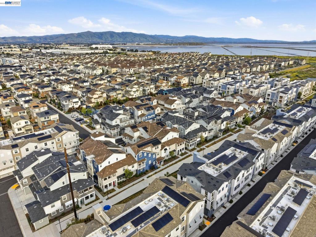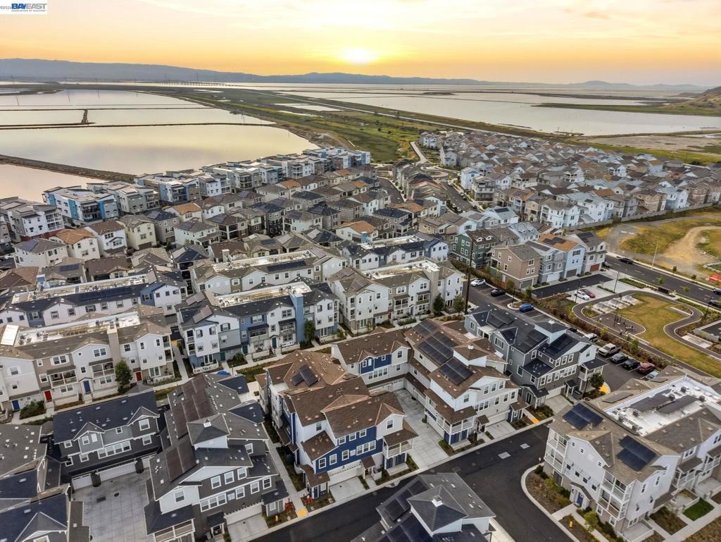 Situated in the highly desirable Bayshores community of Newark, this beautifully designed three-level home offers a bright, open floor plan with modern finishes throughout. The main living area is filled with natural light and features open-concept living and dining with smart automatic shades. The chef-inspired kitchen includes white shaker cabinets, granite countertops, subway tile backsplash, stainless steel appliances with a gas range and griddle, a spacious pantry, and a large island with breakfast bar seating, plus sliding door access to a private balcony. The main level also offers a guest bedroom or office, full bath, and laundry room. The expansive primary suite features a large walk-in closet and spa-like bath with dual sinks, soaking tub, and separate shower. Two additional bedrooms share a hall bath. Additional highlights include a finished two-car garage with EV-ready setup, central A/C, owned solar, and smart upgrades including a water shutoff system. Community amenities include a clubhouse, pool, dog park, and playground with easy access to shopping, dining, Hwy 84, Dumbarton Bridge, Hwy 880, and major tech employers.