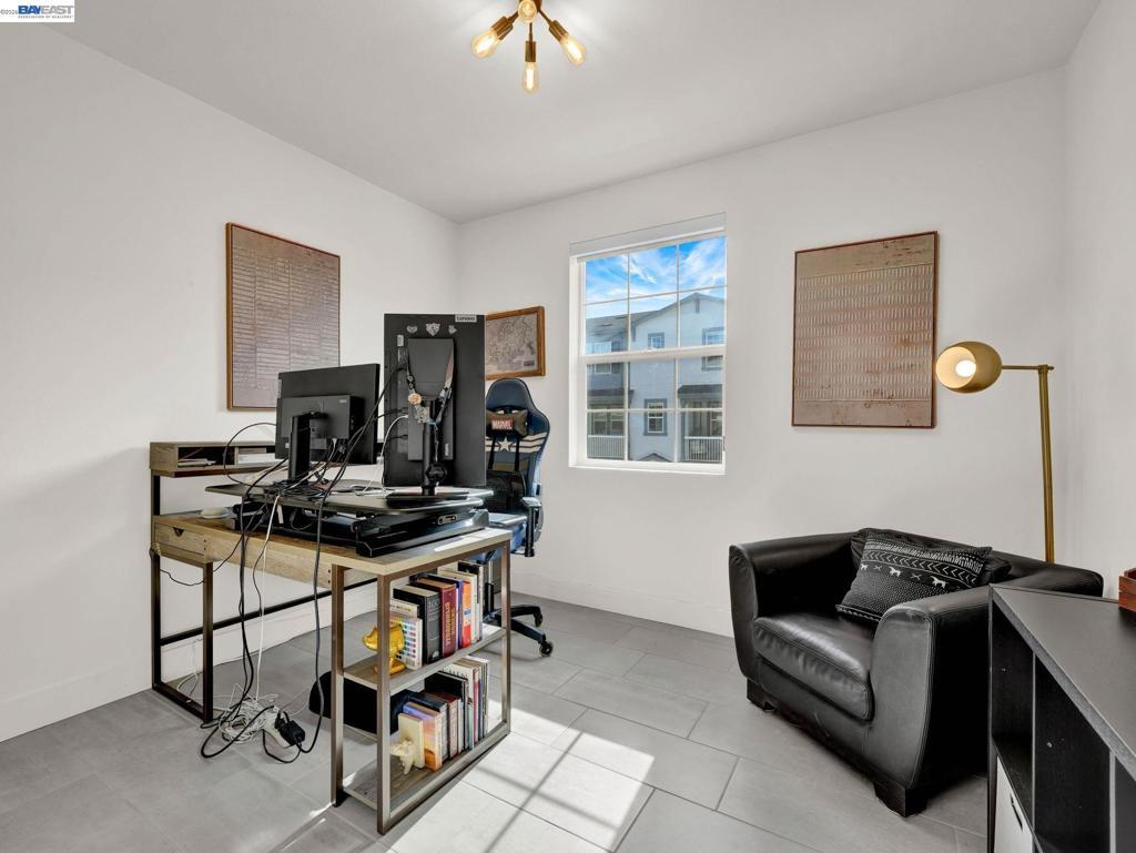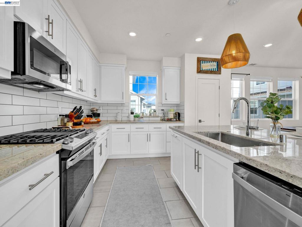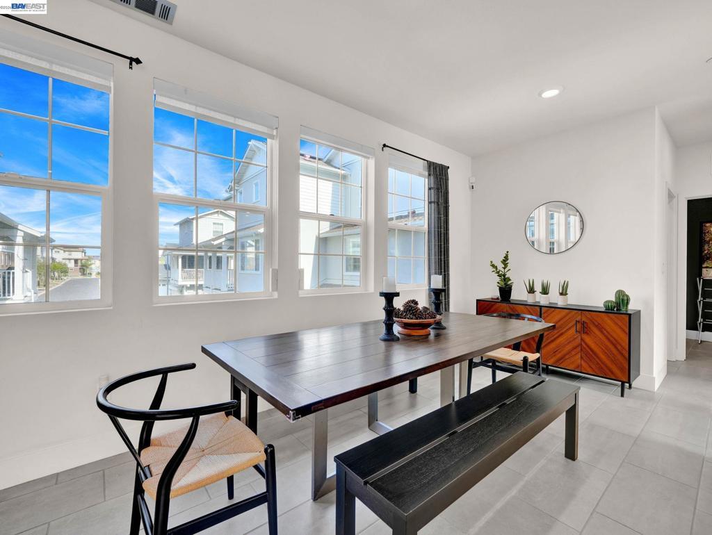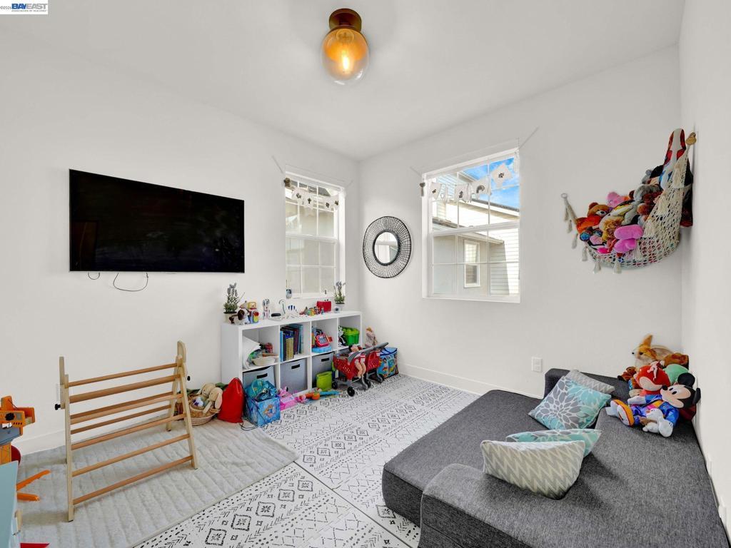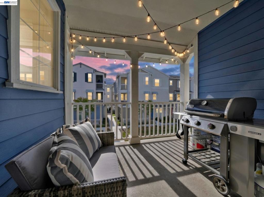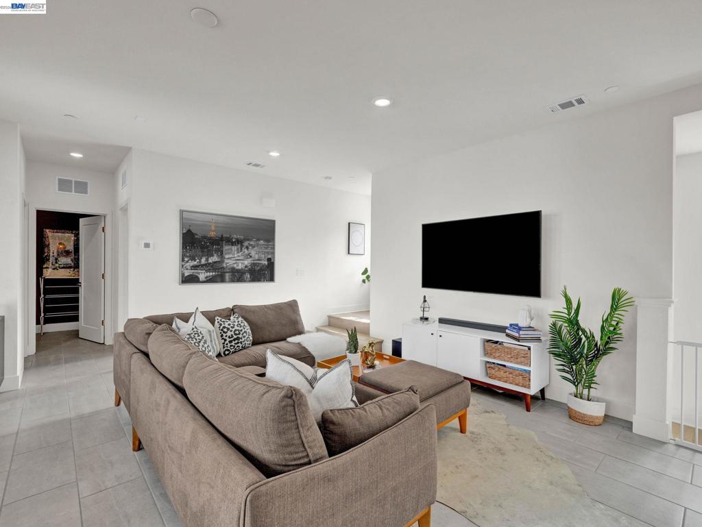 Situated in the highly desirable Bayshores community of Newark, this beautifully designed three-level home offers a bright, open floor plan with modern finishes throughout. The main living area is filled with natural light and features open-concept living and dining with smart automatic shades. The chef-inspired kitchen includes white shaker cabinets, granite countertops, subway tile backsplash, stainless steel appliances with a gas range and griddle, a spacious pantry, and a large island with breakfast bar seating, plus sliding door access to a private balcony. The main level also offers a guest bedroom or office, full bath, and laundry room. The expansive primary suite features a large walk-in closet and spa-like bath with dual sinks, soaking tub, and separate shower. Two additional bedrooms share a hall bath. Additional highlights include a finished two-car garage with EV-ready setup, central A/C, owned solar, and smart upgrades including a water shutoff system. Community amenities include a clubhouse, pool, dog park, and playground with easy access to shopping, dining, Hwy 84, Dumbarton Bridge, Hwy 880, and major tech employers.