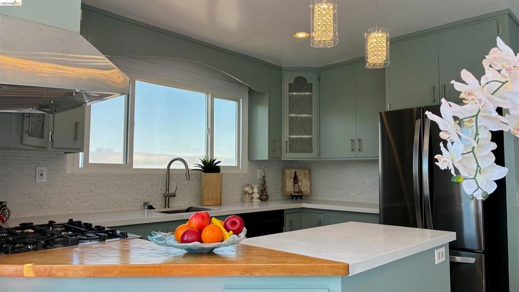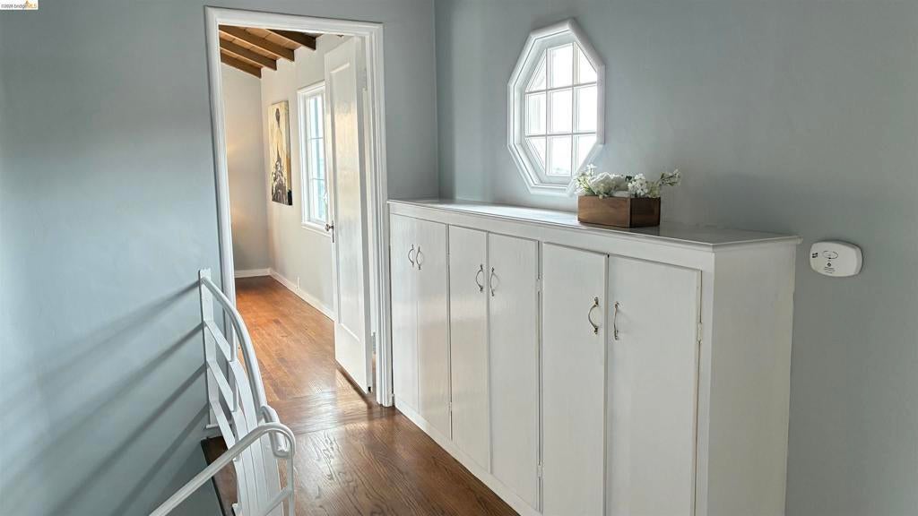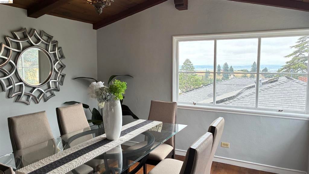 Enjoy breathtaking water views of the SF Bay, Bay Bridge, and Golden Gate Bridge from this traditional yet beautifully updated home, ideally located in the desirable Upper Rockridge neighborhood—known for its excellent schools and peaceful surroundings. The recently renovated kitchen features elegant cabinetry, quartz-style countertops, and modern crystal lighting that adds a touch of sophistication. A newly constructed ADU (approx. 300 sq. ft.) with a full bath provides flexible living space and offers both interior and private backyard entrances. Architectural details abound, from dramatic wood beam ceilings to gleaming oak hardwood floors. Additional highlights include dual-pane windows, freshly painted interiors, and a remote-controlled two-car garage with interior access. Fruit trees, plants in the fully fenced back yard. How pleasant it is to sit ion the deck shaded by greenery chat with family or friends over a tea.