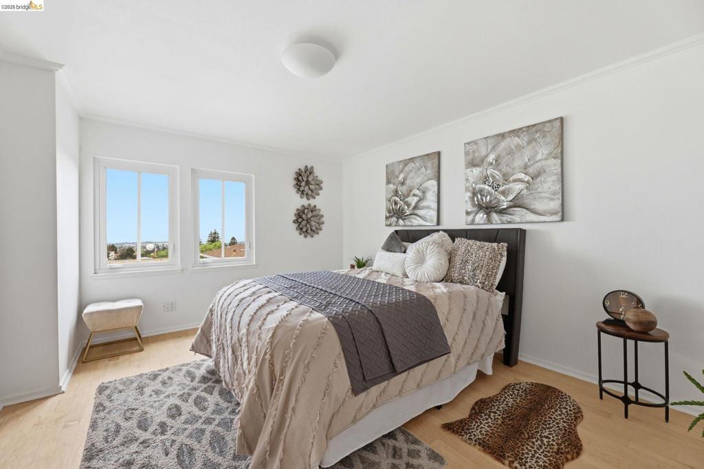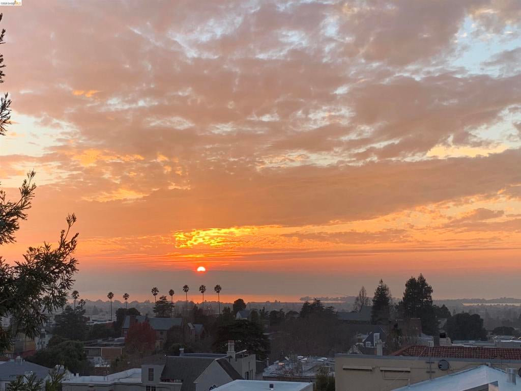 Beautiful light-filled top-floor condo in prime North Berkeley with views of the Bay & Golden Gate Bridge. The sunsets are incredible! Tall ceilings and expansive sliding glass windows create an airy feel throughout. The kitchen opens to the dining area, and the living area leads to a large private balcony, perfect for dining or relaxing while enjoying the views. The spacious bedroom has wonderful views of the Bay. An optional room divider in the main living space is ideal for a bonus room, office, or guest area. Elevator building with secure parking, storage, and beautifully maintained common areas. Ideally located near UC Berkeley, shops, cafes, and transportation.