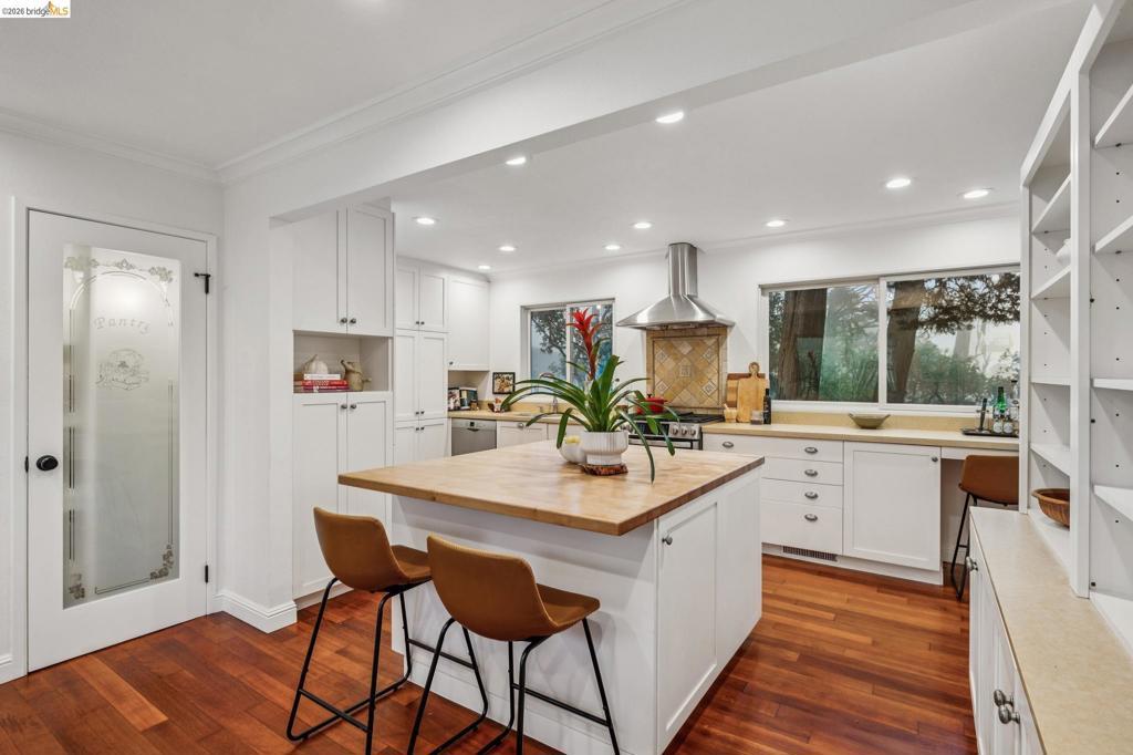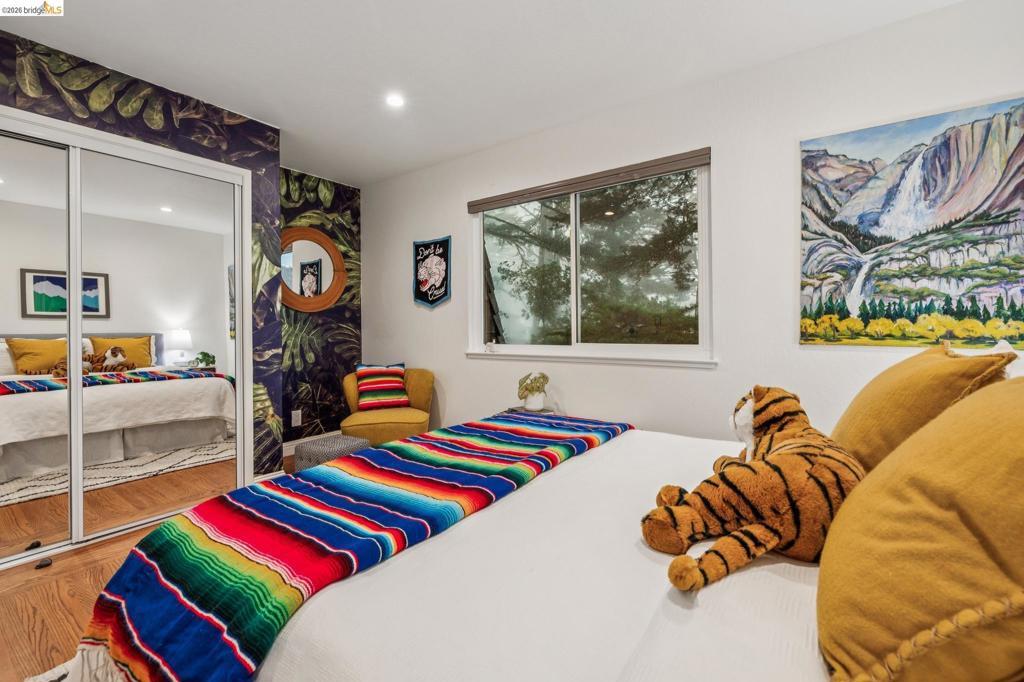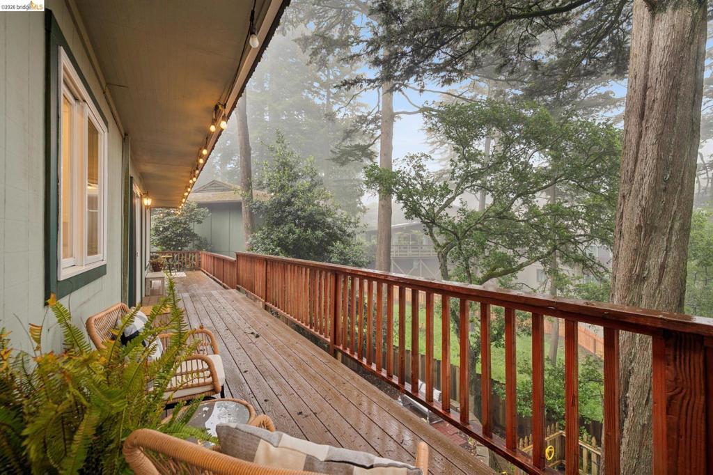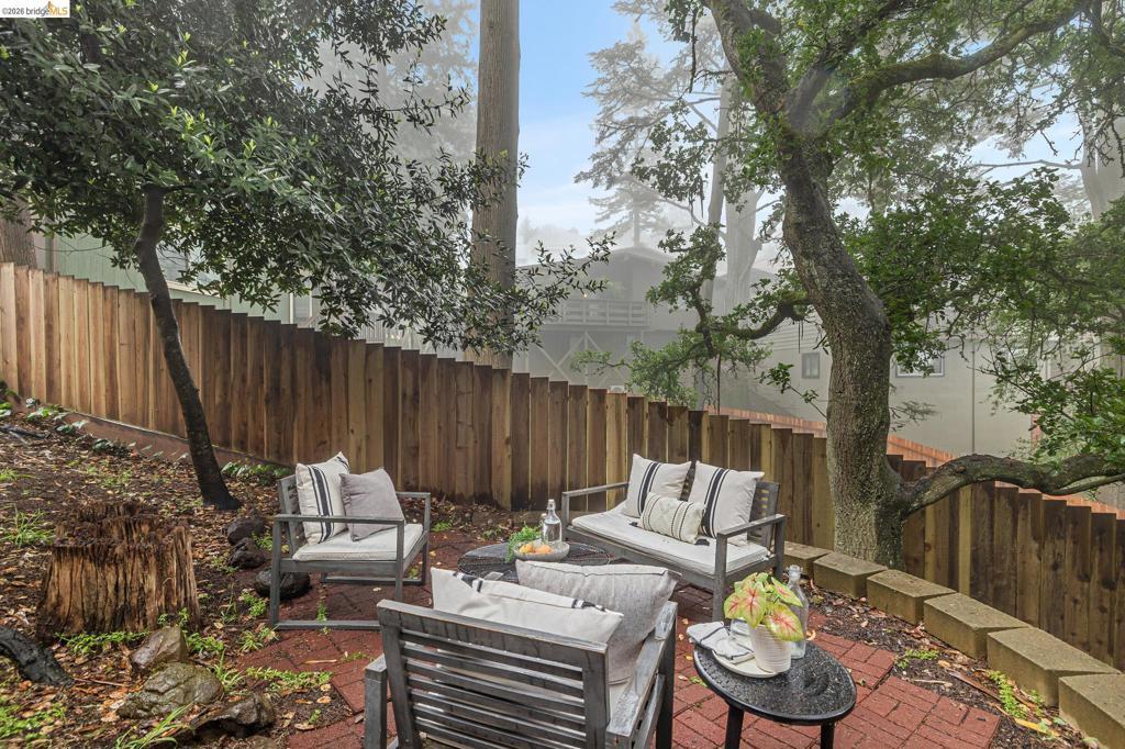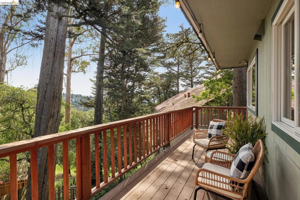 18 North Circle is a rarity in the Oakland Hills. Its situation on a large, mostly level cul-de-sac, as well as a level front yard with charming picket fence make it feel quite traditional for a hills house. The living room has a fireplace and direct access to the wrap-around deck for outdoor living. The eat-in kitchen is oversized with a large island, a pantry, and windows on three sides to let in the light. The primary bedroom has an updated marble bathroom with step-in shower and a walk-in closet. Three more bedrooms offer great flexibility. The side yard is terraced and ready for your kitchen garden, while the backyard has a patio and delightful play structure. There are contemporary upgrades like air conditioning and a tankless water heater, and extra parking for your camper or RV. Just up the street from the Hills Swim and Tennis Club, this is your tranquil home in the hills.