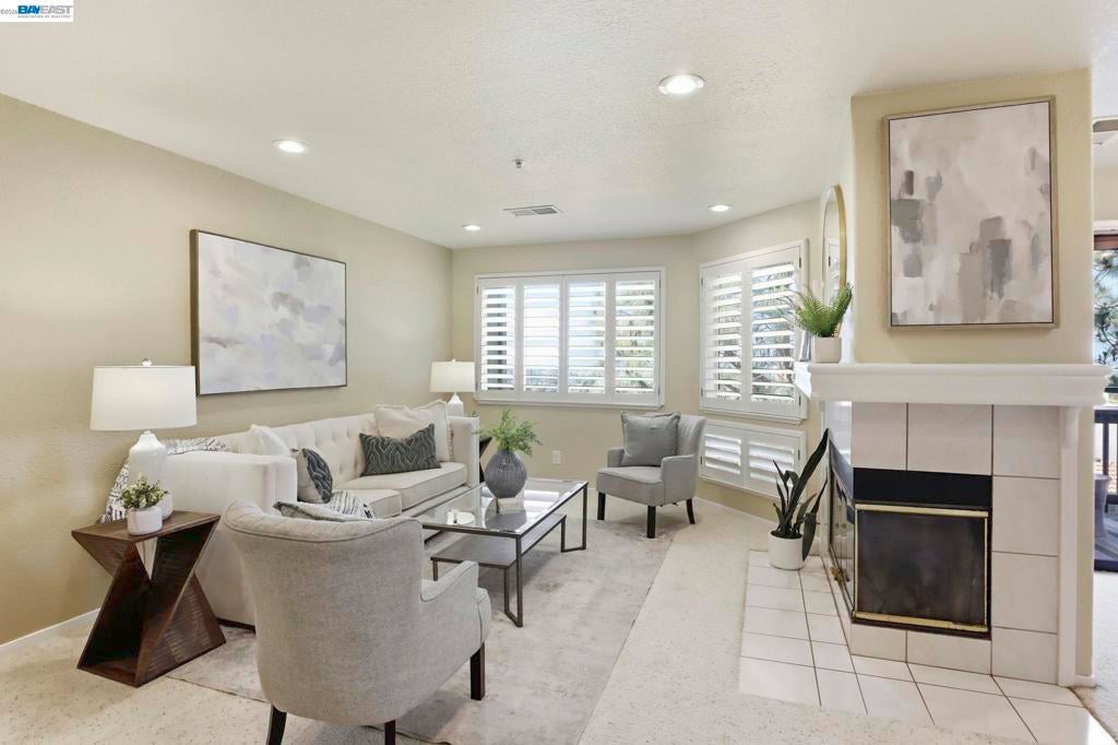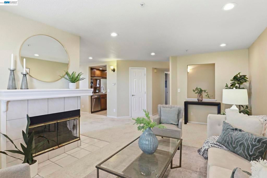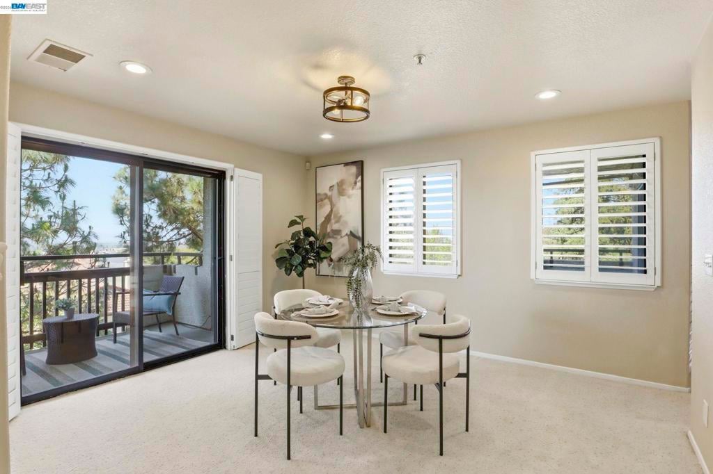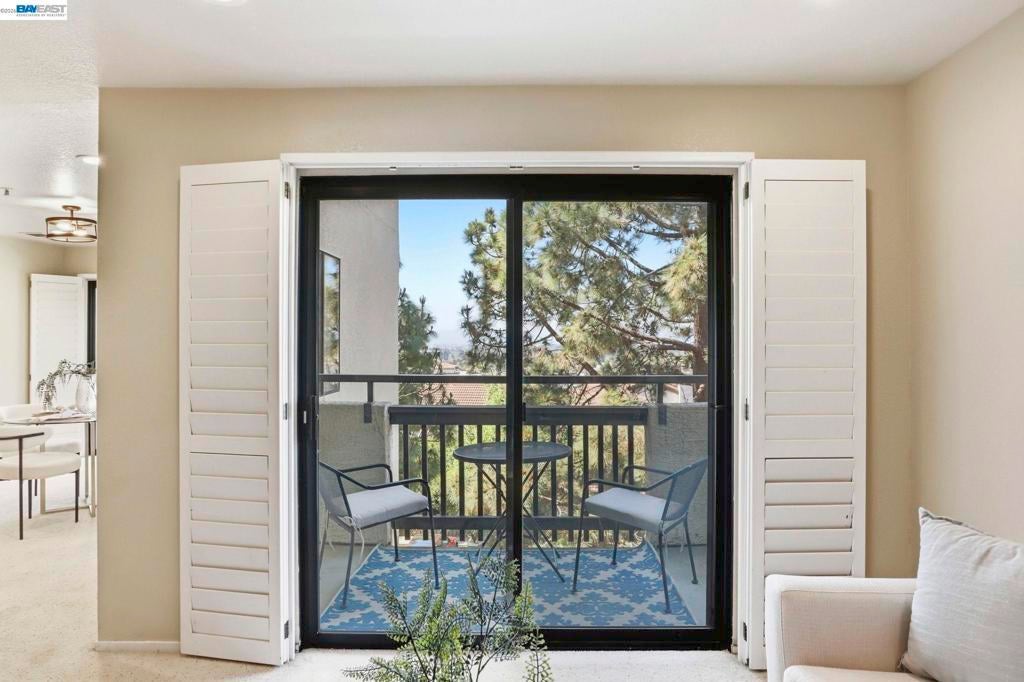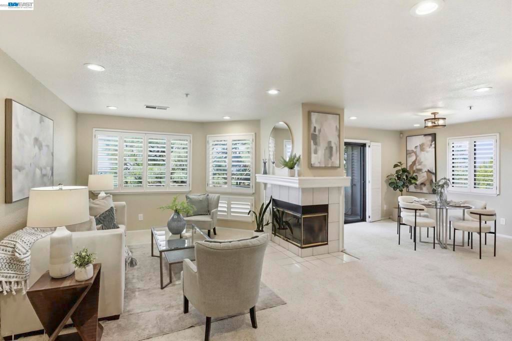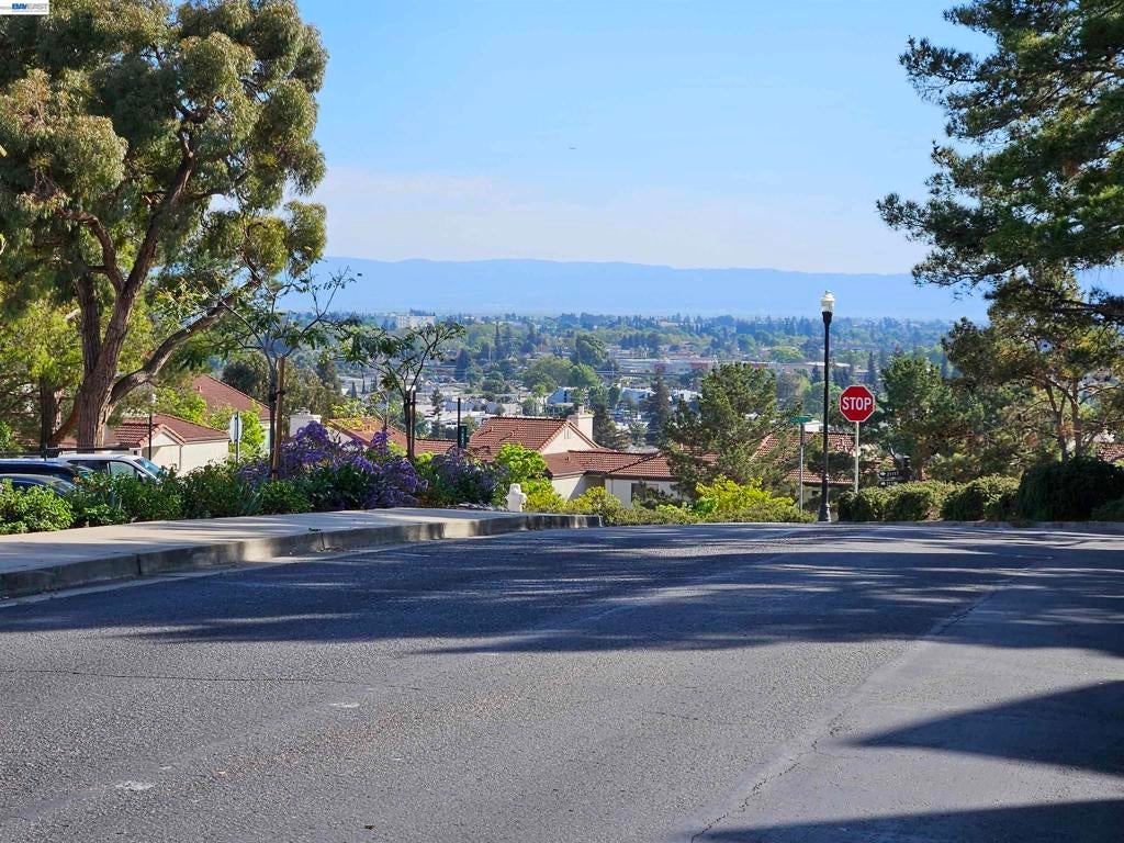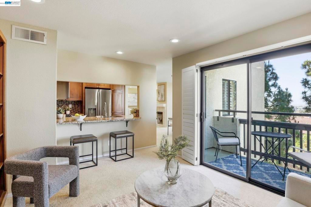 Rare opportunity to own one of the largest floor plans in the Mesa Verde community—this spacious, level-in unit has no steps to entry. Designed for both comfort and flexibility, the home features a generous living room, separate family room, and a formal dining area that can easily serve as a home office, media space, or gathering room. Step outside to 2 private balconies with views of the Bay and city lights—perfect for relaxing or entertaining. The updated kitchen has granite countertops, custom solid wood cabinetry, and stainless steel appliances, including a 3-door refrigerator, gas convection double oven, built-in microwave, and dishwasher. The expansive primary suite offers a true retreat with a soaking tub, stall shower, dual sinks, and a large walk-in closet. There are plantation shutters and recessed lighting throughout, and a fireplace with gas starter. Located in a gated community with mature trees and lush landscaping, enjoy resort-style amenities including multiple pools, tennis courts, a clubhouse with game room, and exercise equipment. Enclosed parking/storage in the 1-car garage and one additional uncovered parking space (permit fee). Ideally situated just blocks from BART, major freeways. Enjoy nearby Castro Valley downtown shopping, dining and entertainment.