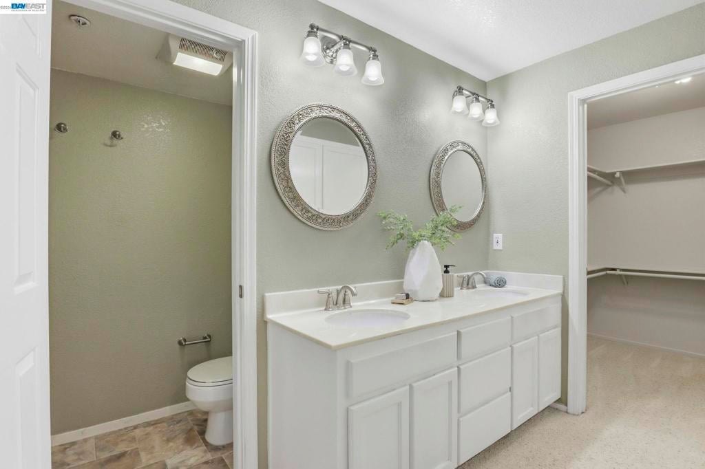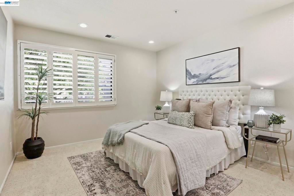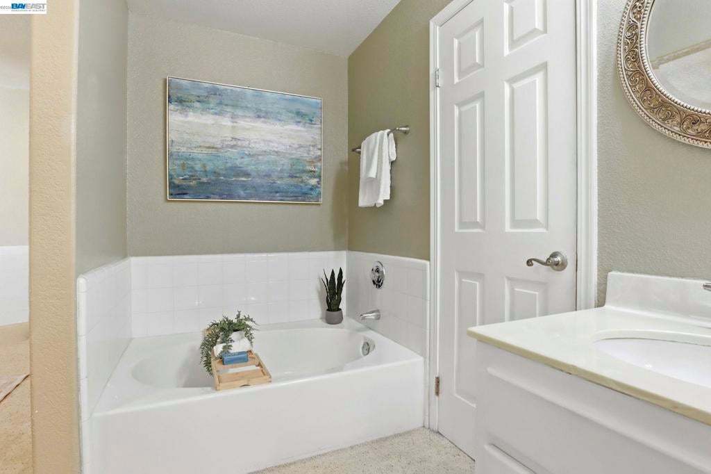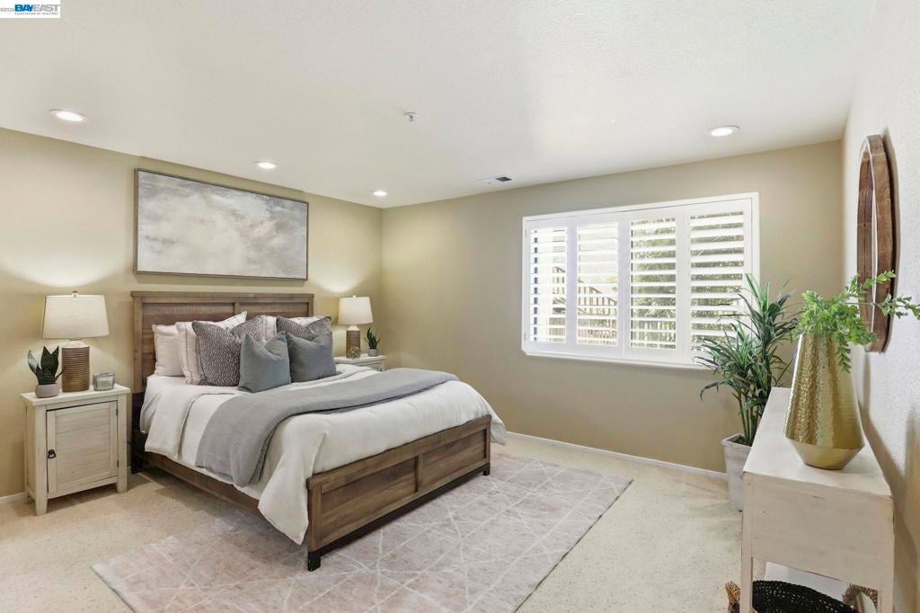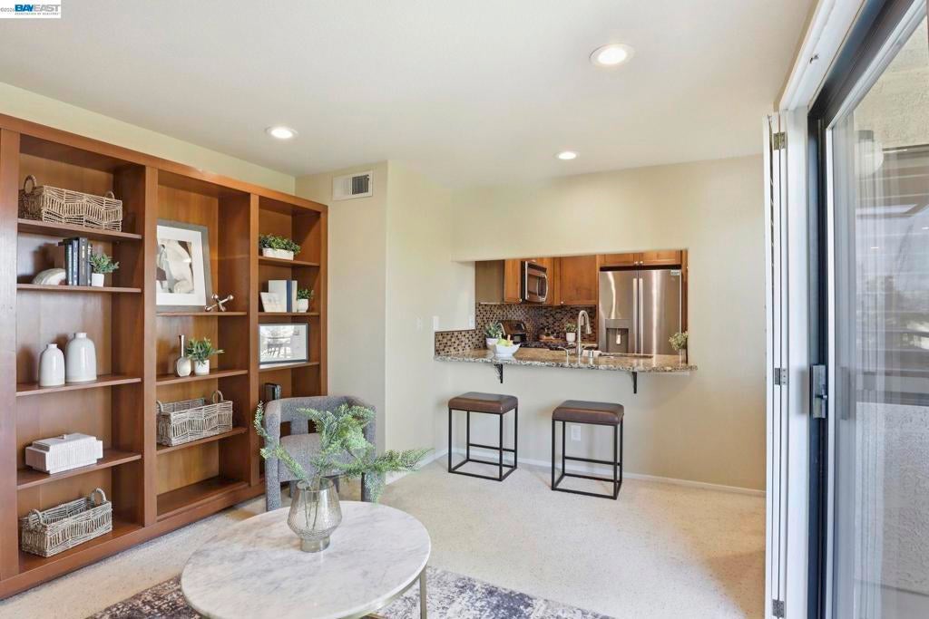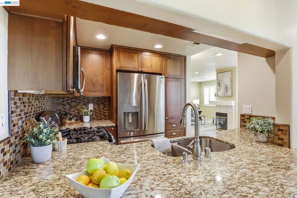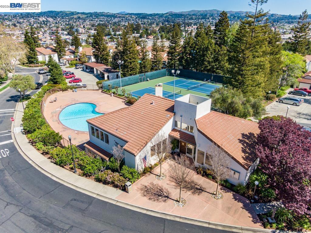 Rare opportunity to own one of the largest floor plans in the Mesa Verde community—this spacious, level-in unit has no steps to entry. Designed for both comfort and flexibility, the home features a generous living room, separate family room, and a formal dining area that can easily serve as a home office, media space, or gathering room. Step outside to 2 private balconies with views of the Bay and city lights—perfect for relaxing or entertaining. The updated kitchen has granite countertops, custom solid wood cabinetry, and stainless steel appliances, including a 3-door refrigerator, gas convection double oven, built-in microwave, and dishwasher. The expansive primary suite offers a true retreat with a soaking tub, stall shower, dual sinks, and a large walk-in closet. There are plantation shutters and recessed lighting throughout, and a fireplace with gas starter. Located in a gated community with mature trees and lush landscaping, enjoy resort-style amenities including multiple pools, tennis courts, a clubhouse with game room, and exercise equipment. Enclosed parking/storage in the 1-car garage and one additional uncovered parking space (permit fee). Ideally situated just blocks from BART, major freeways. Enjoy nearby Castro Valley downtown shopping, dining and entertainment.