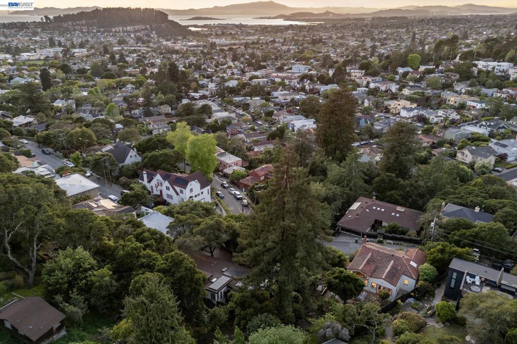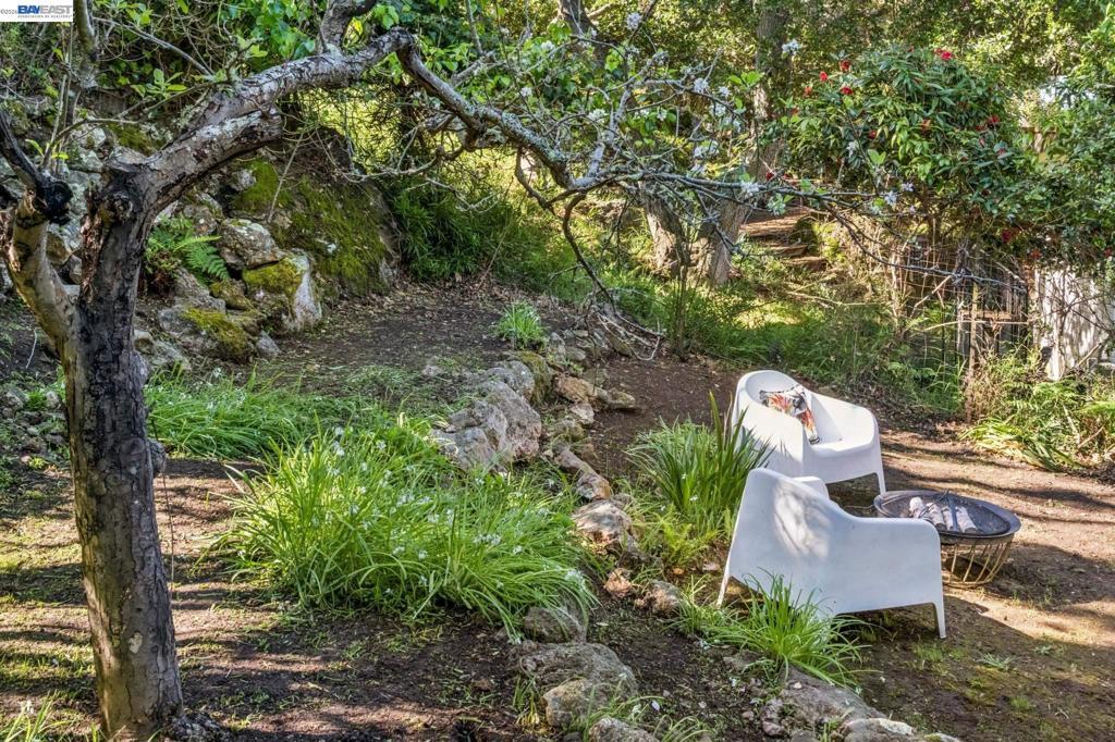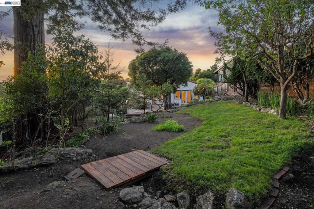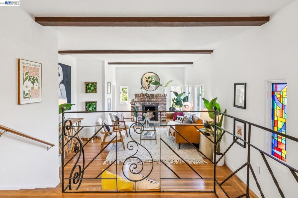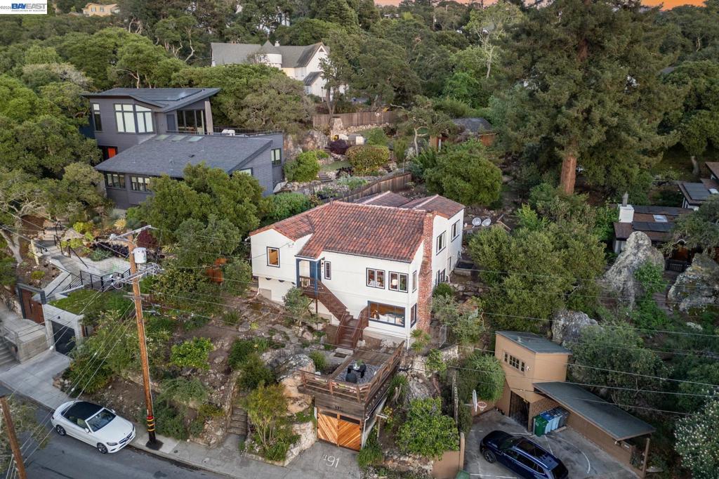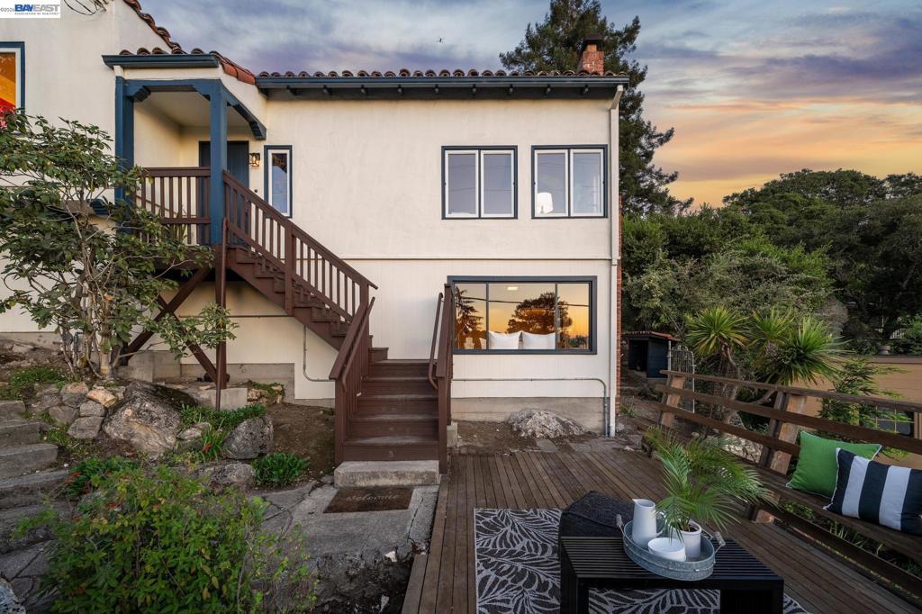 Tucked away in Berkeley’s coveted Thousand Oaks neighborhood, this architecturally rich and playful 3+BD/2BA Spanish Revival embraces natural beauty, beginning with an outdoor seating area bordered by one of Berkeley’s classic glacial erratics. The 1898 SQFT home opens to a cozy living room with San Francisco Bay views, beamed ceiling, vintage fireplace, and hardwood floors throughout. A wrought iron bannister leads to the bright dining room and adjacent kitchen with Bosch and Miele appliances, plus laundry with new W/D. Upstairs bedrooms feature high ceilings and French doors opening to a deck and an untouched, oversized backyard. The yard is a massive private park with mature oaks, a footbridge, ancient boulders, and fruit trees. The upper level includes a full bath and flexible room with built-ins for office or play. Downstairs offers another flexible space with exterior access and a sunny bedroom with ensuite bath. Upgrades include new electrical panel and EV charger wiring. A one car detached garage ensures off-street parking. Ideally situated near Solano Ave, Colusa Circle, parks, and Thousand Oaks Elementary. Energy Assessment score: 4