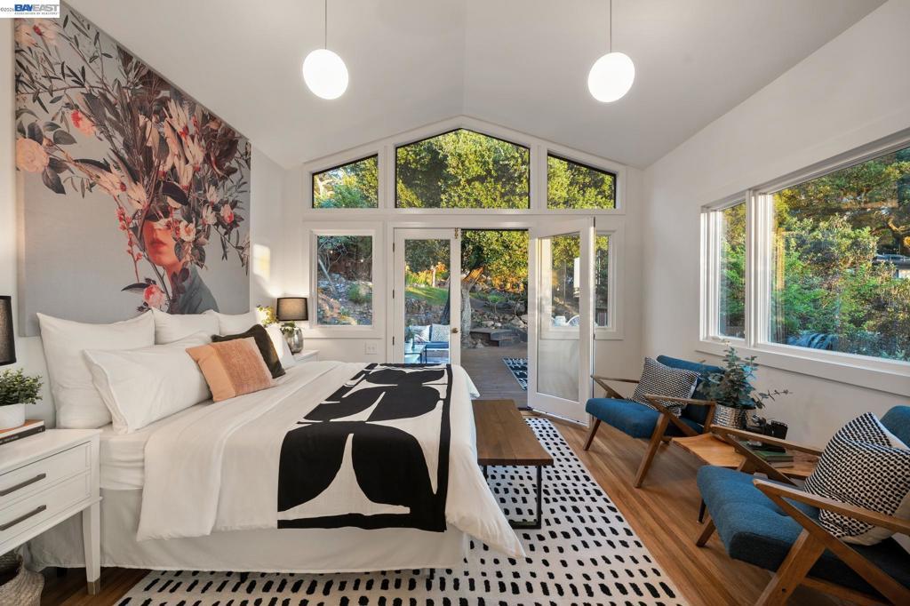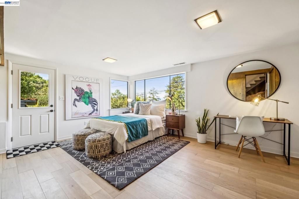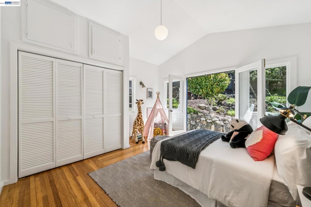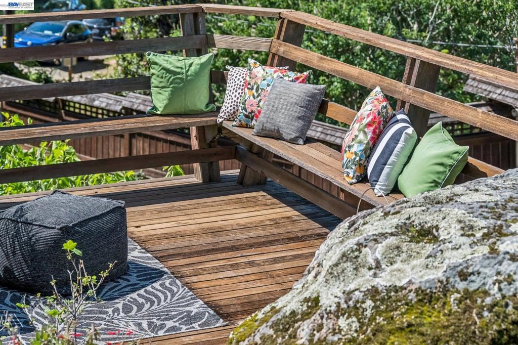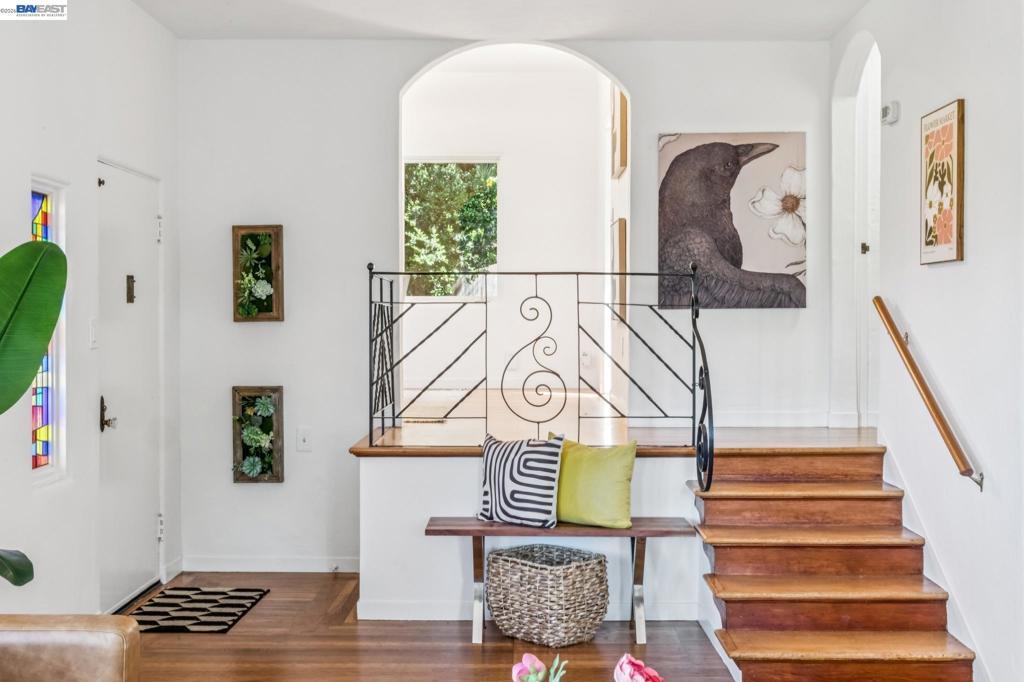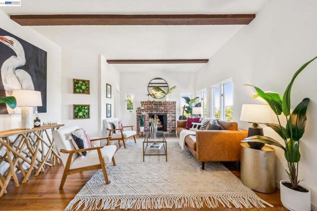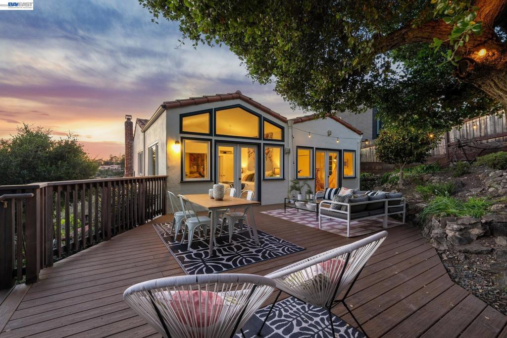 Tucked away in Berkeley’s coveted Thousand Oaks neighborhood, this architecturally rich and playful 3+BD/2BA Spanish Revival embraces natural beauty, beginning with an outdoor seating area bordered by one of Berkeley’s classic glacial erratics. The 1898 SQFT home opens to a cozy living room with San Francisco Bay views, beamed ceiling, vintage fireplace, and hardwood floors throughout. A wrought iron bannister leads to the bright dining room and adjacent kitchen with Bosch and Miele appliances, plus laundry with new W/D. Upstairs bedrooms feature high ceilings and French doors opening to a deck and an untouched, oversized backyard. The yard is a massive private park with mature oaks, a footbridge, ancient boulders, and fruit trees. The upper level includes a full bath and flexible room with built-ins for office or play. Downstairs offers another flexible space with exterior access and a sunny bedroom with ensuite bath. Upgrades include new electrical panel and EV charger wiring. A one car detached garage ensures off-street parking. Ideally situated near Solano Ave, Colusa Circle, parks, and Thousand Oaks Elementary. Energy Assessment score: 4