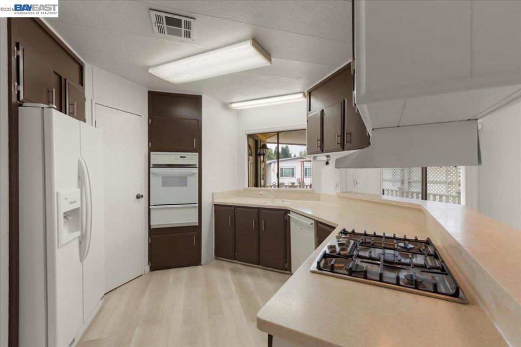 Senior Park Community with mandatory Guidelines and Park Residency Requirements. Must be 55 Plus. Must be approved by Park Manager Very Spacious Unit with 1,620 square feet of Living space! Tons of Natural Lighting Throughout Unit! Modern Laminate Flooring Throughout! Open Kitchen concept to Living Area with Outdoor views. Kitchen is complemented by Corian counters, Newer Kitchen Gas Cook Top, Double Door Refrigerator, built in Storage Pantry and opens to living space. Primary Bedroom boasts Large walk-in Closet with convenient Storage and Lighting, Primary bath, Walk-In Shower W/Seat, Glass Sliding Doors and Roomy Linen Closet. Second Bedroom offers another Walk-In Closet, right off of Bedroom W/Stall Shower & Vanity W/Mirror. Indoor laundry room W/Washer & Dryer included. Nice rear yard could be for small dog or garden area. Property has a storage unit at the end of a two car carport. This entire Unit is Bright and Welcoming of the next new Owner to make it there Own! Exterior has newer paint, just 2 years fresh! Seller has moved to another property in park! Buyers will like all the room this Unit Offers, Unit located close to Rec room, pool, paths for strolling to meet the neighbors! Welcome to Vineyard Estates! Fireplaces: NO