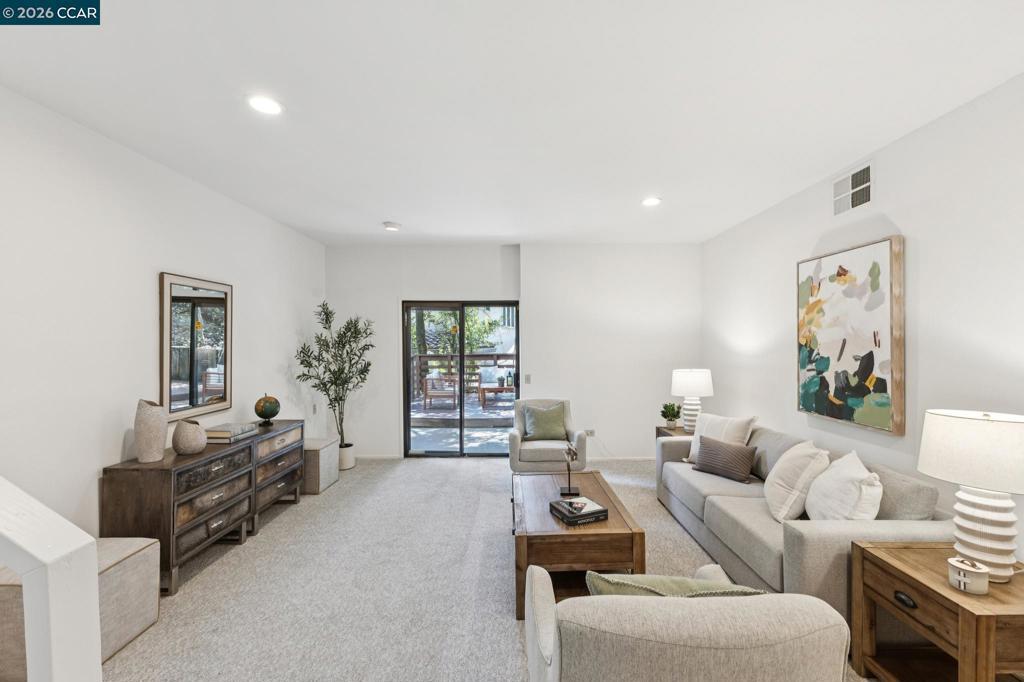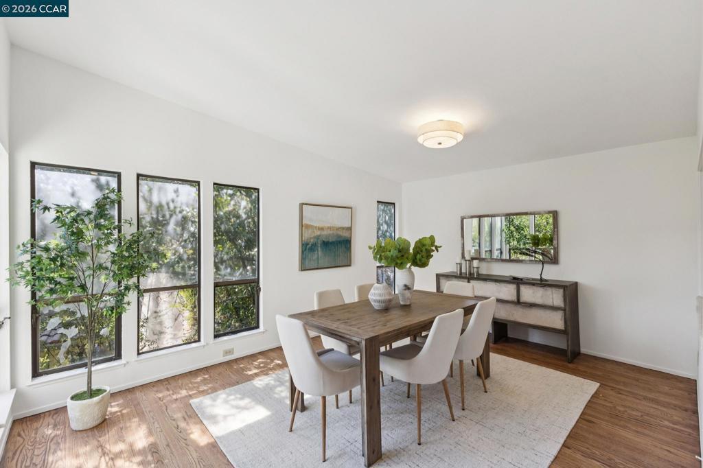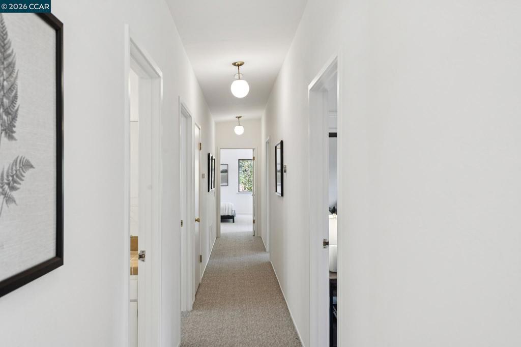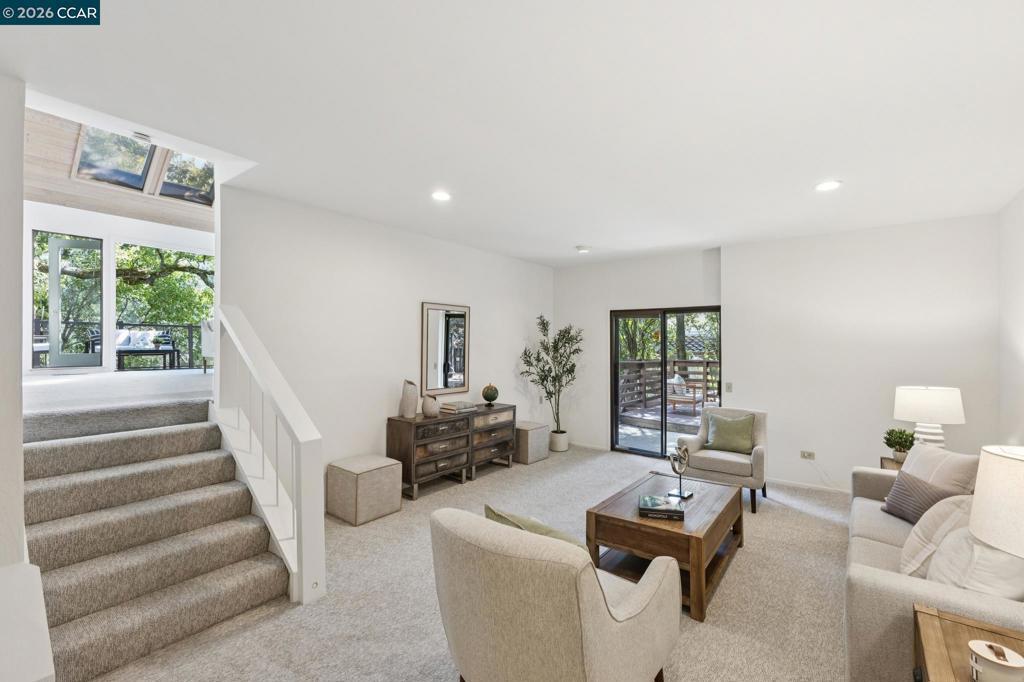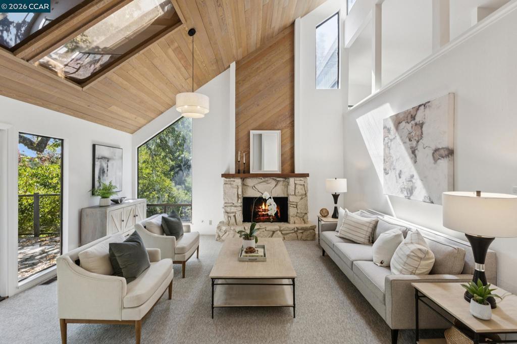 2462 sf, 3 BR plus bonus room, 2.5 BA located on .51 ac in North Orinda, built 1977. Nestled within nature and Oak trees, with privacy and unique gardens, offering multiple entertainment decks and a flat outdoor yard to enjoy. Light pours into the living spaces with huge Cathedral ceilings in the living room that extend up to the kitchen and dining room. A wood burning fireplace anchors the spacious living room that leads out to a sitting deck amongst the trees. Up a few steps there is a well-appointed open kitchen with new appliances and an island and plenty of cabinetry, that leads to an open dining room. Access from the kitchen leads to another magical deck with plenty of space for dining and entertaining among nature. Walk down a few steps and there is a large flat garden area that can be landscaped as you wish. A large Primary ensuite with views and an additional two, well sized bedrooms are down the hallway, complete with a laundry room. Downstairs is a potential large bedroom or bonus room with a half bath. Brand new quality carpet, refinished wood floors, freshly painted inside and out, original owner, this is the first time on the market and a true find Literally minutes to the freeway, downtown Orinda, with a bus stop at the end of the driveway. Miramonte HS.
