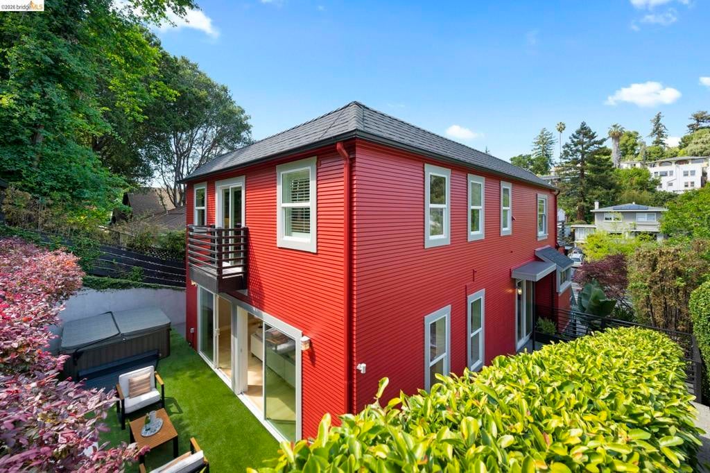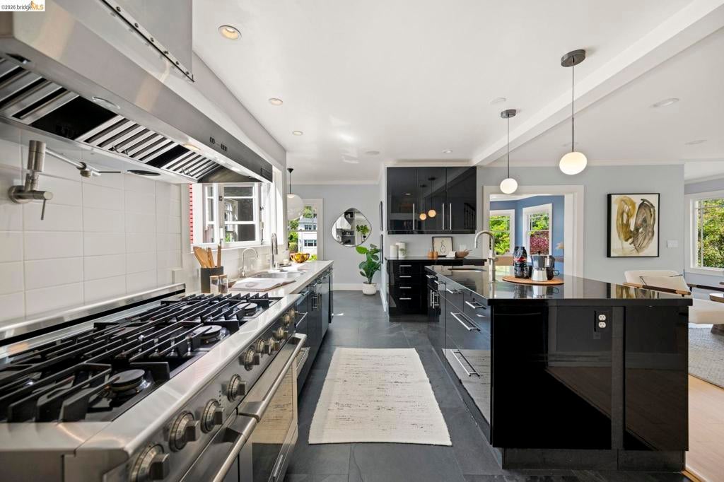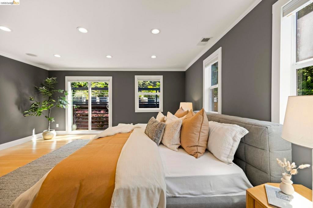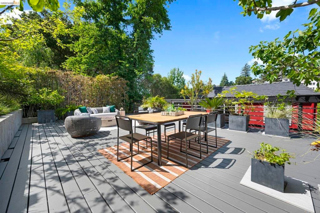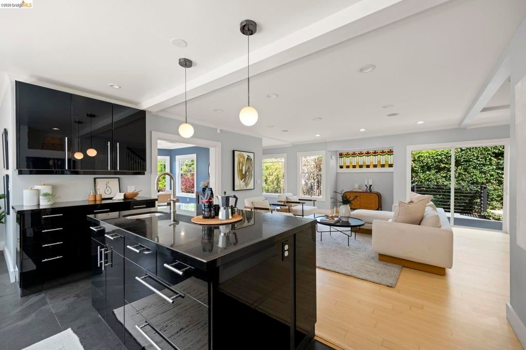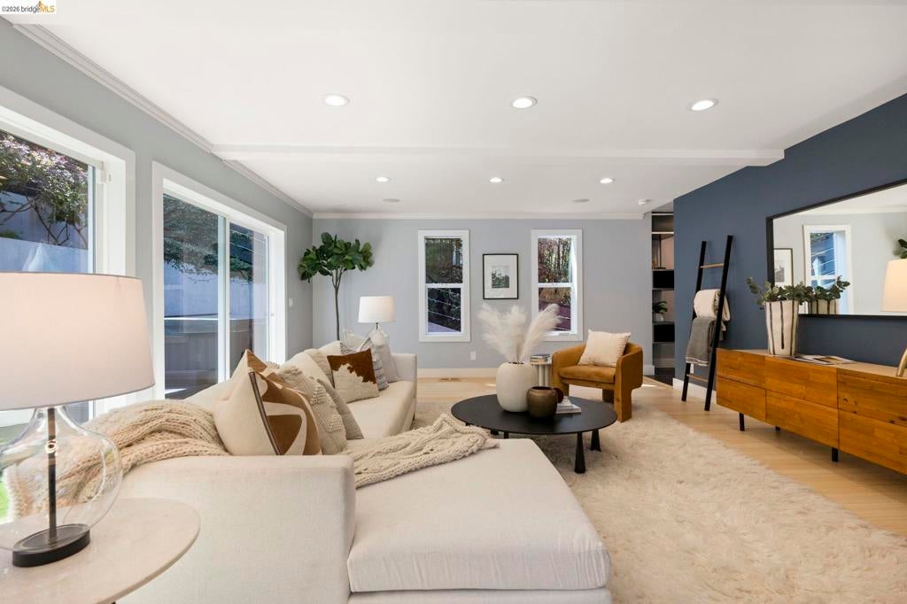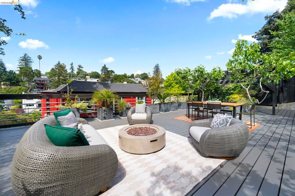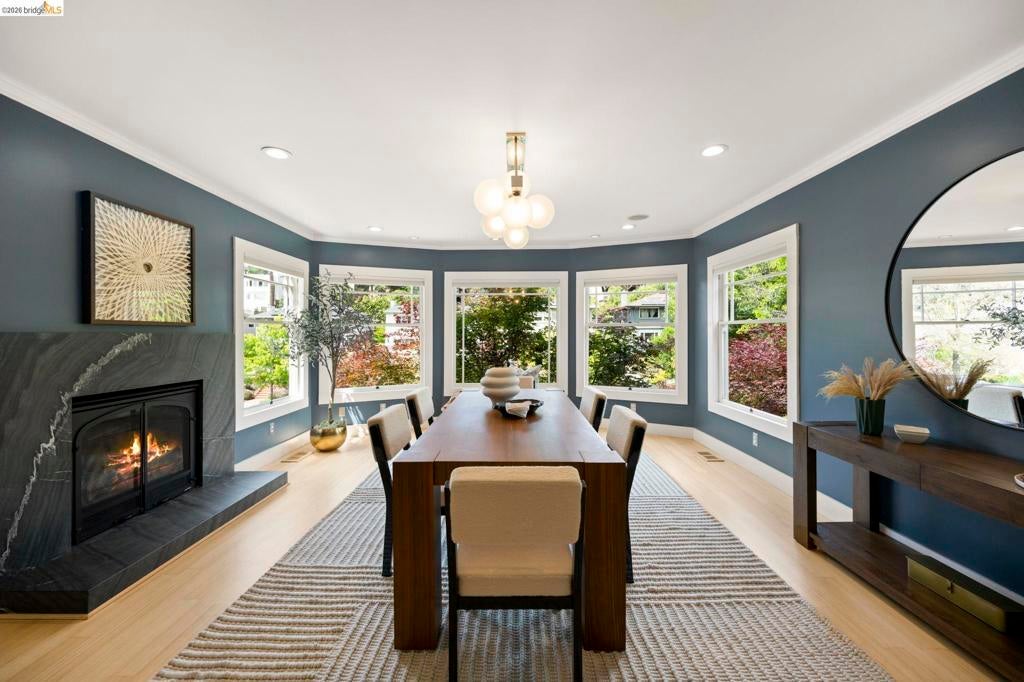 Contemporary Farmhouse Reimagined in the Heart of Crocker Highlands. Perched above the street, this rebuilt contemporary farmhouse blends classic character w/ modern design & thoughtful updates throughout. Expanded & re-engineered for enhanced flow & functionality, the home features light-filled interiors w/ an open great room connecting to a chef’s kitchen w/ high-end appliances, dual sinks, large island & ample storage—ideal for daily living & entertaining. Formal dining w/ bay windows & fireplace adds warmth & architectural presence. A rear living room opens to a level patio w/ hot tub & turf for seamless indoor-outdoor living, while an expansive upper-level view deck offers sweeping neighborhood views. Upstairs offers 4 bedrooms, including a spacious primary suite w/ balcony, a walk-in closet & spa-like bath, plus a second en suite & a full hall bath. Lower level includes a 5th bedroom or office w/ full bath & private entrance. Additional features include 2 parking spaces, including a 1-car garage w/ EV charger, solar, Tesla Powerwall, new roof & whole-house water filtration. Near award-winning Crocker Highlands Elementary, Lakeshore Ave shops, dining, Lake Merritt & easy Bay Bridge access.
