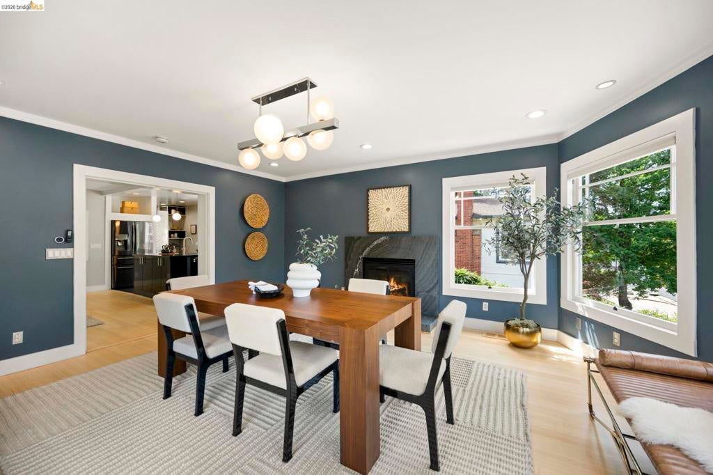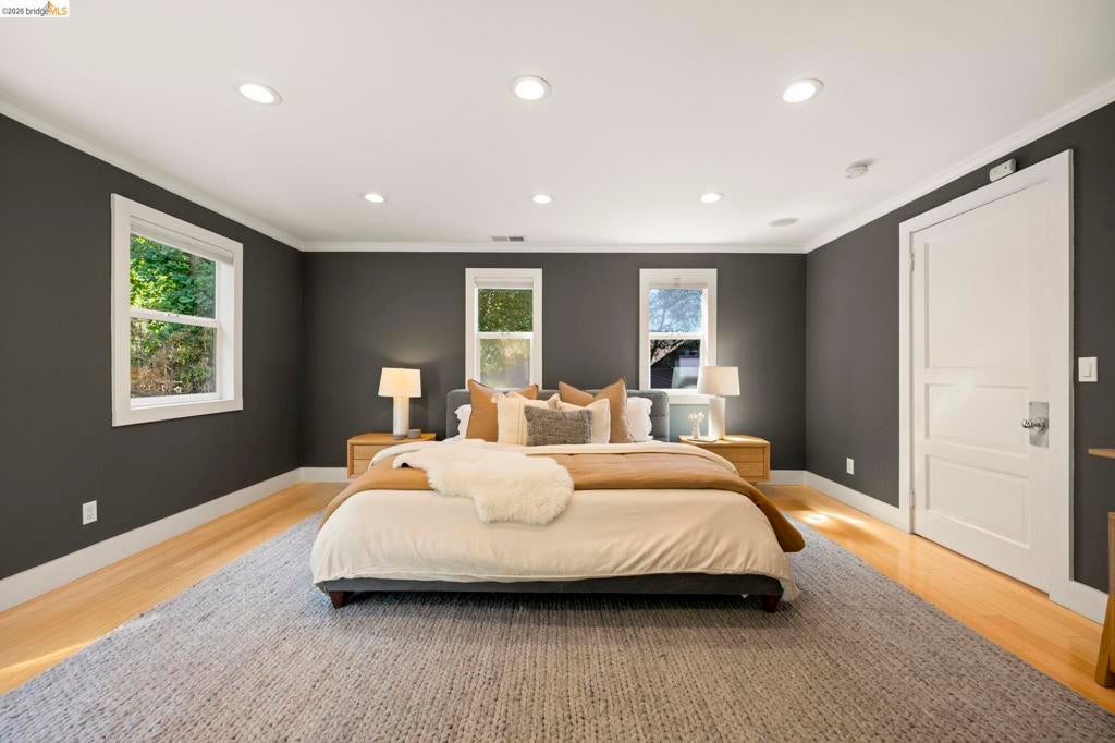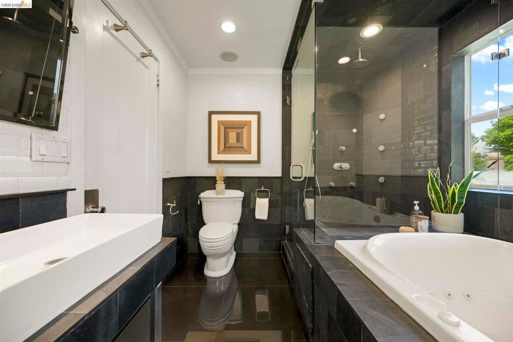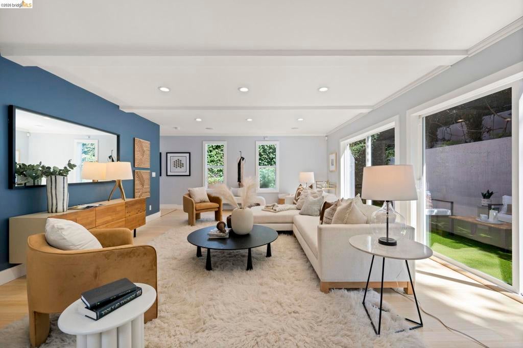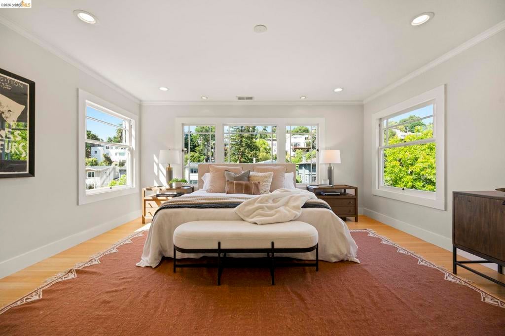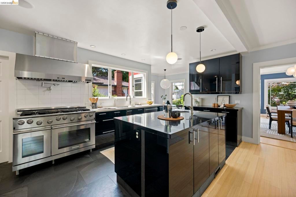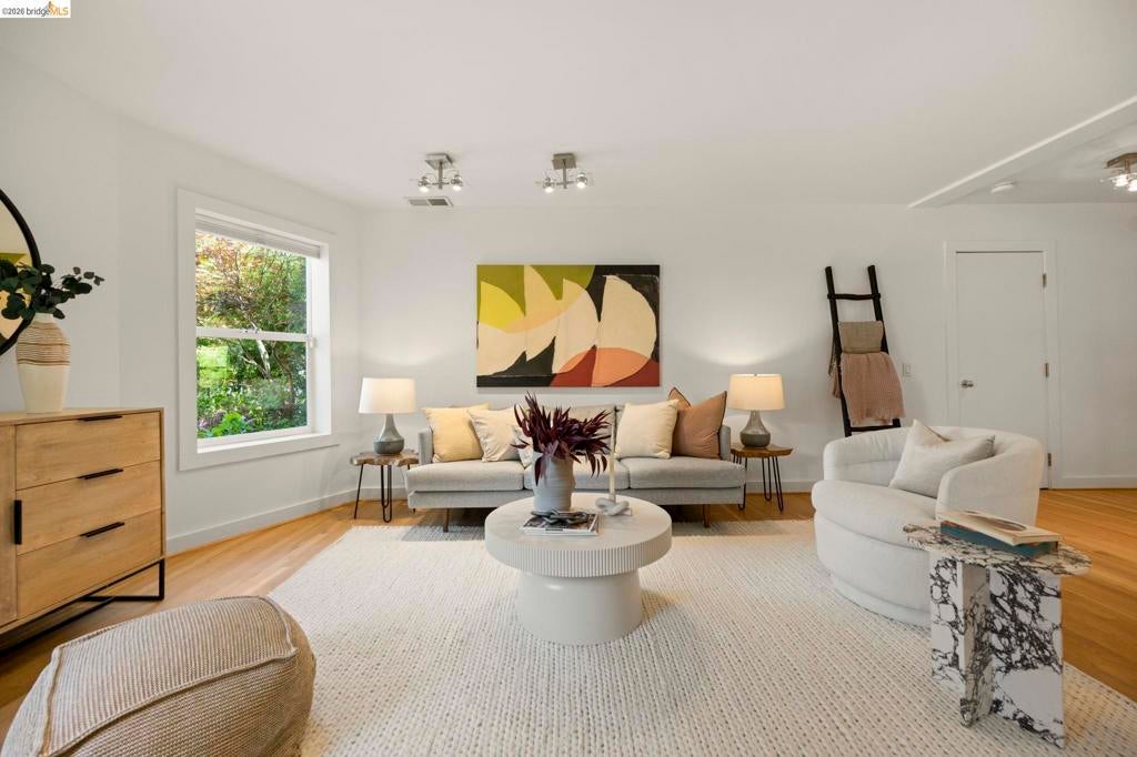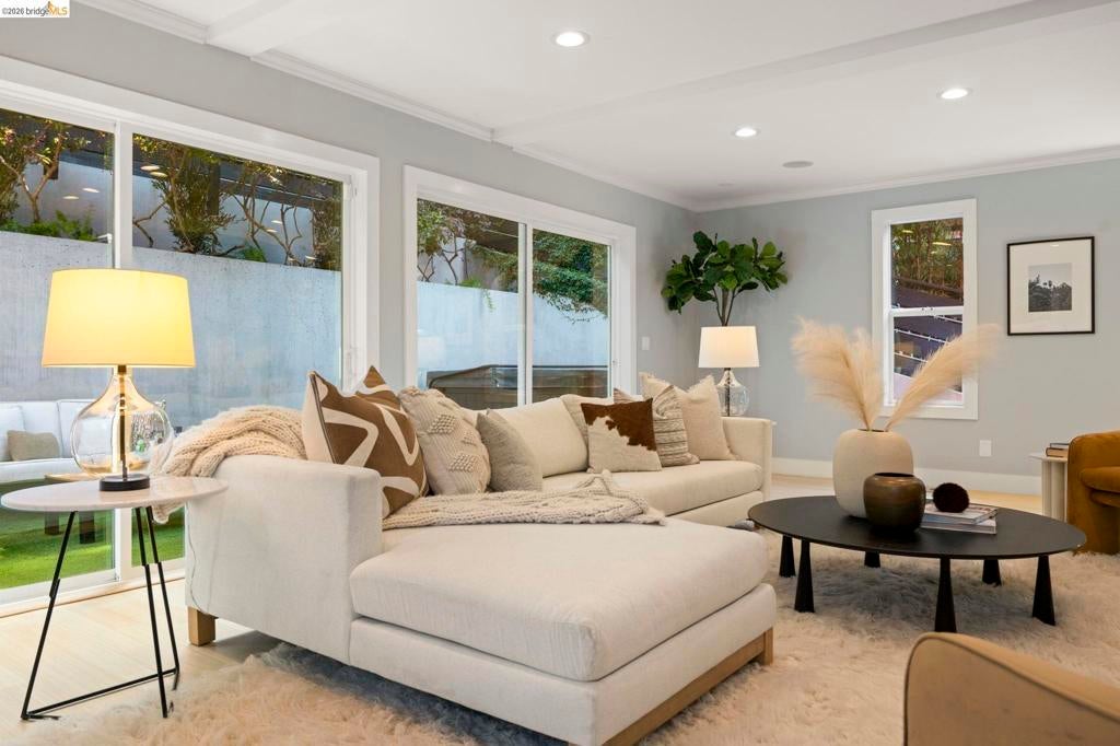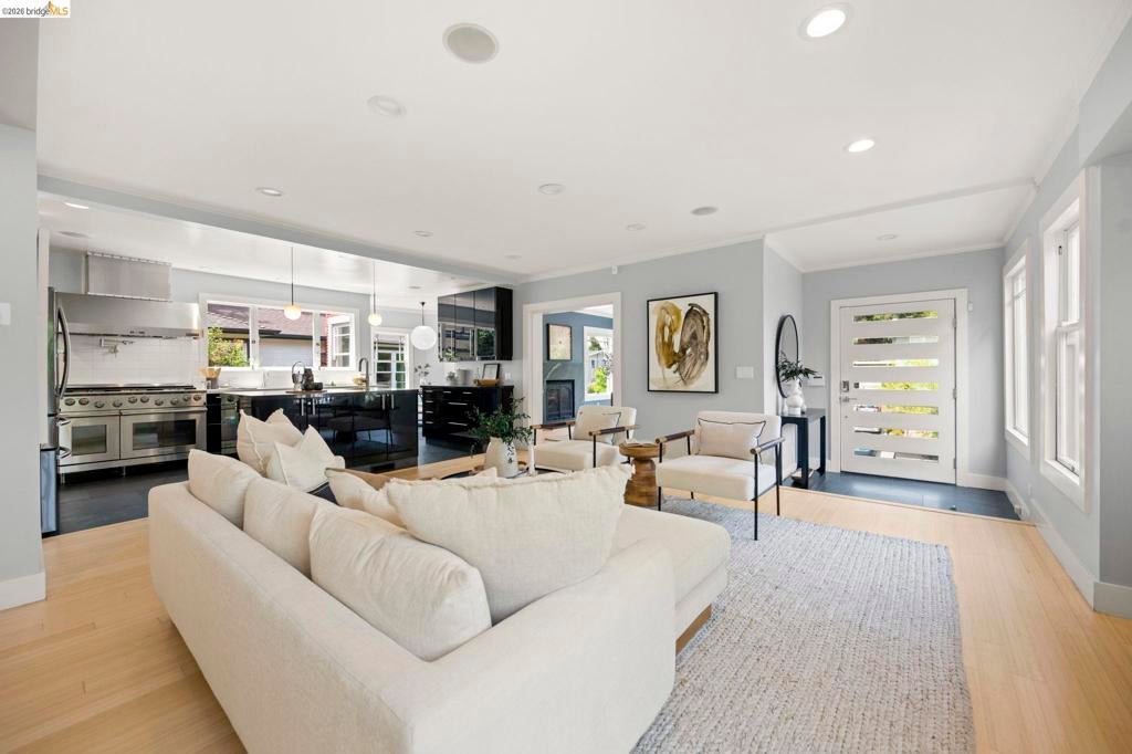 Contemporary Farmhouse Reimagined in the Heart of Crocker Highlands. Perched above the street, this rebuilt contemporary farmhouse blends classic character w/ modern design & thoughtful updates throughout. Expanded & re-engineered for enhanced flow & functionality, the home features light-filled interiors w/ an open great room connecting to a chef’s kitchen w/ high-end appliances, dual sinks, large island & ample storage—ideal for daily living & entertaining. Formal dining w/ bay windows & fireplace adds warmth & architectural presence. A rear living room opens to a level patio w/ hot tub & turf for seamless indoor-outdoor living, while an expansive upper-level view deck offers sweeping neighborhood views. Upstairs offers 4 bedrooms, including a spacious primary suite w/ balcony, a walk-in closet & spa-like bath, plus a second en suite & a full hall bath. Lower level includes a 5th bedroom or office w/ full bath & private entrance. Additional features include 2 parking spaces, including a 1-car garage w/ EV charger, solar, Tesla Powerwall, new roof & whole-house water filtration. Near award-winning Crocker Highlands Elementary, Lakeshore Ave shops, dining, Lake Merritt & easy Bay Bridge access.