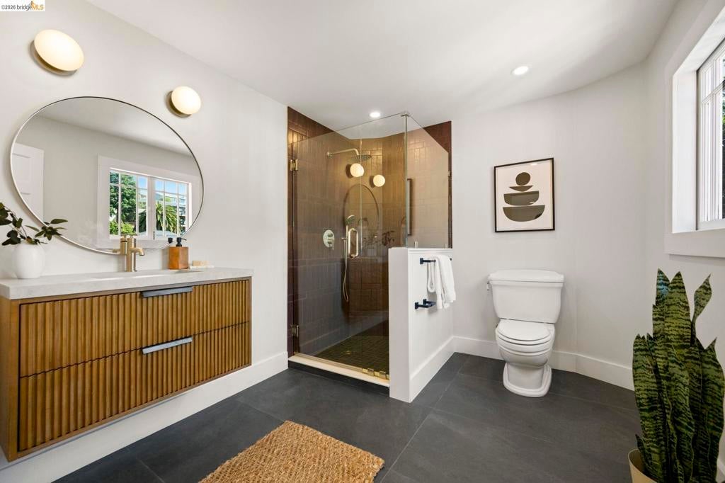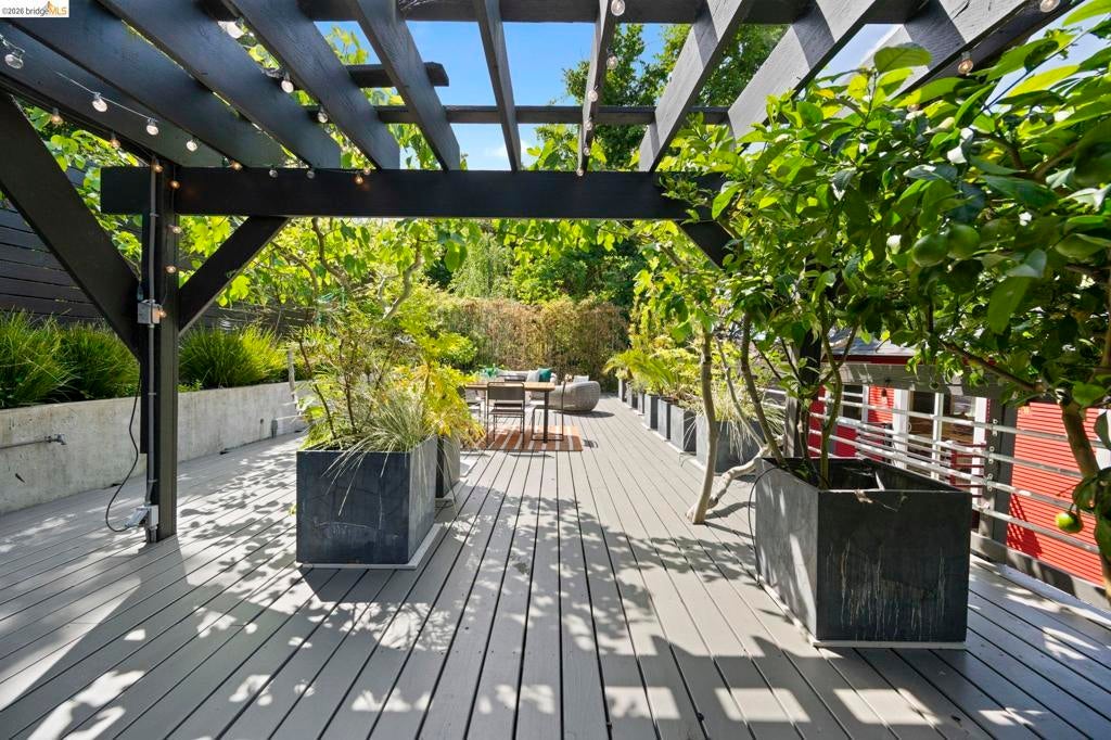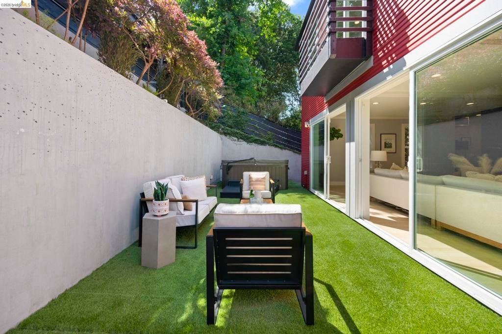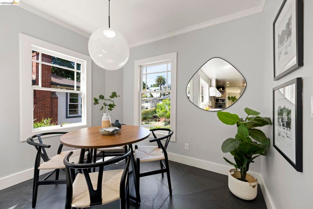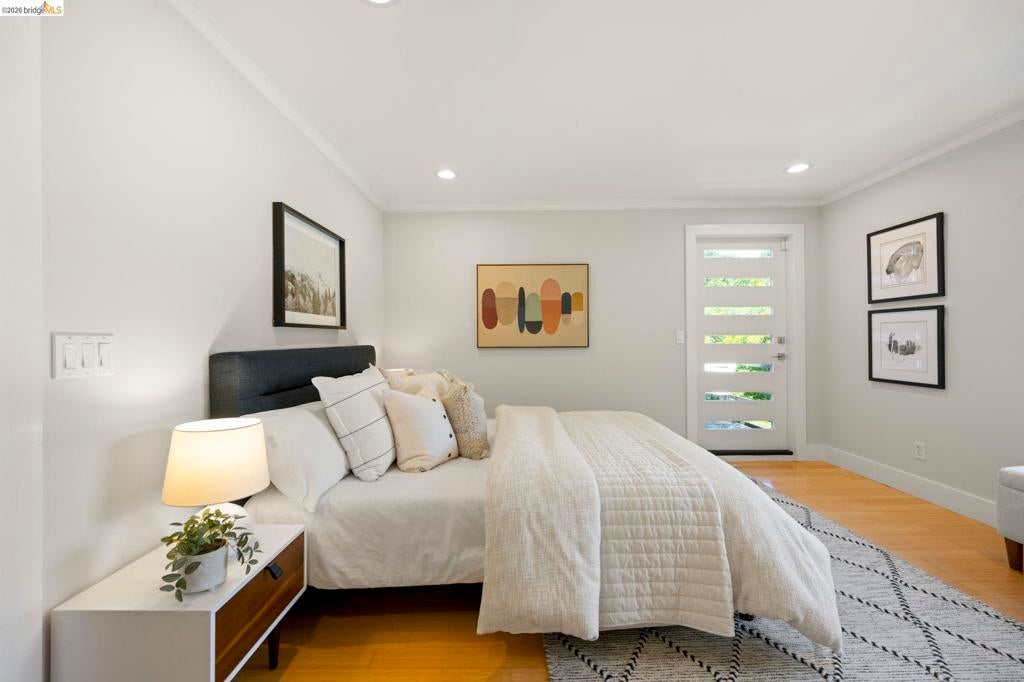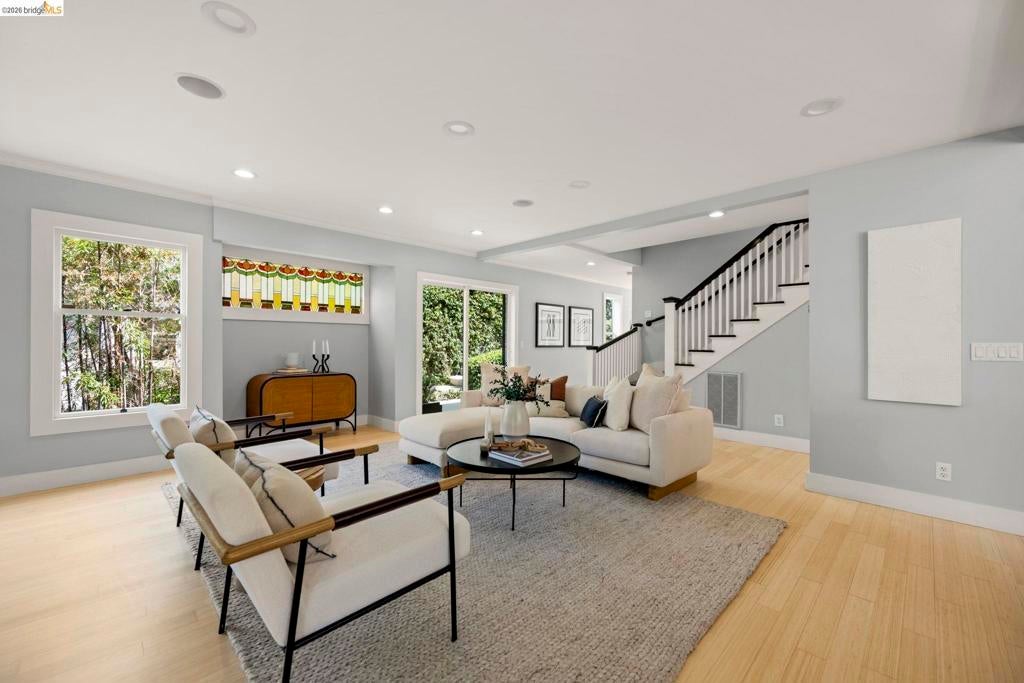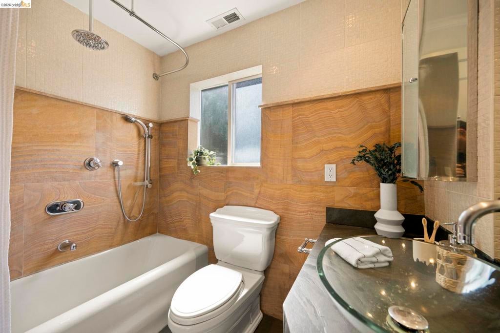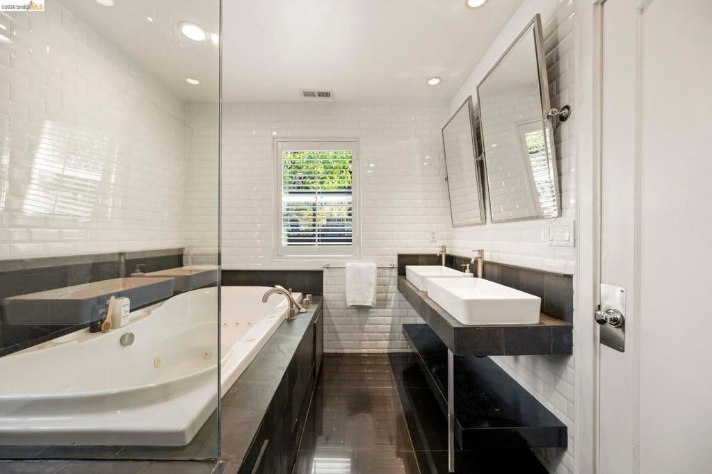 Contemporary Farmhouse Reimagined in the Heart of Crocker Highlands. Perched above the street, this rebuilt contemporary farmhouse blends classic character w/ modern design & thoughtful updates throughout. Expanded & re-engineered for enhanced flow & functionality, the home features light-filled interiors w/ an open great room connecting to a chef’s kitchen w/ high-end appliances, dual sinks, large island & ample storage—ideal for daily living & entertaining. Formal dining w/ bay windows & fireplace adds warmth & architectural presence. A rear living room opens to a level patio w/ hot tub & turf for seamless indoor-outdoor living, while an expansive upper-level view deck offers sweeping neighborhood views. Upstairs offers 4 bedrooms, including a spacious primary suite w/ balcony, a walk-in closet & spa-like bath, plus a second en suite & a full hall bath. Lower level includes a 5th bedroom or office w/ full bath & private entrance. Additional features include 2 parking spaces, including a 1-car garage w/ EV charger, solar, Tesla Powerwall, new roof & whole-house water filtration. Near award-winning Crocker Highlands Elementary, Lakeshore Ave shops, dining, Lake Merritt & easy Bay Bridge access.