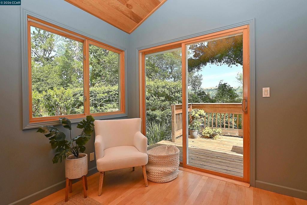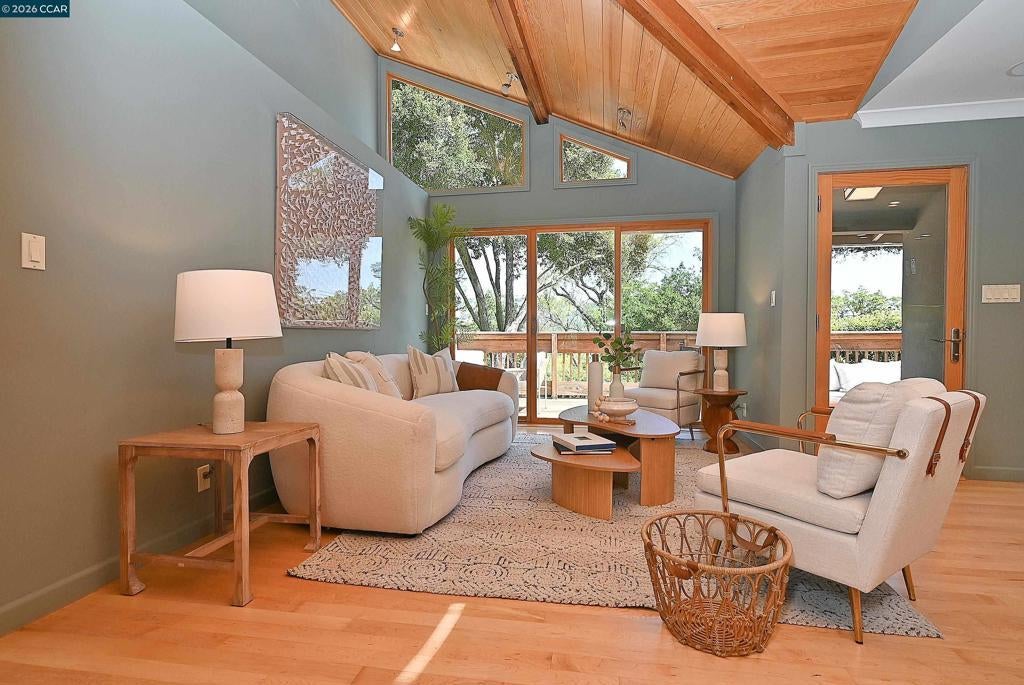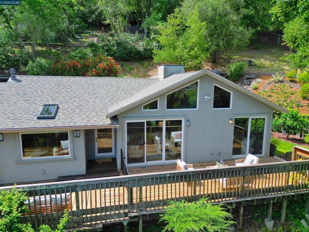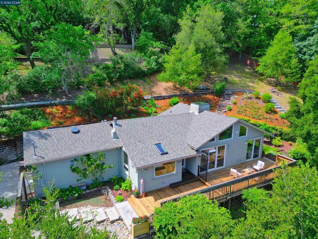 Tucked among the trees in Lafayette is this custom modern home with seamless indoor-outdoor flow, rebuilt from the studs in 2011 with new electrical, plumbing, a tankless water heater, and air conditioning. Vaulted wood ceilings, expansive windows, and open living spaces lead to large decks with tranquil tree views, creating ideal indoor-outdoor living with multiple sitting and entertaining areas. The kitchen features honed black granite counters, a gas stove, custom bamboo cabinets, and all appliances included. Public records show 1 bedroom and 1 bath, but an additional room functions as a second bedroom; it has a window and closet. The home includes tv surround sound and music speakers in all rooms, recessed lighting, and art spotlights. Fully landscaped grounds feature a spa on the back deck, a gazebo sitting area, a rock waterfall, a tool shed, a garden, and several private spaces to relax and enjoy nature. A new sewer line was installed in 2023, and the seller has plans for a potential additional home, adding flexibility and future opportunity. Check out Zillow Showcase for virtual floor plan, staging options and more! ** Open Tues (April 21) 10-1pm.**