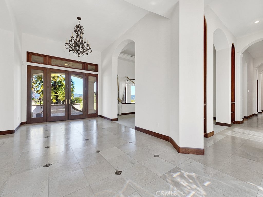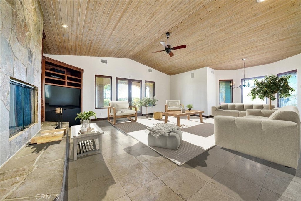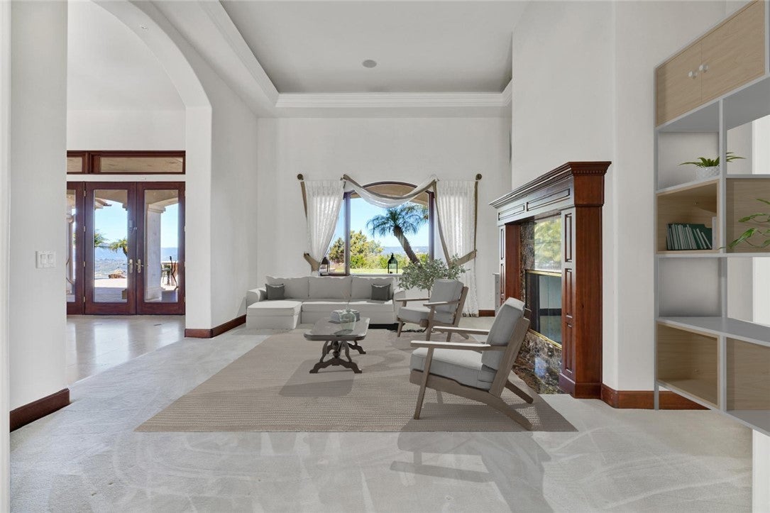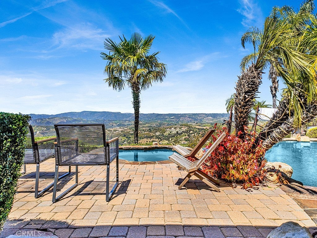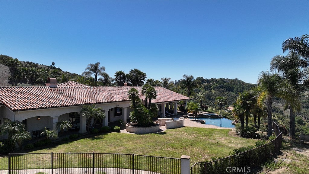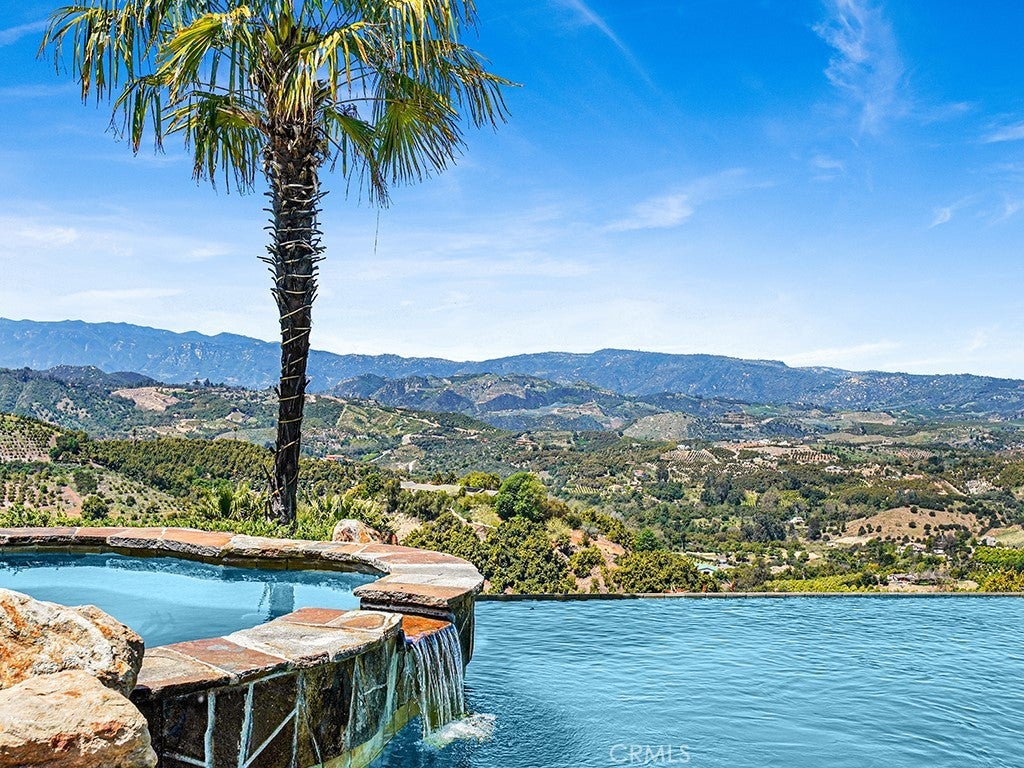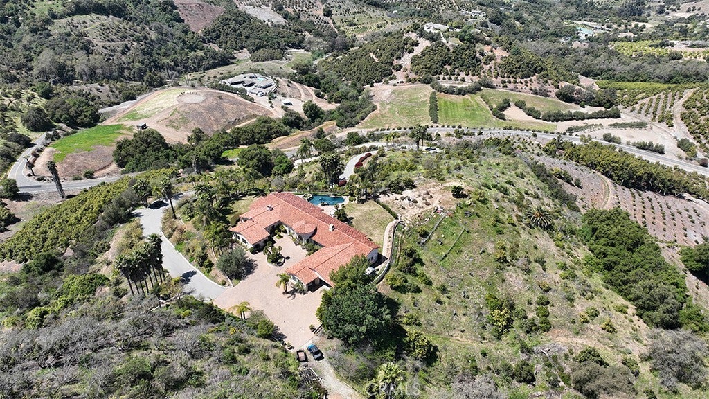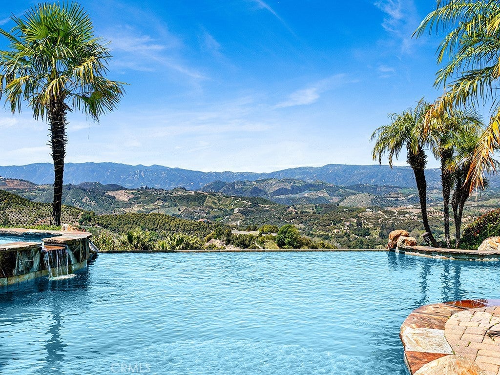 THE EXQUISITE ABODE. A winding driveway guides you to this stunning estate, meticulously crafted and designed to the highest standards. Nestled on over 19 acres, it offers breathtaking views. This 4800 sq.ft residence features 3 spacious bedrooms plus an art/hobby room that could serve as a 4th bedroom. The office/library is unparalleled, boasting built-ins and custom cabinetry. The chef's kitchen is a delight, equipped with a large granite island, prep sink, custom cabinetry, and a sizable pantry. The elegant family room showcases vaulted ceilings and a custom stone fireplace, with French doors leading to the picturesque grounds. Quality abounds with 8 ft. solid mahogany doors, coffered ceilings, leaded glass entry doors, Pella windows, surround sound indoors and out, security cameras, and 2 by 6 construction. An impressive game room with a massive entertainment bar complements the functional floor plan, ideal for both entertainment and family living. The luxurious master suite boasts an elegant bath with a large shower and a delightful soaking tub, along with two spacious closets. The interior is adorned with beautiful travertine flooring and enjoys abundant natural light. Enveloped by 19.77 acres of stunning grounds, including lush lawns and custom pavers in the front and back. An infinity edge pool beckons, accompanied by a fantastic barbecue area with granite counters and expansive covered patios. Revel in the spectacular views and soothing water features, all within the exclusive enclave of Deluz. The property also boasts numerous avocado trees, fruit trees, and guava trees. An absolute must-see!