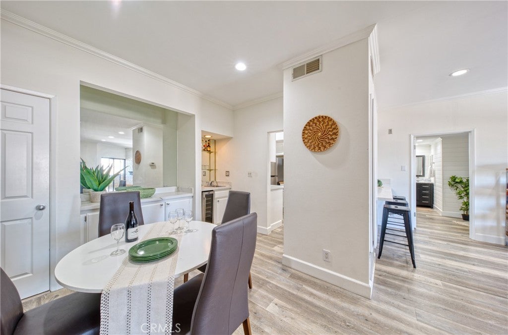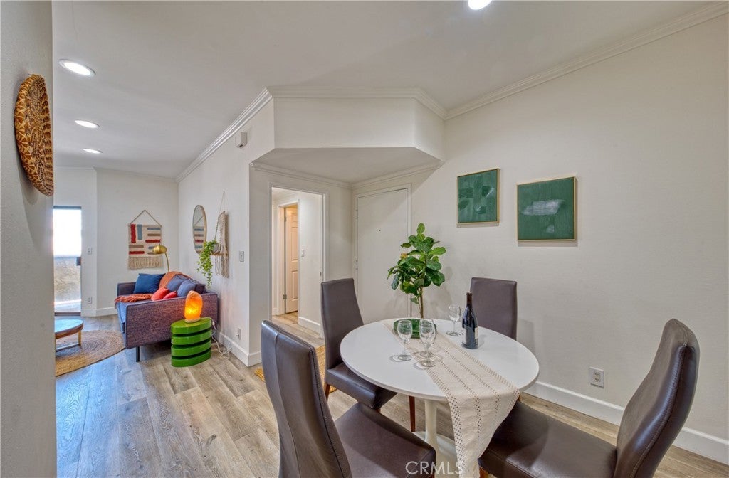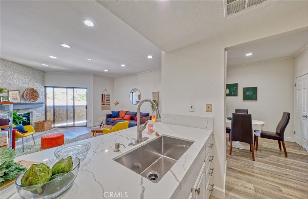 Welcome tastefully updated top-floor, single-level condo, offering a perfect blend of modern comfort and style. This spacious 2-bedroom, 2-bathroom residence boasts an open-concept floor plan, ideal for contemporary living. Step inside and be greeted by the elegant, wide-plank wood vinyl flooring and recessed lighting that flows throughout the entire unit, creating a warm and inviting atmosphere. The heart of the home is the living room, featuring a cozy gas fireplace, perfect for relaxing evenings. The kitchen showcases classic white cabinetry, sleek stainless steel appliances, bar seating and ample counter space for all your culinary endeavors. The dining area offers built-in storage along with a wet bar and a wine fridge. The unique layout provides ultimate privacy with two master bedrooms situated on opposite sides of the unit. Each bedroom is a serene retreat with its own en-suite bathroom. This unit is equipped with in-unit laundry, central air, and heating for year-round comfort. Additional perks include a dedicated storage unit within the building and two tandem parking spaces, ensuring convenience and peace of mind. Located in a prime area, you'll be just moments away from the vibrant dining and entertainment of Little Tokyo West on Sawtelle, as well as everyday conveniences like Target. With easy access to major freeways, commuting is a breeze. The HOA dues include earthquake insurance, adding an extra layer of security to your investment.