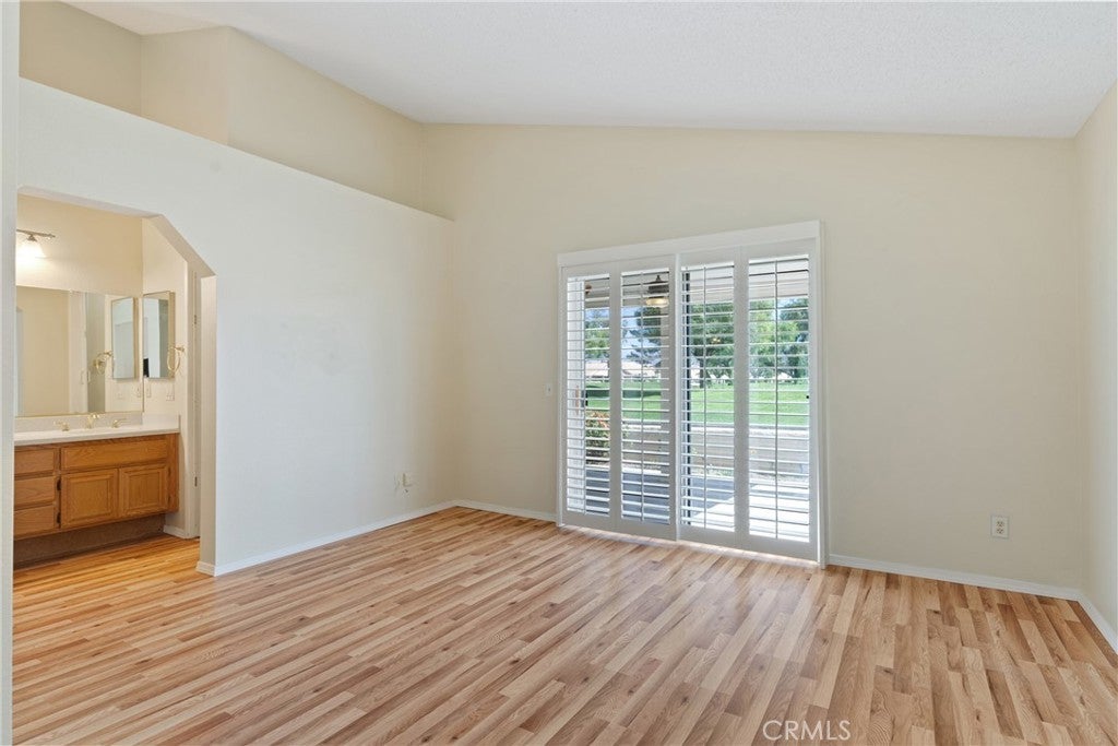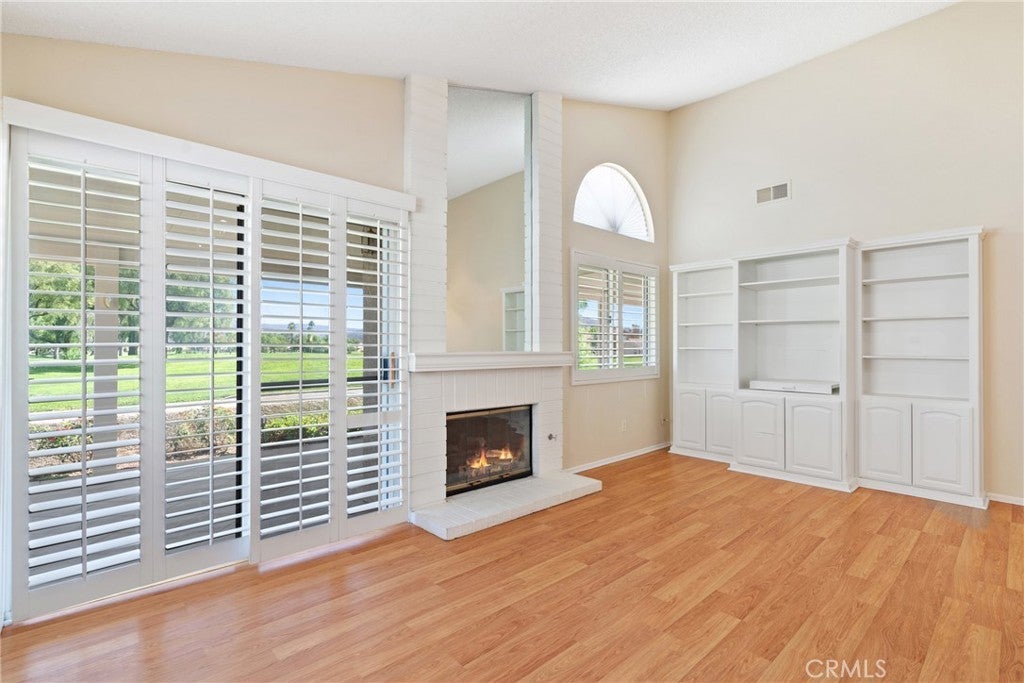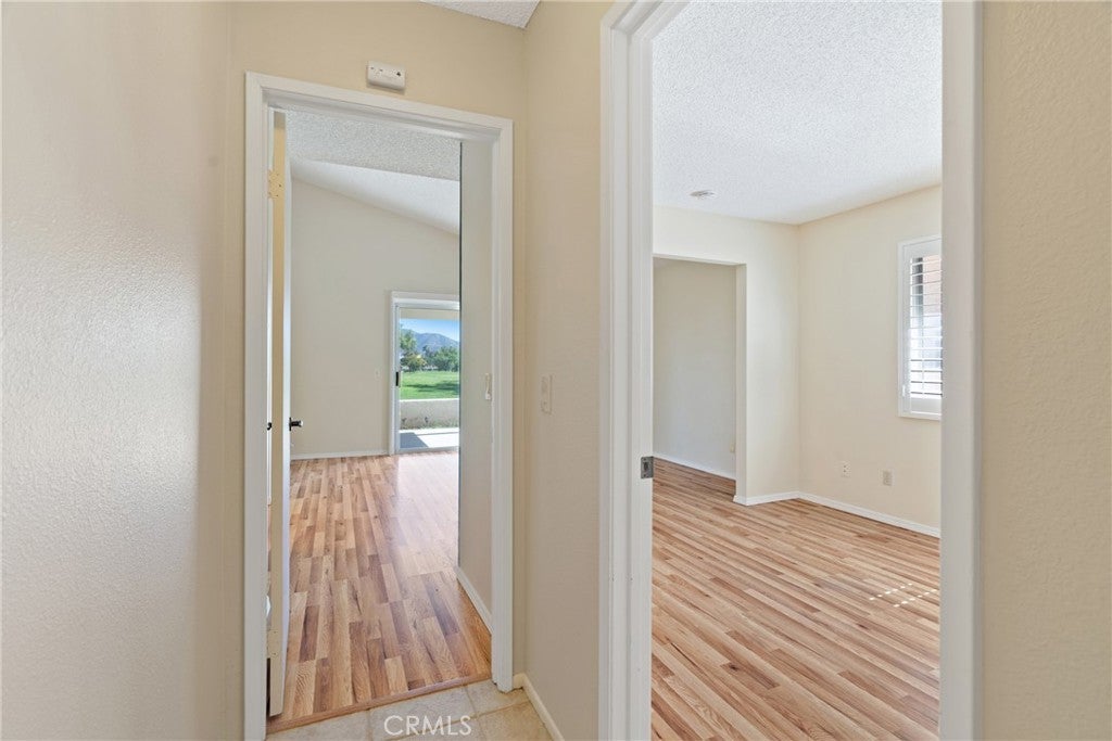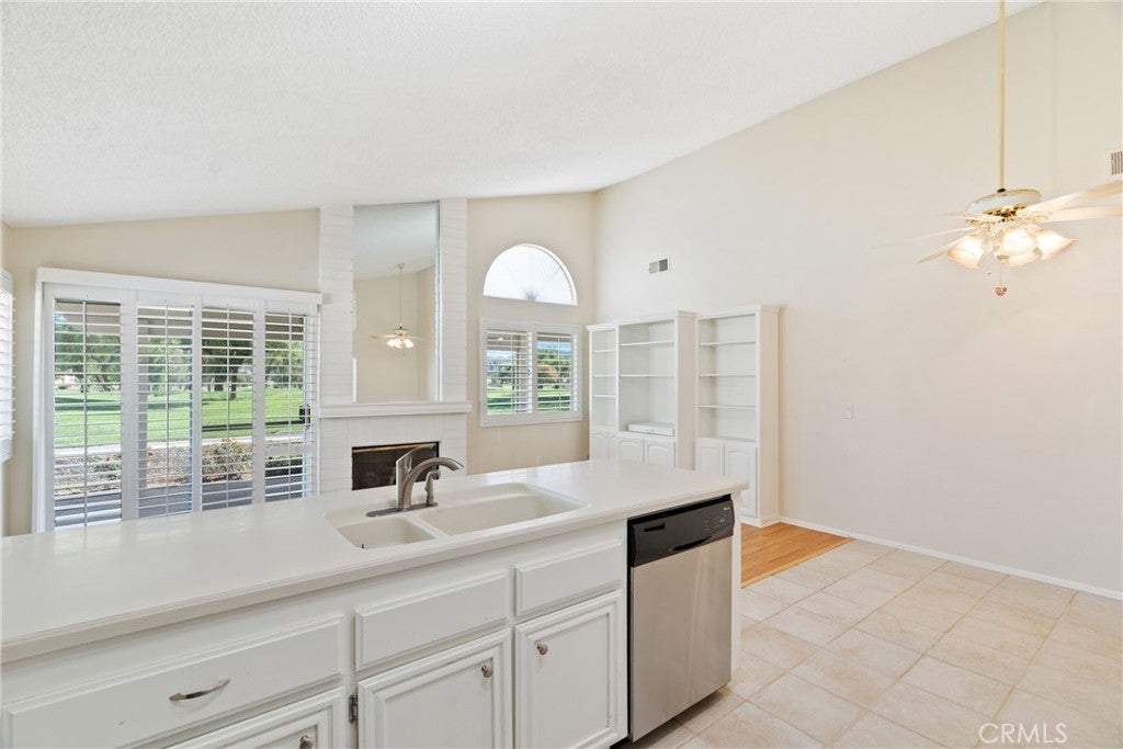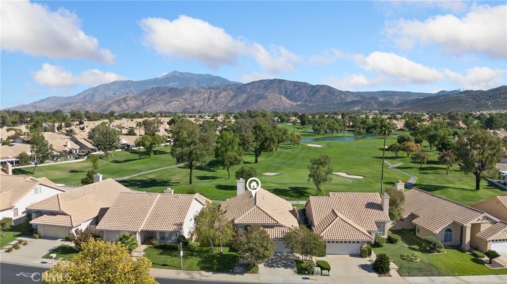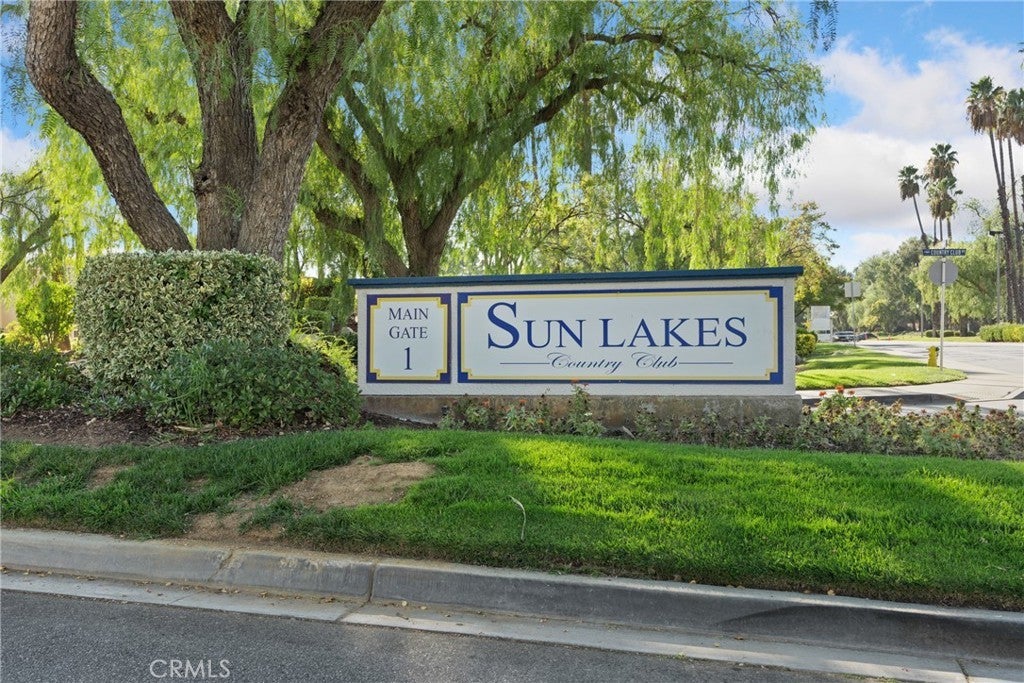 Situated on the first hole of the stunning Sun Lakes golf course, this Riviera model home offers beautiful views and a thoughtfully designed layout. The residence features wood laminate flooring throughout the living areas and bedrooms, complemented by ceramic tile in the entry, kitchen, hallways, and baths. Plantation shutters in the family room and primary suite add a touch of elegance. The kitchen is finished with Corian countertops, while the remodeled primary bath boasts dual sinks, Corian counters, and a custom-tiled shower. A versatile sitting area off the primary suite can be used as an office, reading nook, or easily converted into a third bedroom. The primary also includes a walk-in closet and sliding doors that open to the back patio overlooking the captivating golf course view. Outdoor living is enhanced with an Alumawood patio cover and tiled patio flooring, creating a perfect space to relax or entertain. The garage provides ample storage with built-in cabinets and an epoxy floor finish. Located in the highly desirable Sun Lakes Country Club, a 55+ guard-gated community, residents enjoy two golf courses, three clubhouses, multiple pools and spas (including an indoor pool), fitness centers, tennis and pickleball courts, dining, and a vibrant calendar of activities. Internet and cable are included in the HOA, and there is no Mello-Roos tax. Conveniently close to freeways and some of the best shopping in Southern California.