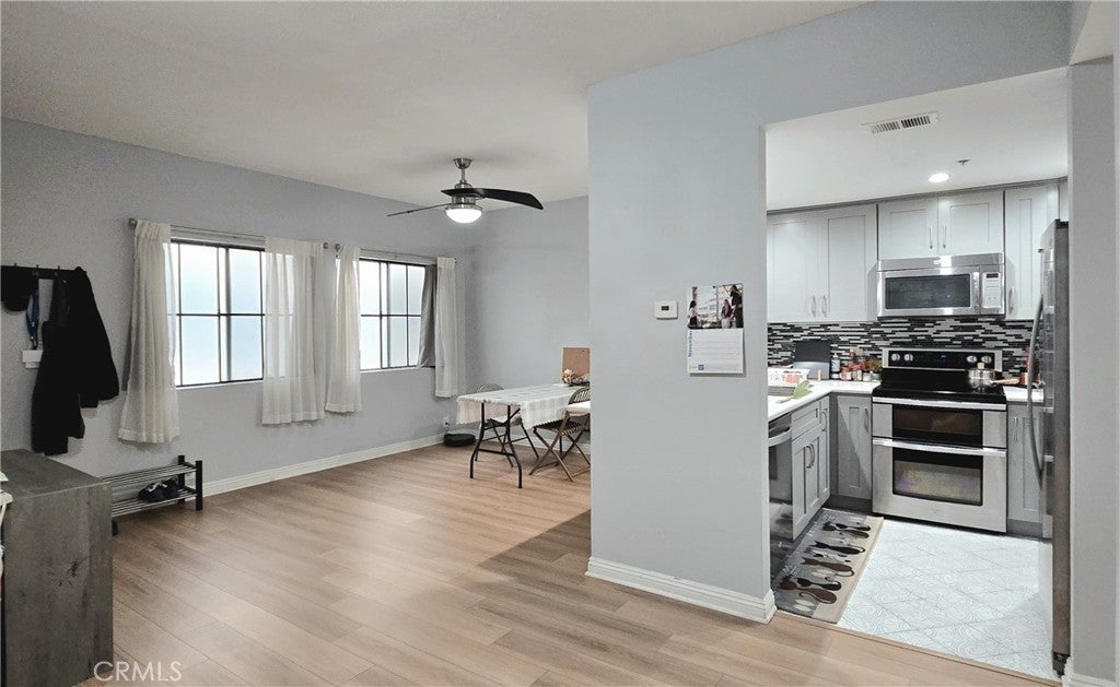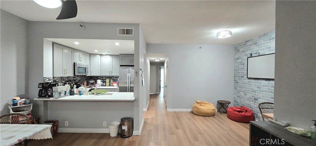 Discover this stunning urban retreat featuring 2 bedrooms, 2 bathrooms, 2 parking spots, and in-unit full-sized, stackable laundry. Spanning 957 square feet, this modern condo embodies stylish and convenient downtown living. Inside, you'll find numerous upgrades, including a beautifully remodeled kitchen with custom cabinetry, glass tiled backsplash, matte quartz countertops, stainless steel appliances, sleek ceramic flooring, and a breakfast bar. The open-concept design connects the kitchen to the living and dining areas, accented by a trendy faux-brick feature wall. Both bedrooms are generously sized, each with dual-pane sliding doors opening onto a shared balcony overlooking outdoor amenities such as a BBQ and picnic tables below. The primary bedroom boasts an eye-catching accent wall and a private spa-like en-suite bathroom, while the second bedroom provides direct access to the adjacent full bathroom, conveniently positioned across the hallway from the laundry area with a pocket door. Both bathrooms are elegantly finished with geometric tile floors, quartz vanities, and oversized white wave tiled tubs/showers. The bedrooms include ample closet space and built-ins, complemented by the luxury vinyl flooring that extends throughout most of the home. The Golden Gate Square HOA fee is $320/month, covering water, sewer, trash, building maintenance, gym access, community room, and insurance. Located in the heart of downtown Long Beach, this condo offers easy access to dining, entertainment, shopping, parks, and major freeways. This is quintessential Southern California living! Host gatherings on the lush greenbelt, take advantage of the outdoor BBQ area and clubhouse and stay active with the on-site gym. Ideally located just steps from the beach, a scenic walking/bike path, boutique shops, and fantastic local dining options. Imagine the possibilities!