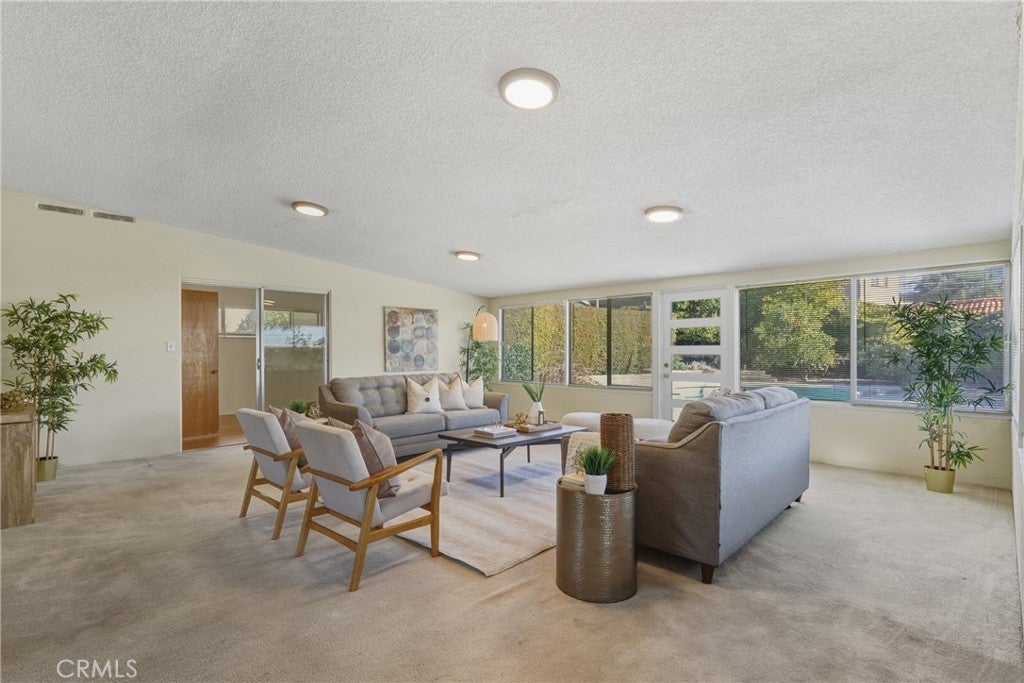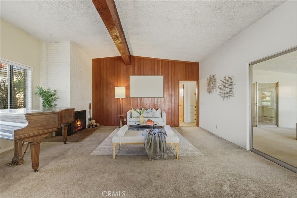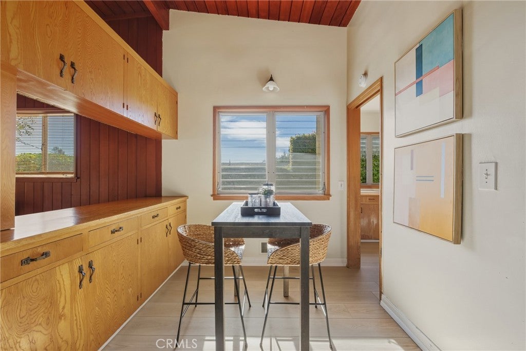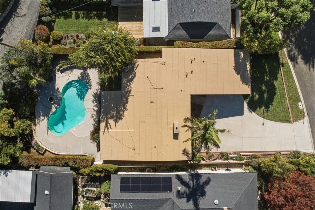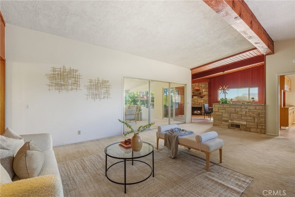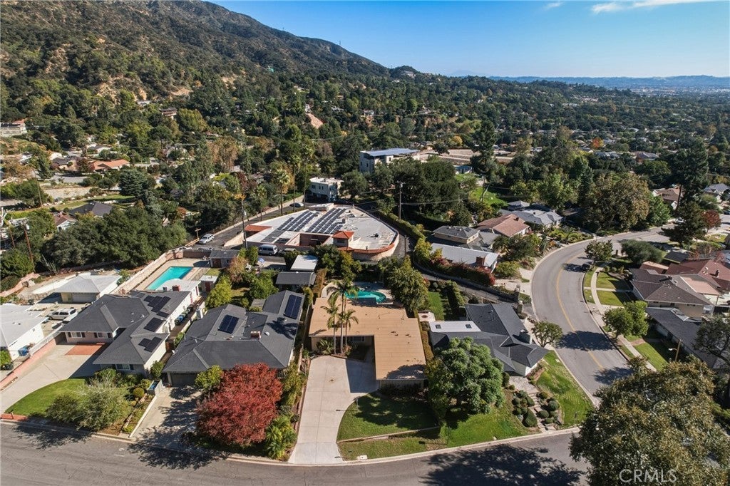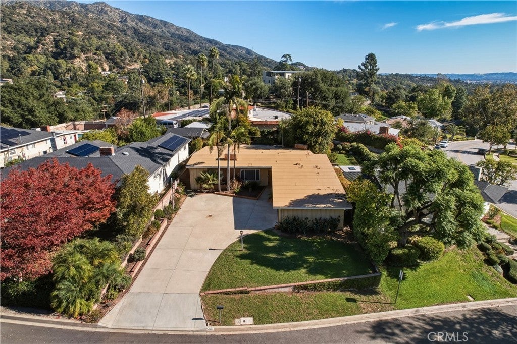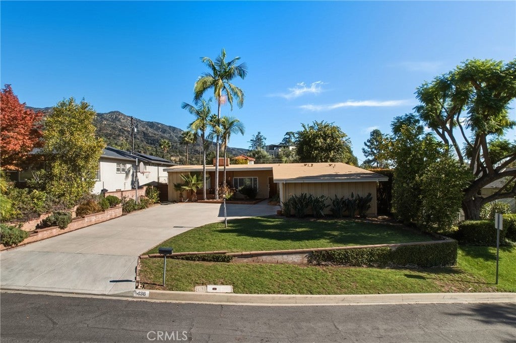 Discover this classic Mid-Century Modern gem tucked on a coveted North Monrovia cul-de-sac, situated on a large 10,374 square foot lot surrounded by lush, mature landscaping. From the hardwood-paneled front door, step into a bright living room featuring a corner white-brick fireplace, beamed ceiling, and wood-paneled accent wall. A flagstone half wall leads to the formal dining room with its own striking flagstone fireplace and wood ceiling—perfect for gatherings. The spacious family room, a 1970s addition, offers a wall of windows and direct access to the expansive backyard. A cozy breakfast area with ample wood cabinetry and beamed ceiling connects to the galley kitchen with abundant storage, double sink, stove, and microwave. The laundry room off the kitchen leads to a private bedroom with mirrored closet doors and a ¾ bath with original ceramic tile. Two additional bedrooms sit on the opposite wing and share a large full bath retaining its charming period details, including original ceramic tile, pink sink and tub, and hexagonal flooring. With over 2,200 square feet of living space, this home offers room to breathe and plenty of decorating options. The XL backyard is a true retreat with a kidney-shaped pool, firepit, large grassy area, fruit trees, and mountain views. Additional highlights include original hardwood floors, period-appropriate lighting, 2-year old top-of-the line pool equipment, central air & heat, a 2-car attached garage, and a spacious driveway. Move-in ready and filled with timeless character, this home beautifully blends mid-century style with everyday comfort.