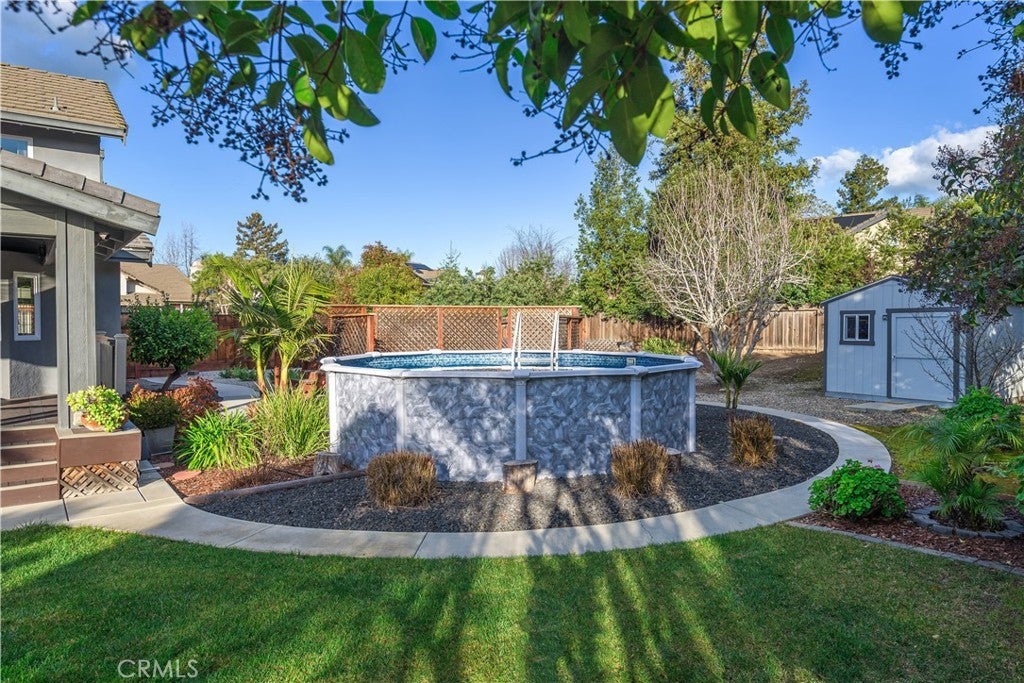 Step into this meticulously maintained 3,500 sq. ft home on a half acre, in the exclusive gated Cielo Vista community. The home features 4-bedrooms, 4-bathrooms, dedicated office, three wood burning fire places, and an impressive kitchen. The home was completely remodeled and landscaped between 2017 and 2020, with upgrades and stunning finishes. The downstairs primary suite features dual walk-in closets, separated sinks, a sizable vanity/dressing area and a private deck. Just off the foyer, you will find a a spacious office, with a double door entry. Ascend the majestic staircase overlooking the living room, to discover a large en-suite bedroom, and two additional bedrooms connected by a dual-entry bathroom. The heart of the home is the beautifully redesigned 400 sq. ft kitchen, equipped with Bosch appliances, Blanco sinks and a large 8’ x 4’ island with triple-sided cabinetry. Enjoy entertaining on your 22’ x 14’ covered Trex deck where you overlook a beautiful, private backyard with an 18’ circular above-ground pool and its own pool deck. A decorative fence separates the main backyard and the raised-bed garden, grape vines and several fruit trees, which provide plenty of home grown food to enjoy. Gated access on both sides of the house provides ample parking for RV, trailer and/or boats along with two large Tuff Sheds for additional backyard storage. The 3-car garage, featuring dual garage doors, is equipped with a 220V outlet for electric vehicle charging.