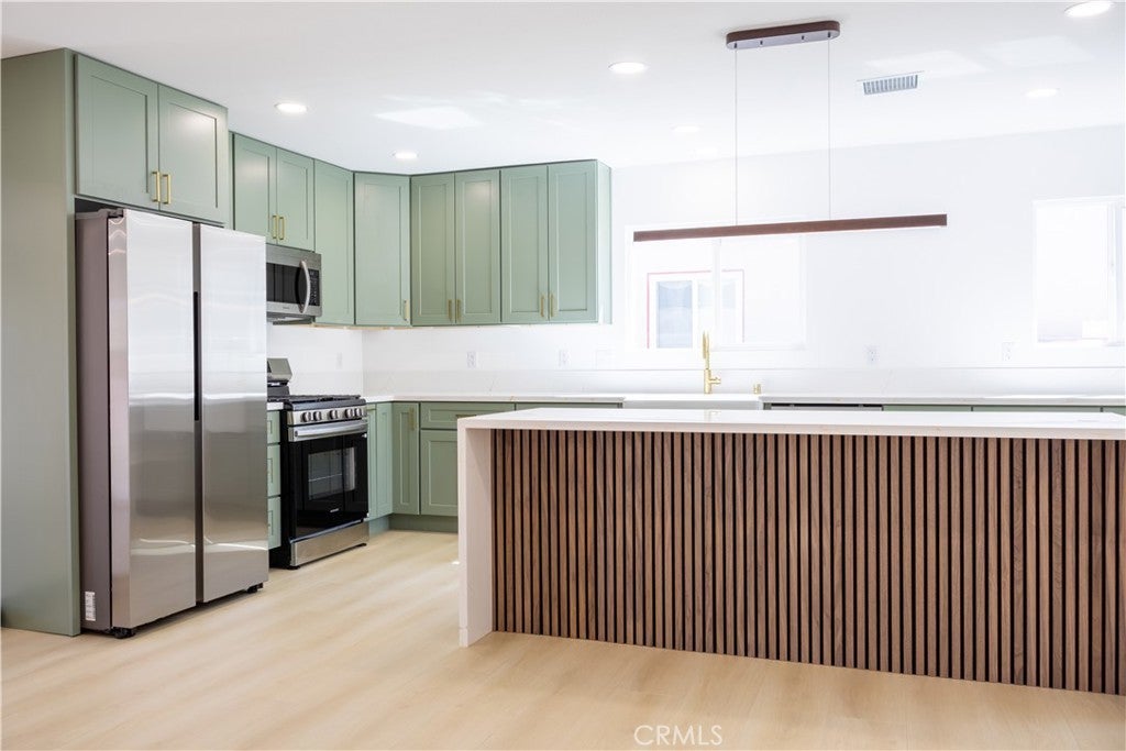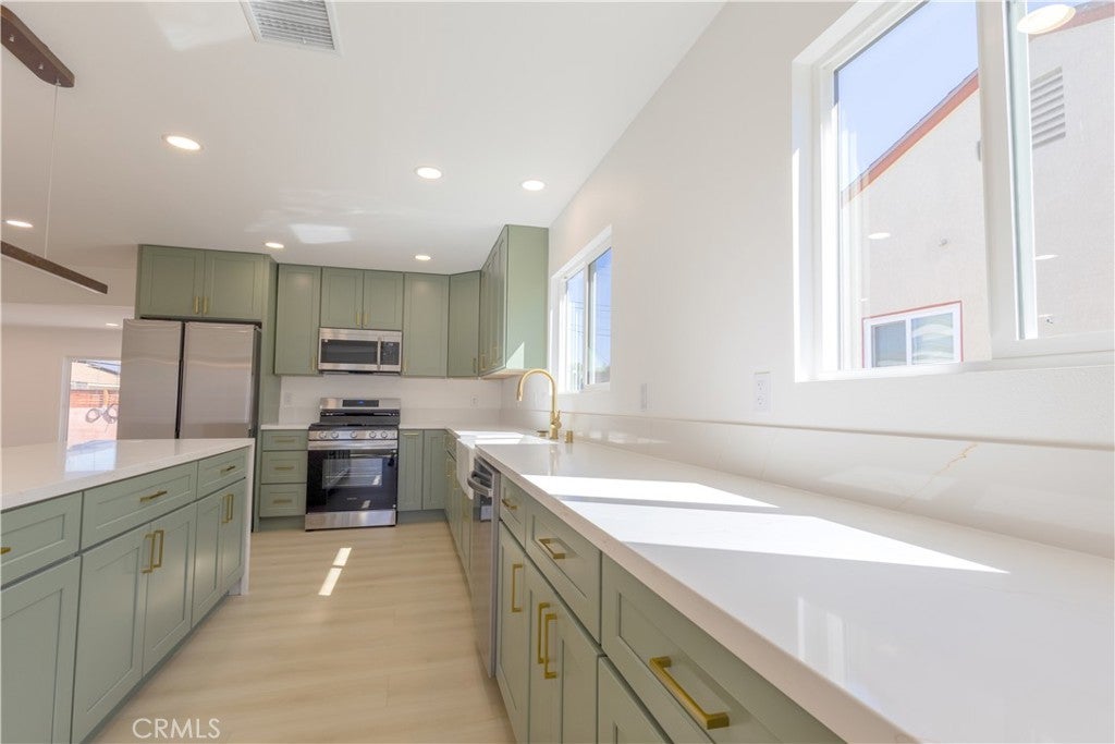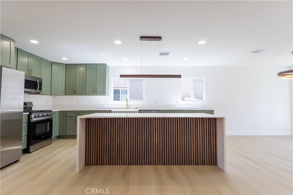 Recently renovated single-story home with PERMITS located in the desirable Lakewood Mutuals neighborhood. This house offers approximately 1,445 sq ft of living space on a 5,001 sq ft lot and features a bright open floorplan with recessed lighting throughout. The home has undergone extensive updates including a brand-new roof, Brand-new TANKLESS water heater, brand new double-pane windows, new central A/C system, and new plumbing and electrical systems following a full re-pipe and re-wire. The property has also been recently re-stuccoed and includes a new sprinkler system in both the front and rear yards, with newly planted grass seed. The remodeled kitchen features new cabinetry, a farmhouse sink, kitchen island, and waterfall-edge countertops, along with included appliances: refrigerator, microwave, gas range, and dishwasher. Designer lighting fixtures enhance the dining area and kitchen island, adding a modern touch to the open living space. The bathroom has been updated with new tile finishes, and the home includes luxury interior doors and modern lighting fixtures throughout. Washer and dryer hookups are conveniently located inside the home. Additional features include a detached 2-car garage with a sub-panel and 220-volt wiring. Double-pane windows, and central heating and cooling. The property offers both front and backyard space with an installed sprinkler system. Located within close to shopping, dining, and freeway access.