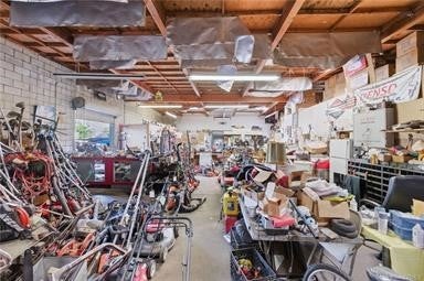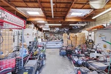 This property is ideally situated on a corner lot with great exposure. Currently being used as a lawnmower repair shop. Many possibilities for usage with plenty of parking. There is also an additional 600 Sq.Ft. garage for extra storage or expansion of the business. Gas water heater, copper pipes, kitchenet, 2 bathrooms, front and back entrances. New roof, replaced in 2022-2023. Also for lease at $3,500/month.