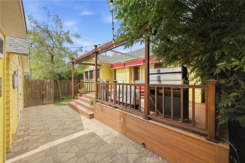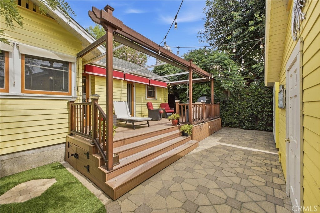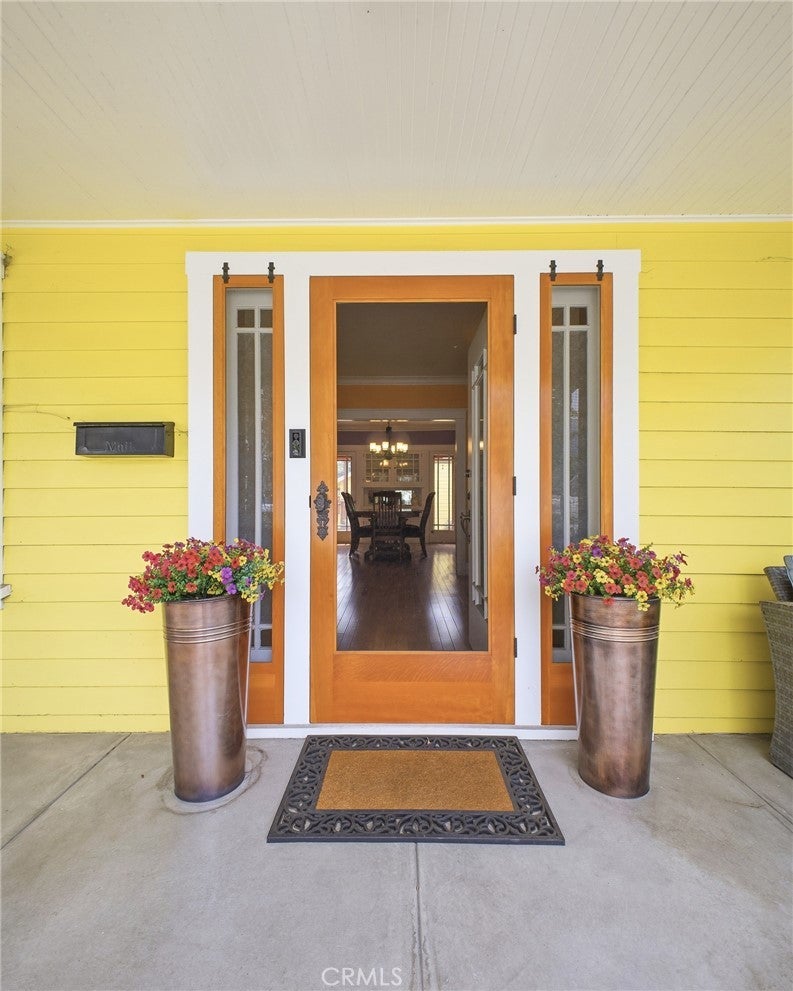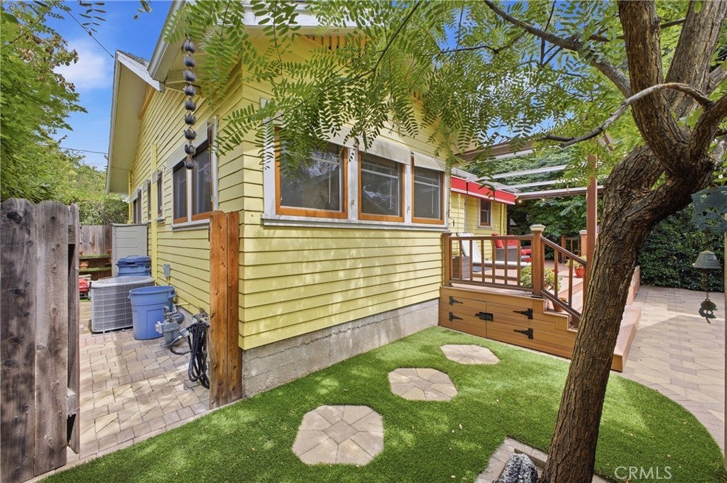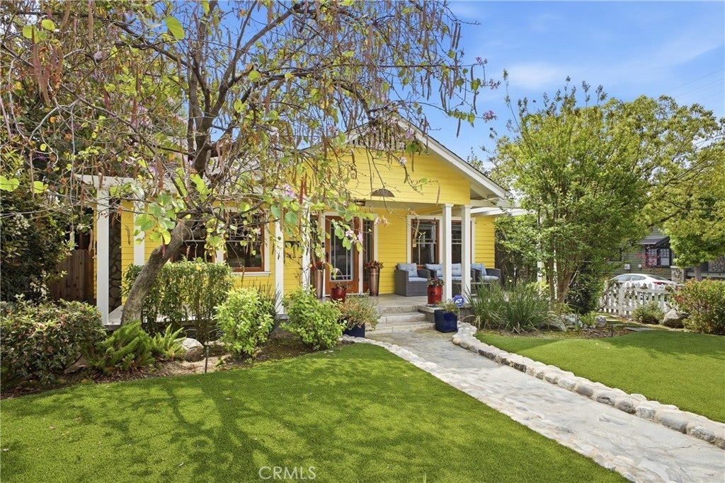 Nestled in the heart of Monrovia's famous Wildrose Avenue, this enchanting 1923 California Bungalow effortlessly blends timeless charm with modern convenience. From the picturesque white picket fence, blooming gardens and covered front porch, the home exudes classic appeal. Step through the handsome front door into a light-filled living room with hardwood floors, river rock fireplace, built-in bookshelves and vintage fixtures that create a cozy ambiance. The spacious dining room has hardwood floors, built-in hutch and dual French doors leading to an expansive wrap-around wood deck offering a warm and inviting space for gatherings. This well-appointed home has two comfortable bedrooms, each with hardwood floors, and one period-inspired bathroom. The updated kitchen includes custom cabinets, marble countertops, glass tile backsplash, under cabinet lighting, pull-out spice rack, farmhouse sink, LG stainless steel appliances and a Bosch dishwasher. Other amenities include a separate laundry room with washer and dryer, hardwood floors, wood windows, crown and door moldings, central air and heat, ceiling fans, wall sconces, recessed lighting, rain glass interior doors, glass doorknobs, copper plumbing, updated electrical system and a tankless water heater. Situated on a north facing corner lot, additional features include a one-car garage and a custom-built shed with electricity that is perfect to use as a workout room or office. This delightful residence is more than just a home, it’s part of Monrovia's architectural heritage, perfect for those seeking a blend of historic charm and comfortable living.