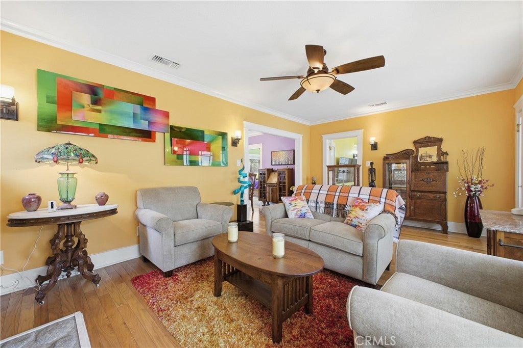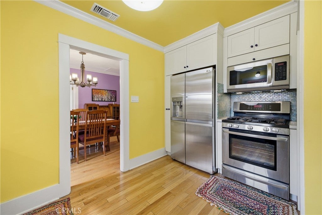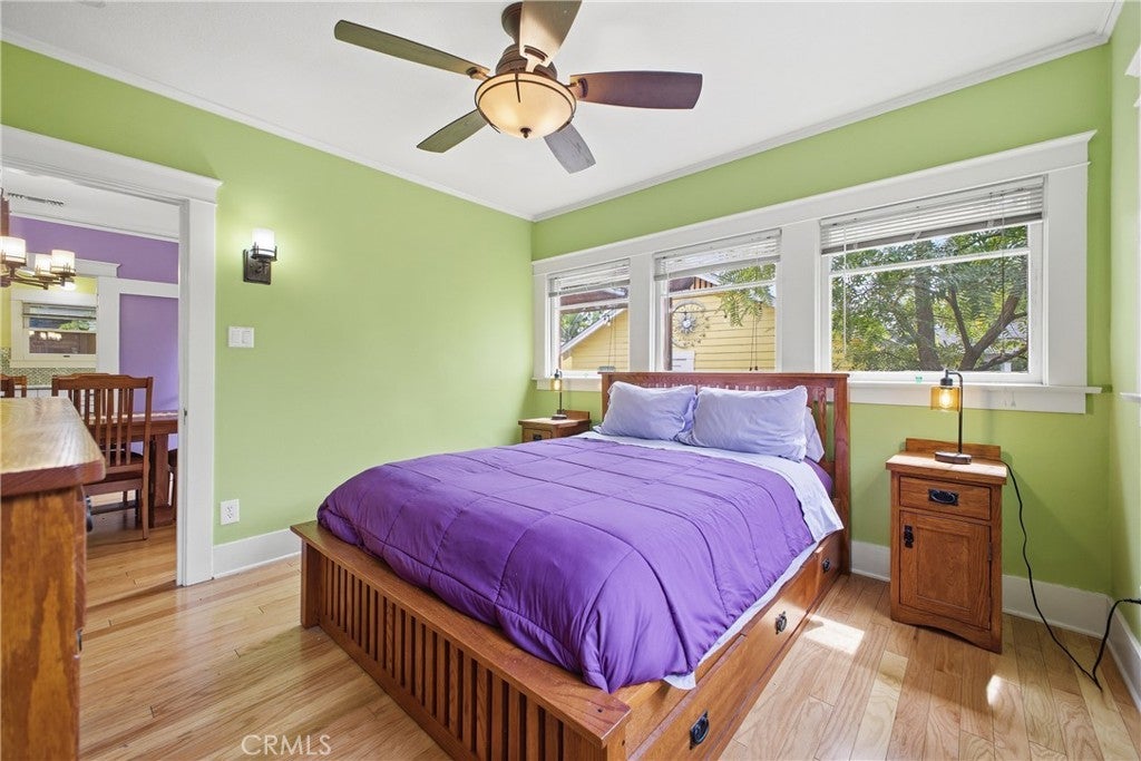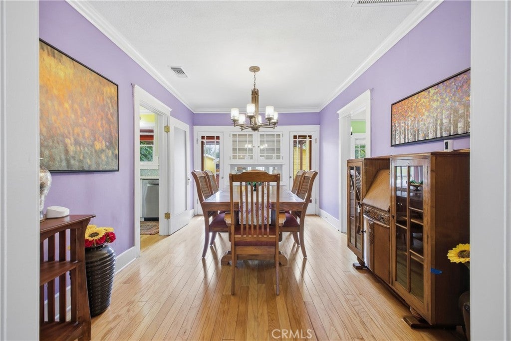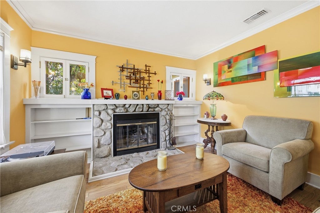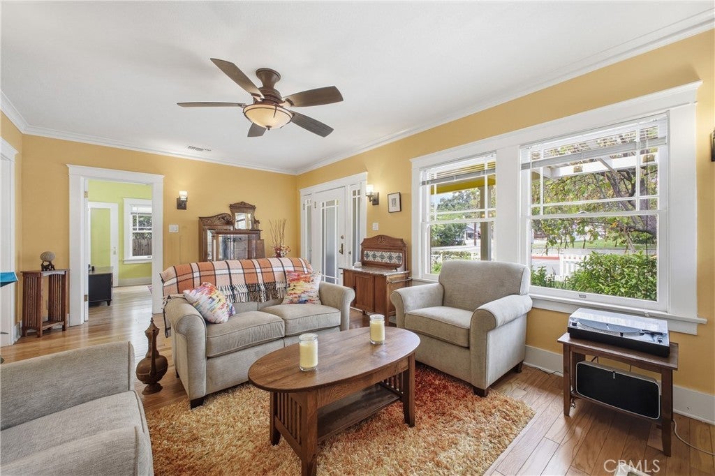 Nestled in the heart of Monrovia's famous Wildrose Avenue, this enchanting 1923 California Bungalow effortlessly blends timeless charm with modern convenience. From the picturesque white picket fence, blooming gardens and covered front porch, the home exudes classic appeal. Step through the handsome front door into a light-filled living room with hardwood floors, river rock fireplace, built-in bookshelves and vintage fixtures that create a cozy ambiance. The spacious dining room has hardwood floors, built-in hutch and dual French doors leading to an expansive wrap-around wood deck offering a warm and inviting space for gatherings. This well-appointed home has two comfortable bedrooms, each with hardwood floors, and one period-inspired bathroom. The updated kitchen includes custom cabinets, marble countertops, glass tile backsplash, under cabinet lighting, pull-out spice rack, farmhouse sink, LG stainless steel appliances and a Bosch dishwasher. Other amenities include a separate laundry room with washer and dryer, hardwood floors, wood windows, crown and door moldings, central air and heat, ceiling fans, wall sconces, recessed lighting, rain glass interior doors, glass doorknobs, copper plumbing, updated electrical system and a tankless water heater. Situated on a north facing corner lot, additional features include a one-car garage and a custom-built shed with electricity that is perfect to use as a workout room or office. This delightful residence is more than just a home, it’s part of Monrovia's architectural heritage, perfect for those seeking a blend of historic charm and comfortable living.