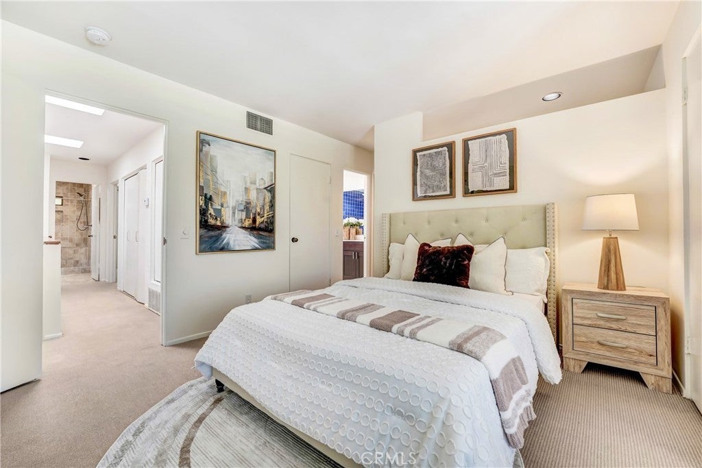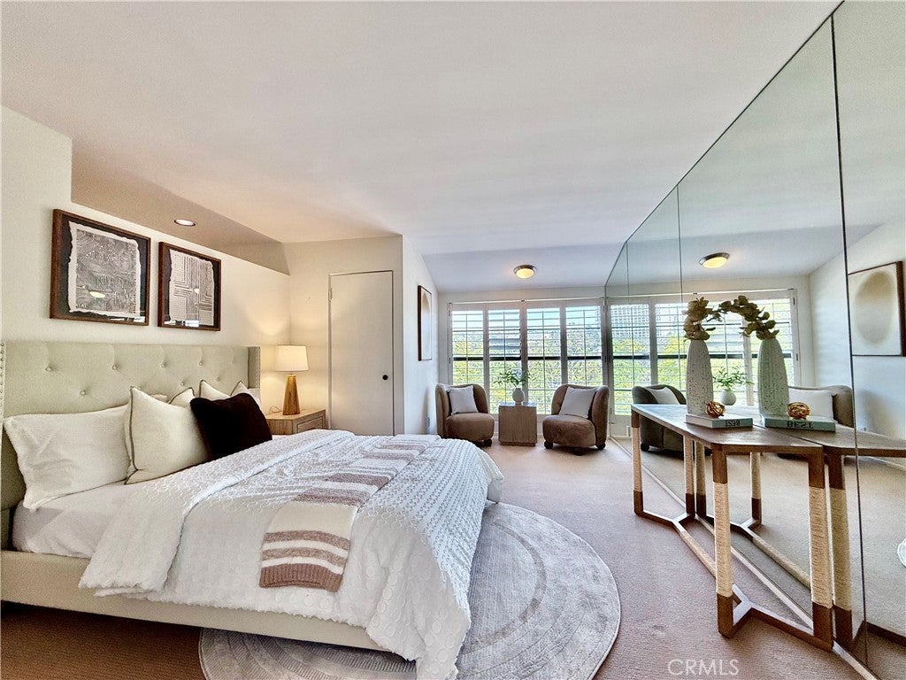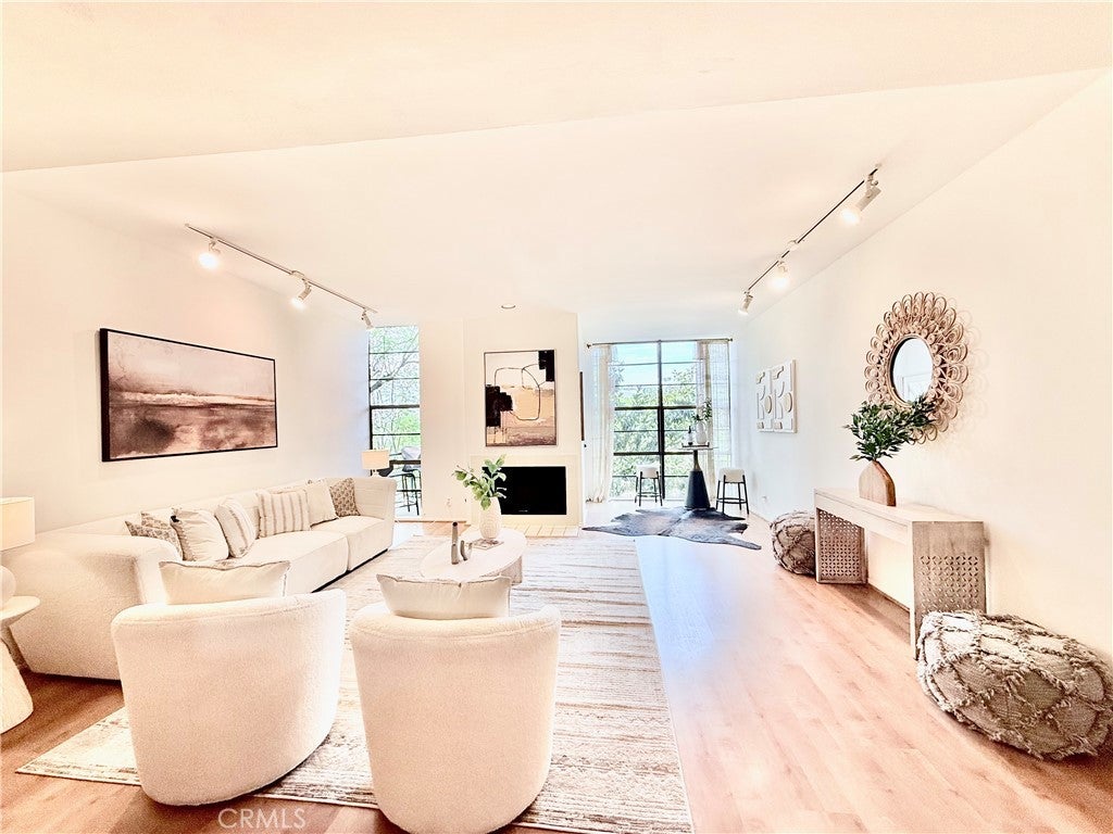 Private end-unit in a gated community, this rare Mid-Century Modern architectural condominium designed by esteemed architect Lorenzo Tedesco offers two stories of glass, nine-foot ceilings, a new central HVAC system, and sweeping views in the Hollywood Hills bordering Studio City. Spanning 1,429 sq ft, the stylish two-level home features an open floor plan with a spacious living room, fireplace, private balcony, and powder room, while the upper level includes a view-filled primary suite with a large closet and en-suite bath, a second bedroom, full bath, in-unit laundry, and an outdoor seating area. Thoughtfully designed with functional, timeless elements throughout, the unit also includes two assigned side-by-side parking spaces in the community garage and is ideally located near Universal Studios, dining, entertainment, and major freeways for easy access to the studios, the Valley, and all of Los Angeles. HOA dues include earthquake and fire insurance, reserves, pool, water, hot water, sewer, trash, landscaping, termite clearance, and more, making this a rare opportunity to own a true piece of Los Angeles Mid-Century Modern architecture at an exceptional value.