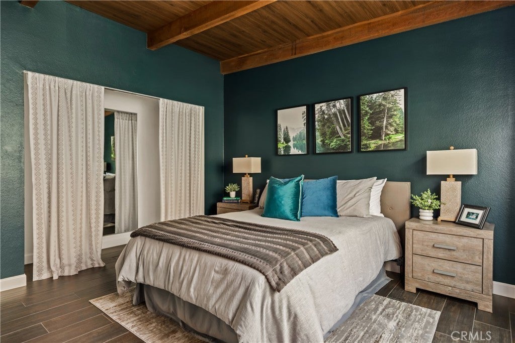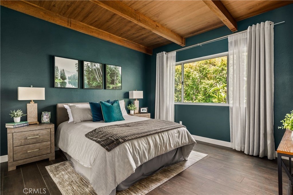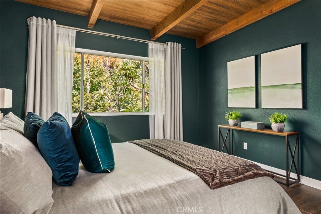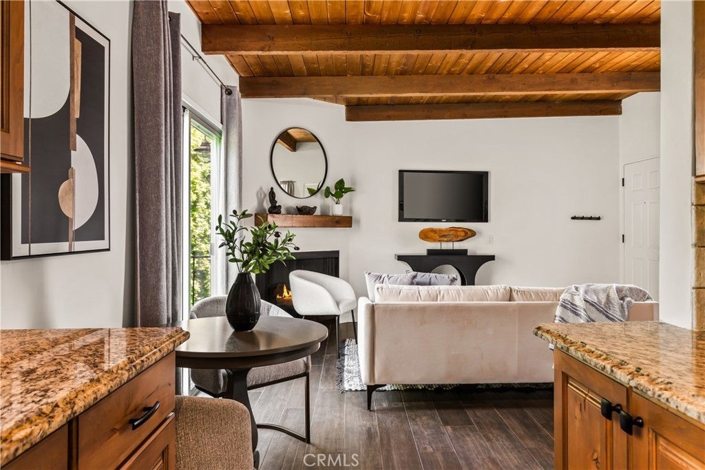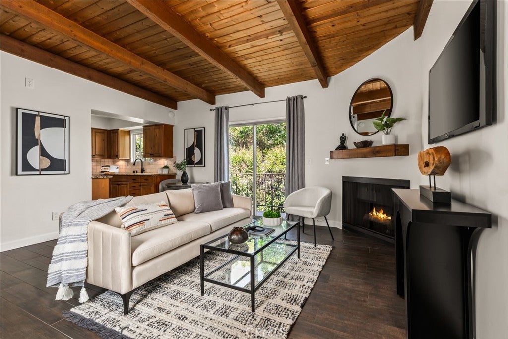 As you enter the unit, you're immediately welcomed by an open-concept living and dining area, warmed by a charming fireplace in the living room. Come home to relax in a space featuring wood-like floors and beam-accented ceilings. Step onto the adorable balcony—perfect for letting in a refreshing cross breeze.The beautiful kitchen boasts stone countertops, a terracotta tile backsplash, an over-the-range microwave, and generous counter space on either side of the stove—an ideal setup to flex your culinary muscles for family and friends.As you move past the kitchen, you'll find an ample linen closet and a laundry closet with space for a side-by-side washer and dryer. To your right, just before the bedroom, is a grand bathroom featuring a stone countertop vanity with abundant counter space and an exquisite tile-walled shower-tub combo.At the end of the hallway, the spacious bedroom awaits, complete with a large closet. All of this, plus access to a pool and located just a few blocks from Ventura Blvd and everything it has to offer.
