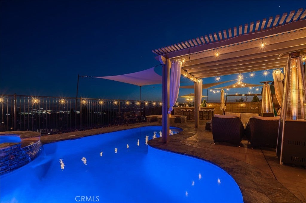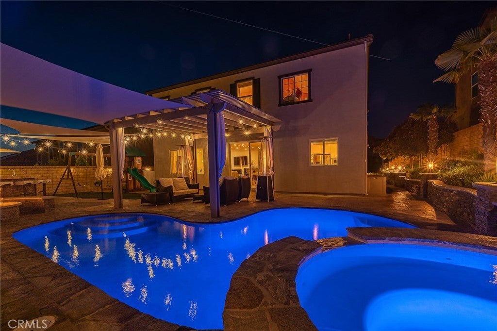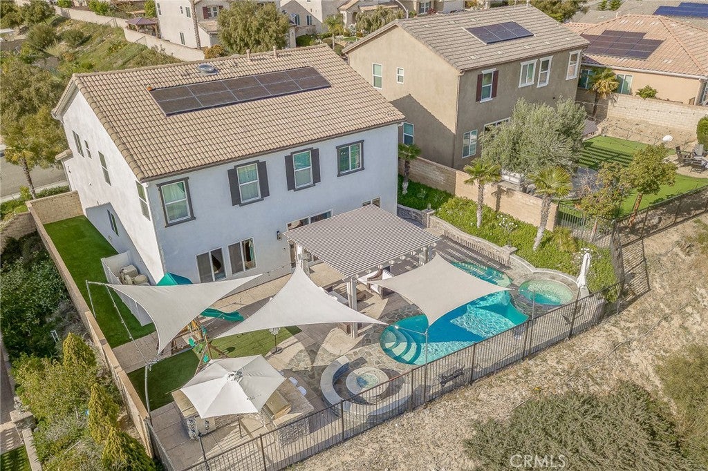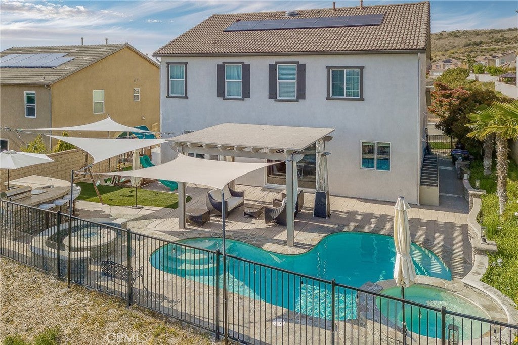 Welcome to 20256 Dorothy Street, a resort-style view home in the heart of Saugus, Santa Clarita. This former model residence has been meticulously upgraded and thoughtfully designed to deliver modern comfort, timeless style, and ultimate functionality. Every corner reflects true pride of ownership, offering a lifestyle that feels like a year-round vacation. Step inside and you’ll be greeted by an open-concept layout flooded with natural light. Expansive windows draw your eyes to the backyard paradise, where a custom pool and spa create the centerpiece of an entertainer’s dream. Cascading waterfalls, color-changing lights, and smartphone-integrated controls bring luxury resort living right to your own home. Multiple seating areas, a fire pit, and an outdoor kitchen with built-in BBQ, sink, and refrigerator make entertaining effortless. The side yard provides versatility, with space for a dog run or play area, and currently includes a removable playground. From this private perch, you’ll even enjoy breathtaking fireworks and sweeping valley views. Inside, the first floor features a desirable guest suite with walk-in closet and full bathroom, perfect for extended stays or multi-generational living. The chef’s kitchen offers granite counters, stainless steel appliances, double ovens, a large island, and abundant cabinetry, plus a walk-in pantry for storage. The dining and living spaces connect seamlessly for gatherings, while the oversized laundry room and partially converted garage—currently a bonus music studio or home office—add flexibility to the floor plan. Upstairs, the primary suite is a retreat of its own, complete with a private seating area, custom walk-in closet, and spa-like bathroom featuring dual vanities, a soaking tub, and walk-in shower. Three additional bedrooms and a full bath complete the level, including one enclosed loft now serving as a fifth bedroom. Skylights and upgrades throughout add warmth and charm. Additional highlights include 9-foot ceilings, dual-zone AC, paid-off solar, plantation shutters, EV charger, built-in security system with cameras, and a finished attic with pull-down ladder. Set on a rare 9,684 sq ft lot with no front or rear neighbors, the home enjoys privacy, natural light from sunrise to sunset, and easy access to the growing Skyline Ranch Plaza with dining, shopping, and more. Turnkey and move-in ready, this property offers more than just a home—it’s a lifestyle.