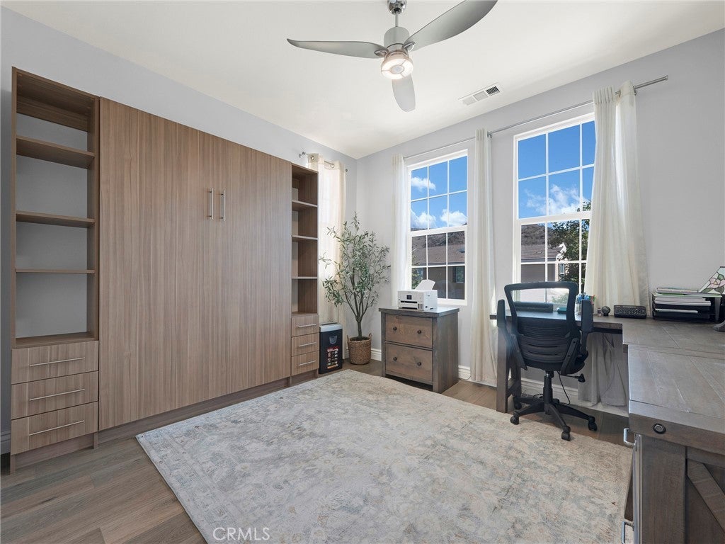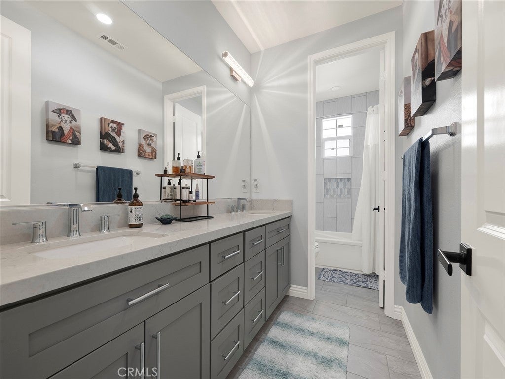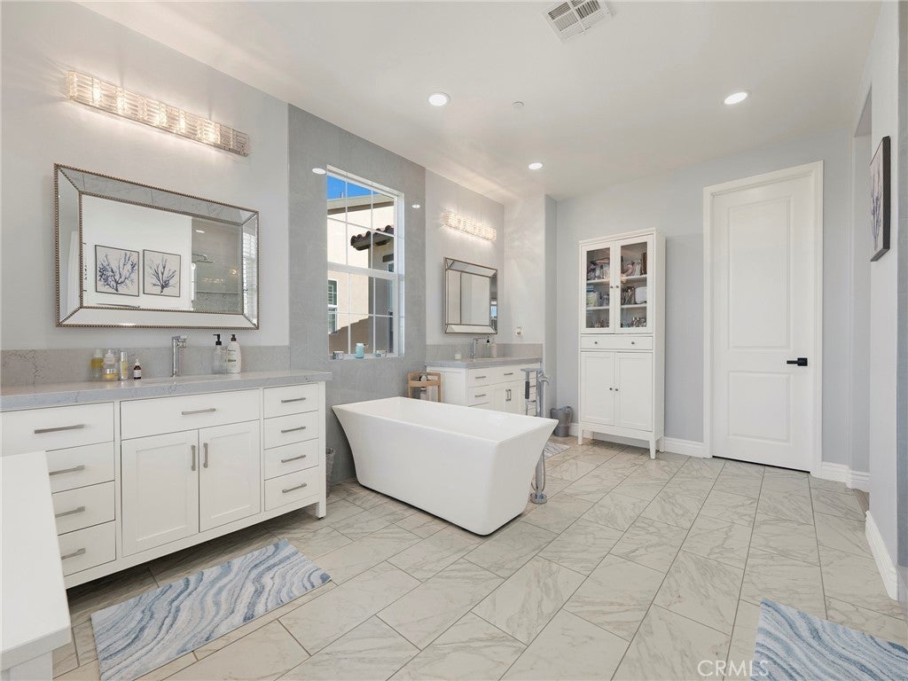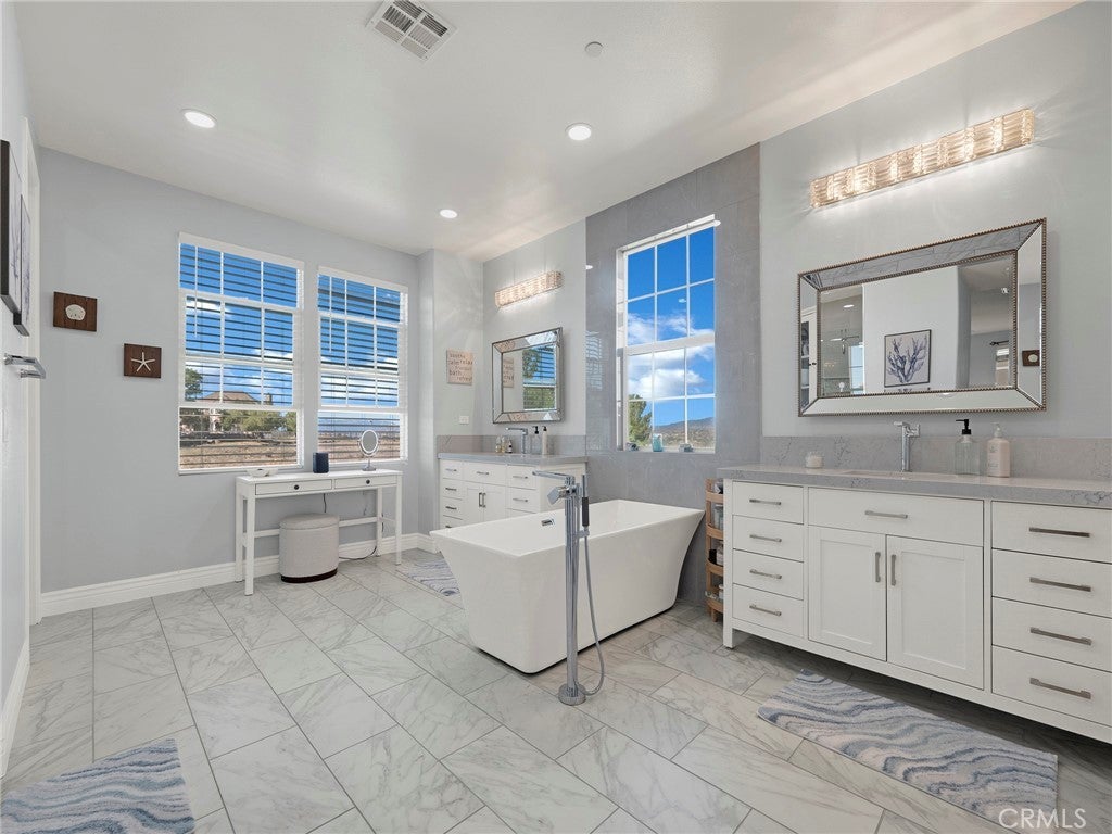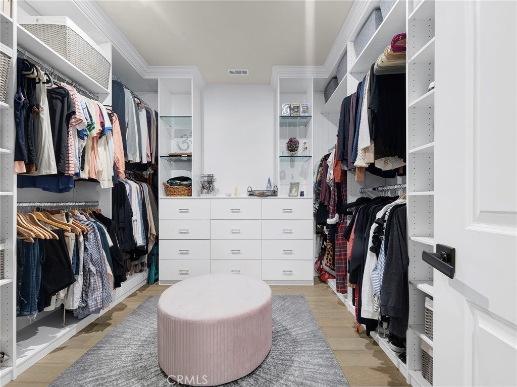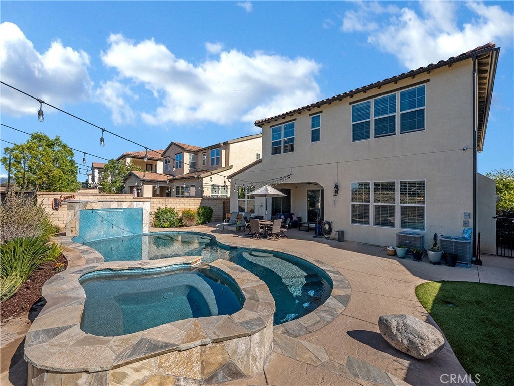 Prepare to be captivated by this stunning, customized residence nestled within the prestigious, guard-gated community of The Heights in Five Knolls. You will feel the designer luxury the moment you enter, with soaring ten-foot ceilings and abundant natural light illuminating the French oak engineered floors throughout the first level. This spacious home offers five flexible bedrooms, including the convenience of a potential downstairs primary suite. The gourmet kitchen is a chef's dream, showcasing exquisite Cambria stone countertops and backsplash, a professional Sub-Zero refrigerator, a wine fridge, and a custom-enlarged center island. Upstairs, the lavish primary suite is a true spa-like sanctuary, complete with a soaking tub, walk-in shower with bench, and a beautifully designed custom closet system. An airy loft provides versatile secondary living space, and the home is equipped with impressive features like fully-paid solar power, separate dual-floor AC, tankless water heaters, and a Rayne whole-house water filtration system. Step outside to your private oasis featuring a beautiful pool and spa with Baja shelves and built-in stools. A dog run and 3 car garage are also coveted features. As an added benefit, the community offers a luxurious clubhouse with a large pool, spa, and a dedicated dog-friendly park. This custom home is the pinnacle of turnkey Santa Clarita luxury.