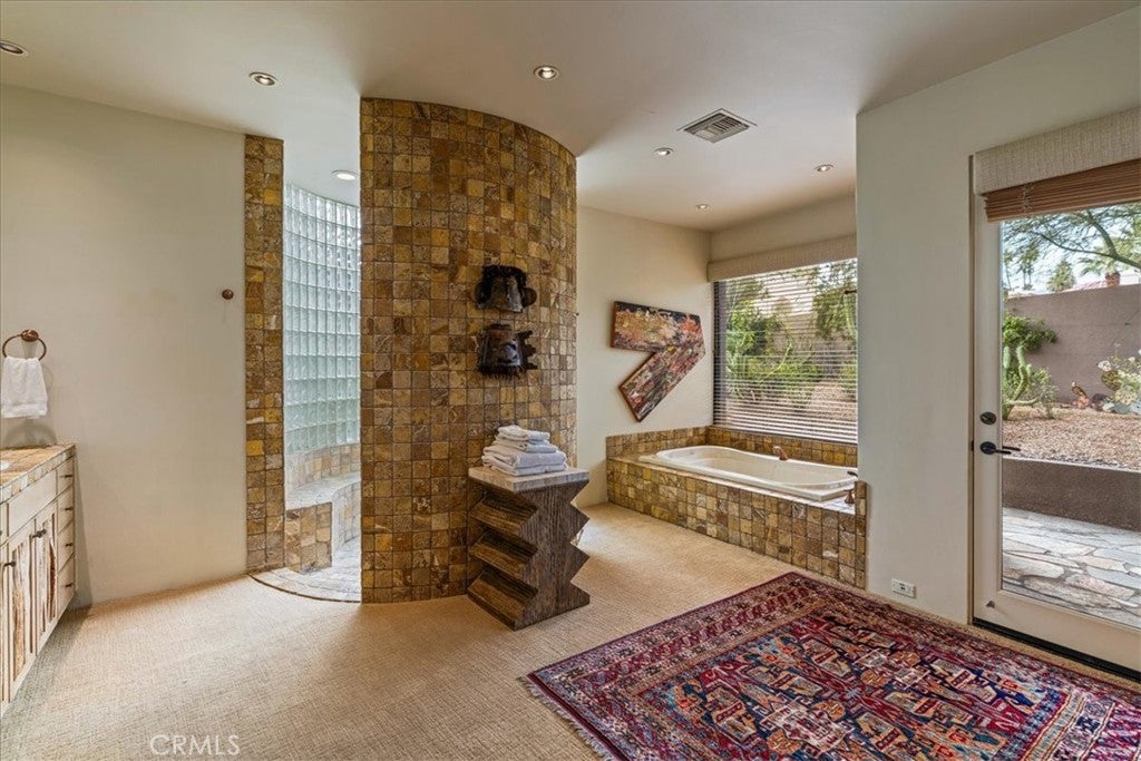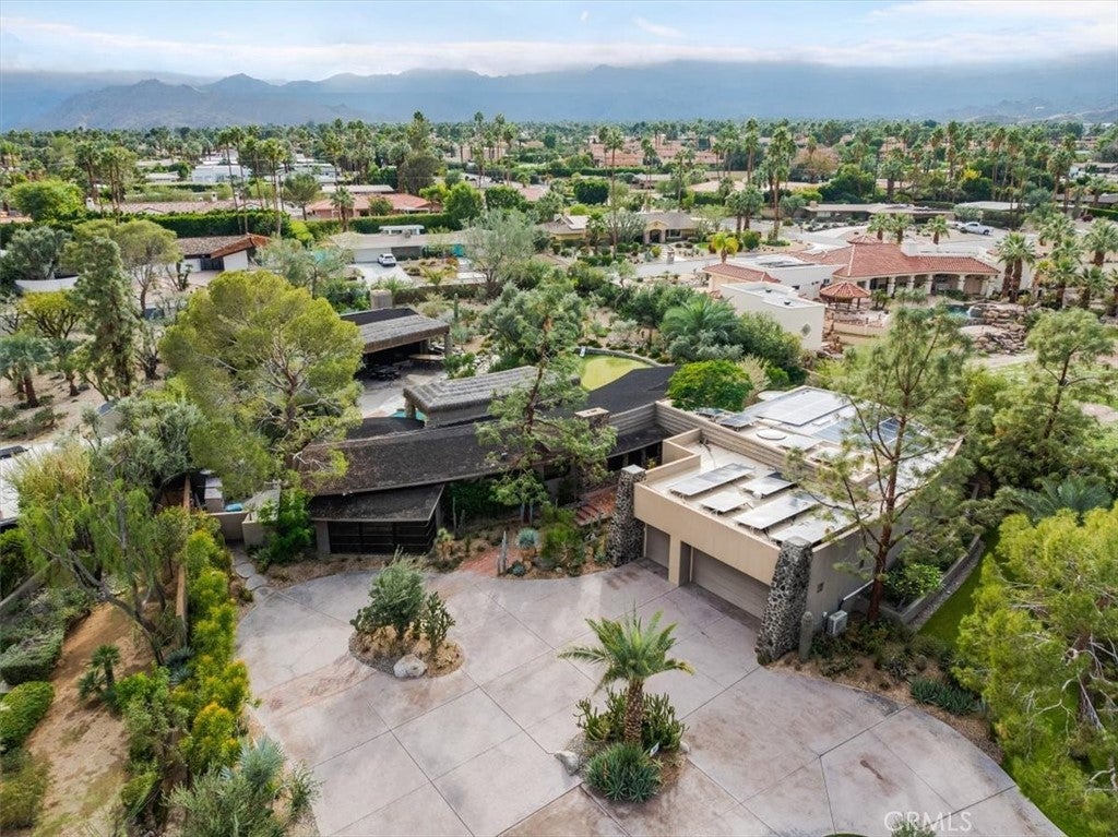 Located within close proximity of iconic El Paseo, this rare Albert Frey–designed mid-century modern estate is a timeless expression of desert architecture. Built in 1950 and set on nearly one acre, the property reflects the design legacy that defines the Palm Springs area as a global destination for mid-century modern living. A striking circular motor court welcomes you to this south-facing residence, offering approximately 4,587 sq. ft. with 3 bedrooms, 3.5 baths, separate guest house and three-car finished garage. Every room is oriented to capture sweeping views of the desert landscape, mountains, and resort-style grounds. Walls of accordion glass doors create seamless indoor-outdoor flow to the pool, spa, multiple patios, and private pitch-and-putt green—ideal for entertaining under the desert sky. The living room features vaulted ceilings and opens to the dining area and chef’s kitchen with generous counter space, stainless steel appliances, recessed lighting, and breakfast bar. A separate family room provides additional space to relax and gather. Amenities include HVAC, a custom, climate-controlled wine room for over 1,000 bottles. The primary suite offers a fireplace, tranquil outdoor lounge, soaking tub, dual vanities, dual-entry shower, and expansive walk-in closet. The guest house is a private retreat with full kitchen, fireplace, great room, bedroom, and bath. Owned solar system. Offered furnished. A rare opportunity to own a true architectural estate in one of Palm Desert’s most sought-after locations.