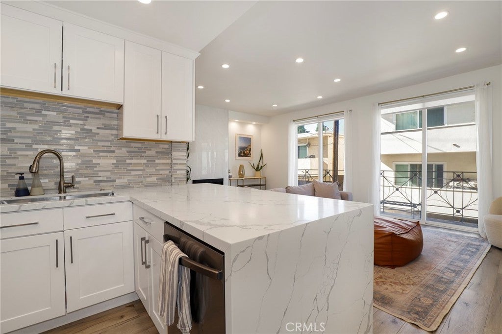 Welcome home to 11723 Goshen Ave #103!! This beautifully remodeled and freshly painted condo is a rare gem of an opportunity. Located in a prime Brentwood location, this 3-bedroom and 2-bathroom sports a fresh open concept floor plan, with newer flooring, windows, and a highly must have of an in unit laundry, all set inside an airy 1370 square feet of serene living space. Adjacent to the foyer is the spacious bathroom, fitted with dual sinks and a shower/tub combination, and two main bedrooms with recessed lighting, large windows that let you soak in natural sunlight, and built-in closet storage with mirrored sliding doors. The kitchen is a sight to behold, featuring stainless steel appliances, glossy quartz countertops, a beautiful tile backsplash, and a roomy breakfast bar that opens into an expansive living room and an intimate dining room. A cozy fireplace ties it all in, and the large private balcony off the living room creates an entertainer's dream space. Walk into your spacious primary bedroom with ensuite bathroom and enjoy your fortress of solitude and serenity. Welcome home to 11723 Goshen #103.