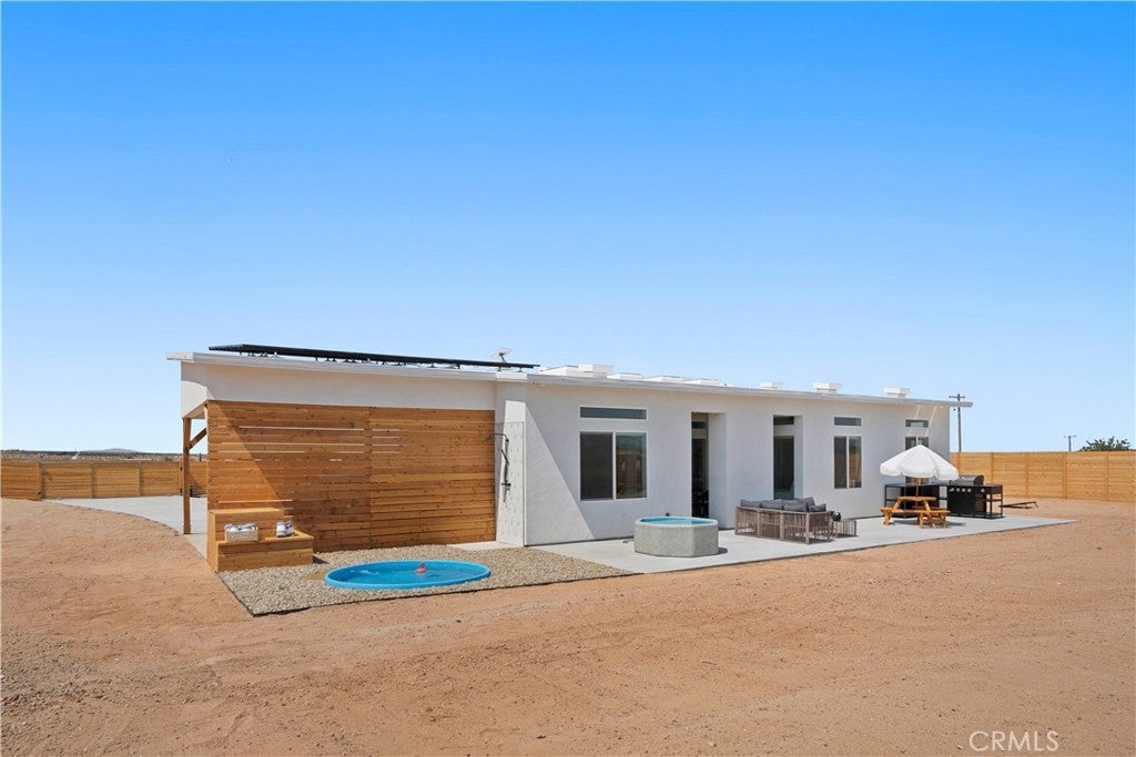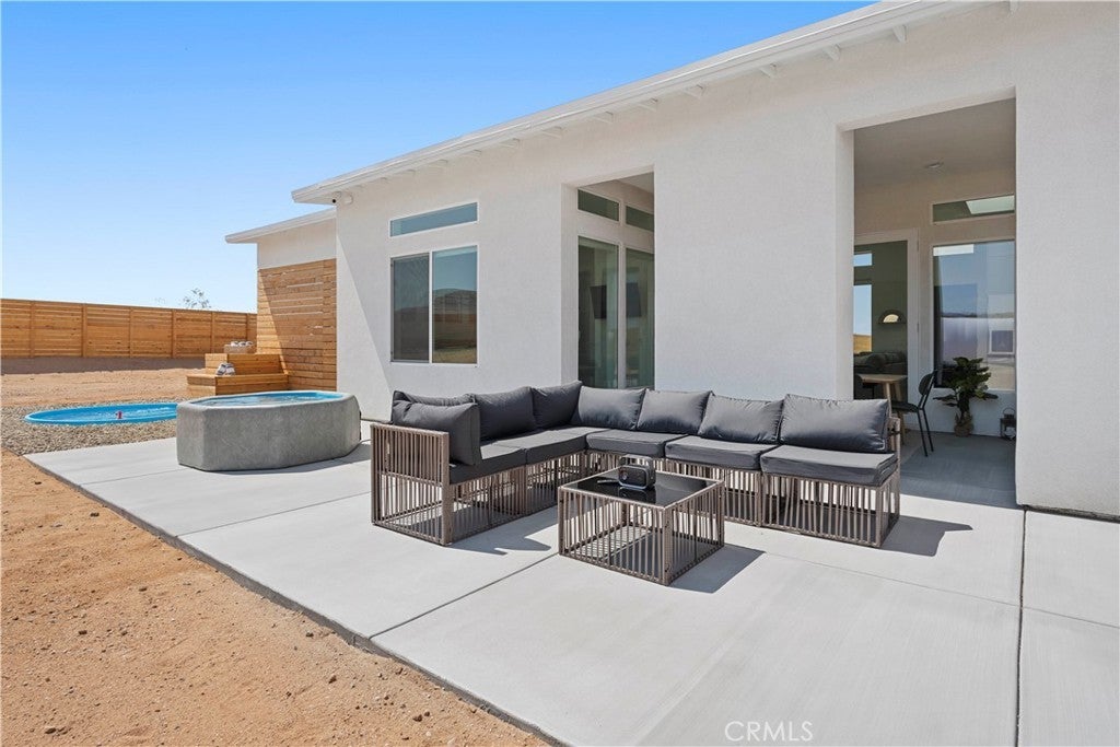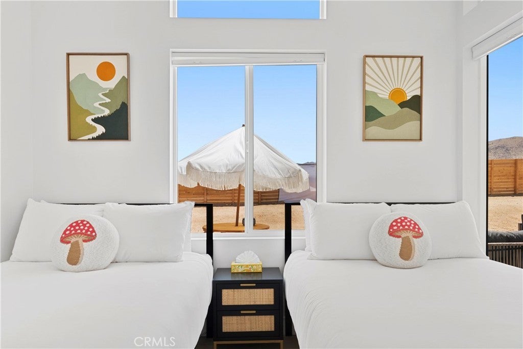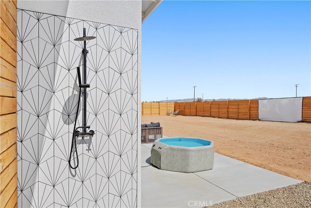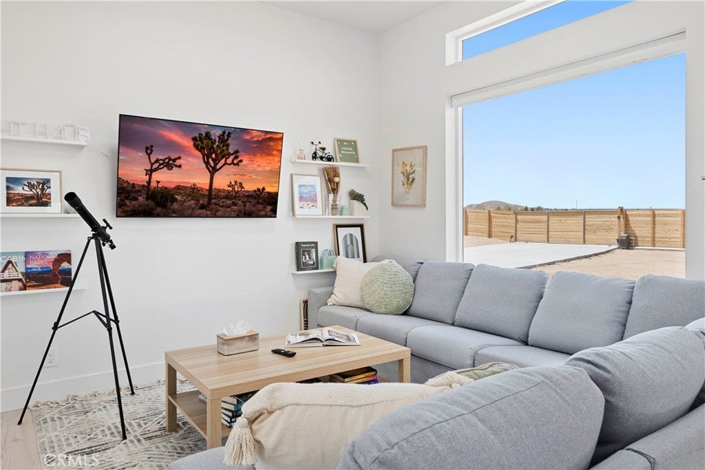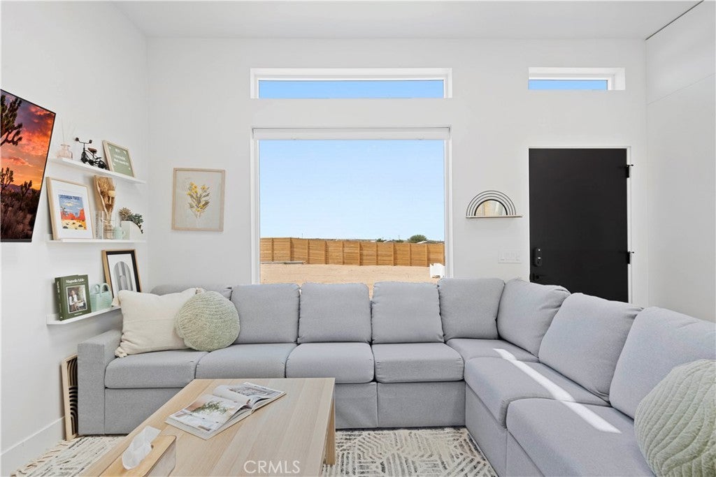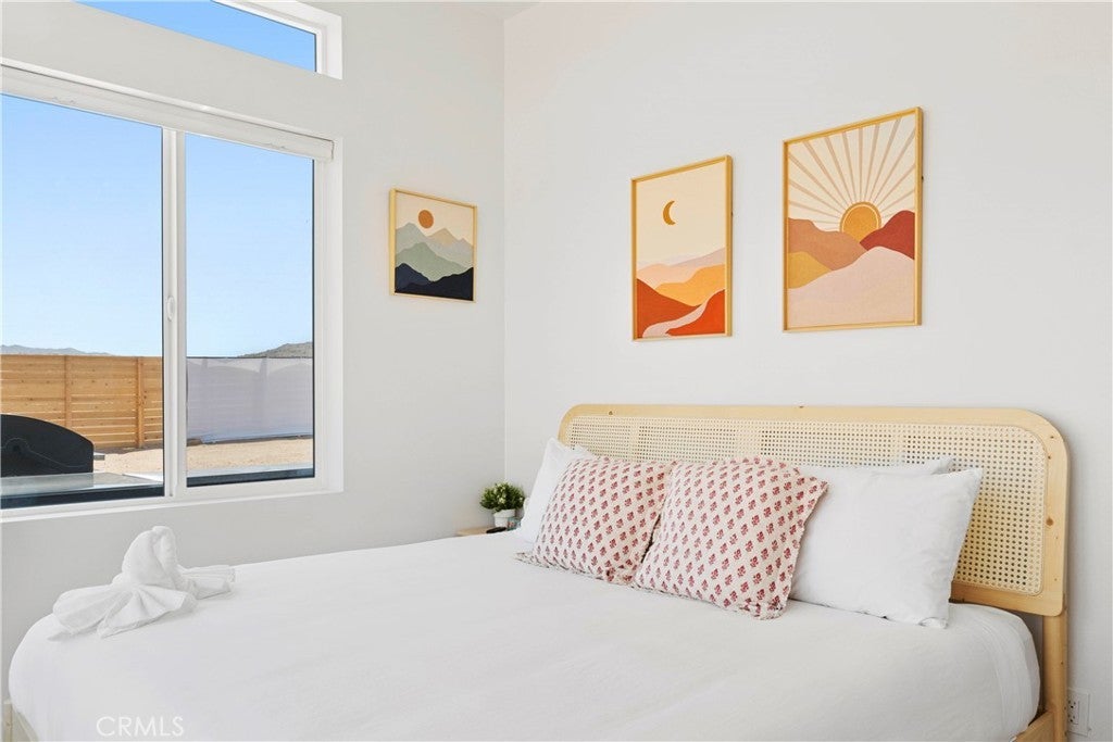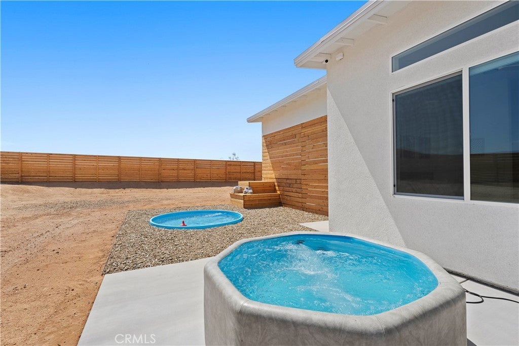 Architect-designed contemporary residence built in 2024, with custom detail throughout. The home features 10-foot ceilings, expansive windows, skylights, and an open floor plan. Interior living space totals 1,043 sq ft, complemented by a California room offering over 110 sq ft of indoor/outdoor dining and living space with an electric fireplace. Set on 2.5 acres, the property provides a rare sense of openness, with approximately one-third enclosed by 6-foot-high fencing for privacy. An automatic gate opens to a concrete driveway leading to an attached carport. Interior finishes include recessed lighting, linear air distribution, and a custom entertainment wall with floating shelving. The kitchen is designed for both function and aesthetics, featuring new stainless steel appliances, a 12-foot peninsula with breakfast bar seating, custom cabinetry extending to the ceiling, open shelving, a vent hood, and tiled accent walls. The home offers generously sized bathrooms with a modern aesthetic, including tile extending to the ceiling and 8-foot glass shower enclosures. The primary suite includes a large private bath with a round soaking tub, glass-enclosed shower with black wall-mounted shower fixtures, ceiling-height tile, and a dual-basin vanity. Bedrooms feature large windows with privacy shades. Additional amenities include a photovoltaic solar system with 15 panels and a Tesla battery capable of powering the home during electrical outages. Exterior features include a concrete patio, an in-ground stock tank pool with a full filtration system discreetly housed beneath a custom wooden bench, and an outdoor rain-style shower. Located in the Hidden River neighborhood, known for architecturally distinctive homes, with convenient access to restaurants, cafés, the farmers market, and Joshua Tree National Park. Property is partially occupied. Please do not disturb occupants.